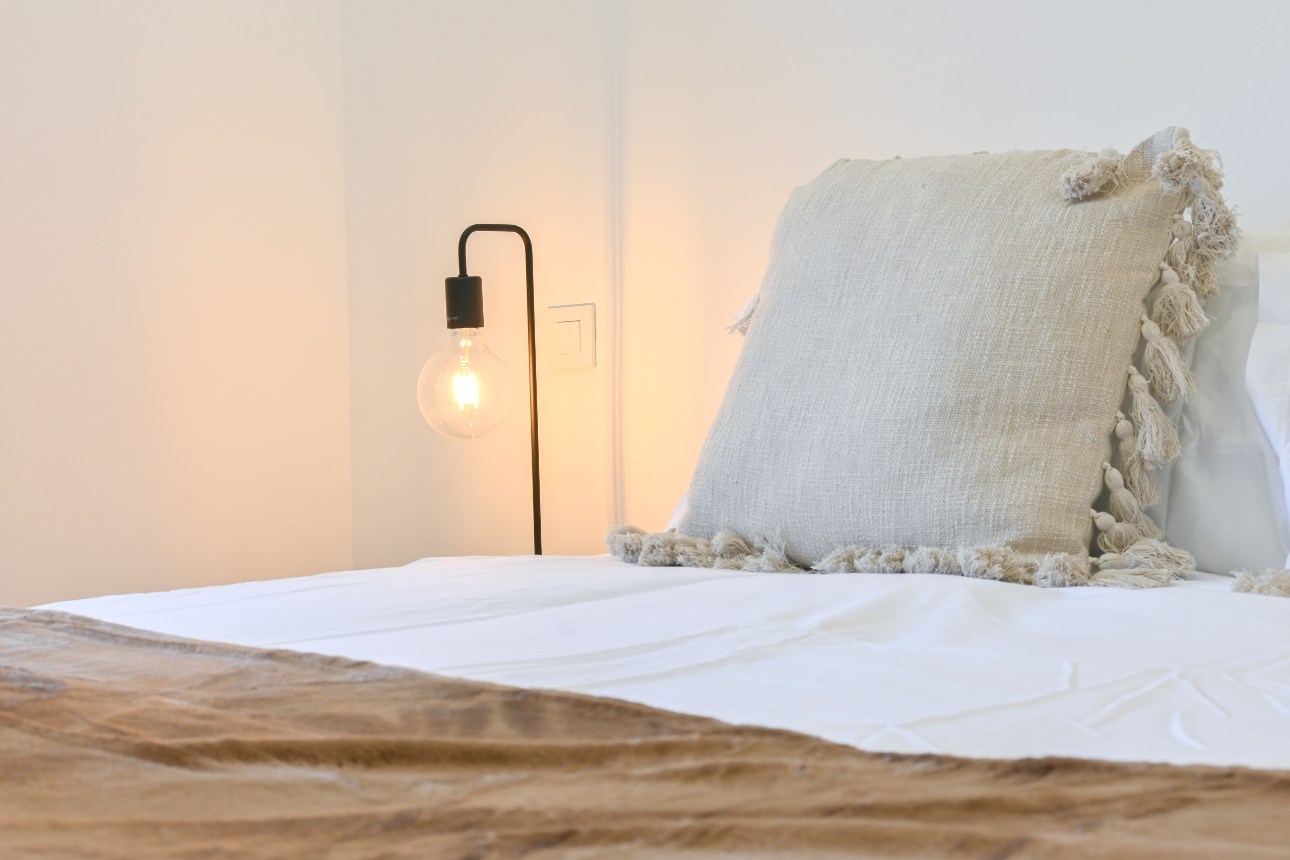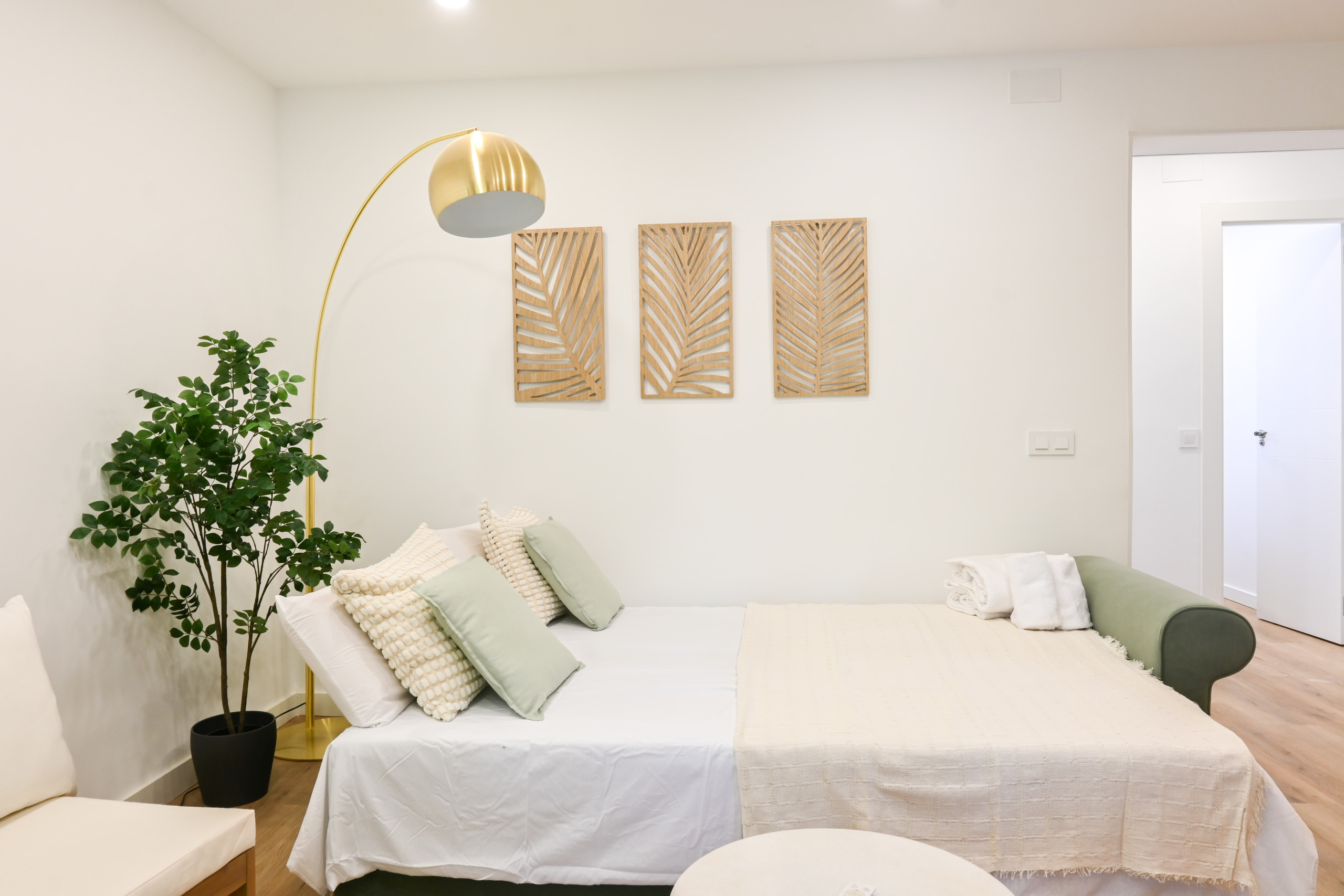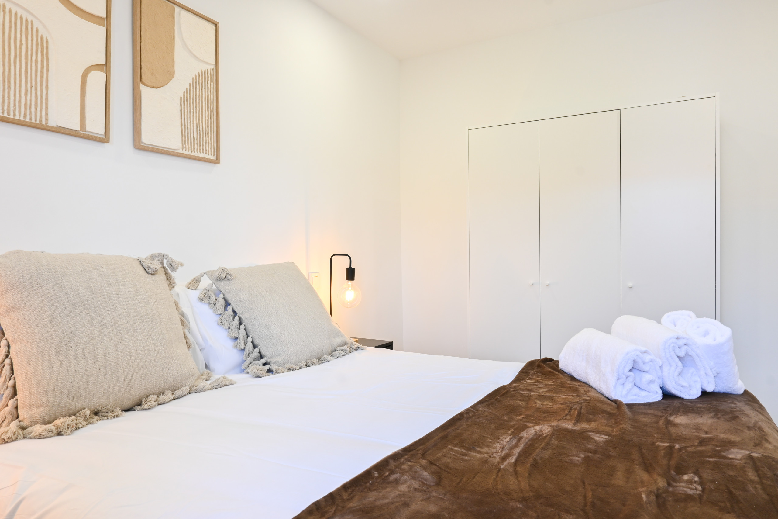 La vivienda cuenta con dos dormitorios, ambos con camas dobles. Estos espacios están decorados con buen gusto, utilizando colores cálidos y textiles de calidad que aportan un toque de elegancia. Cada dormitorio tiene armarios empotrados, proporcionando amplio espacio para guardar ropa y otros objetos personales.