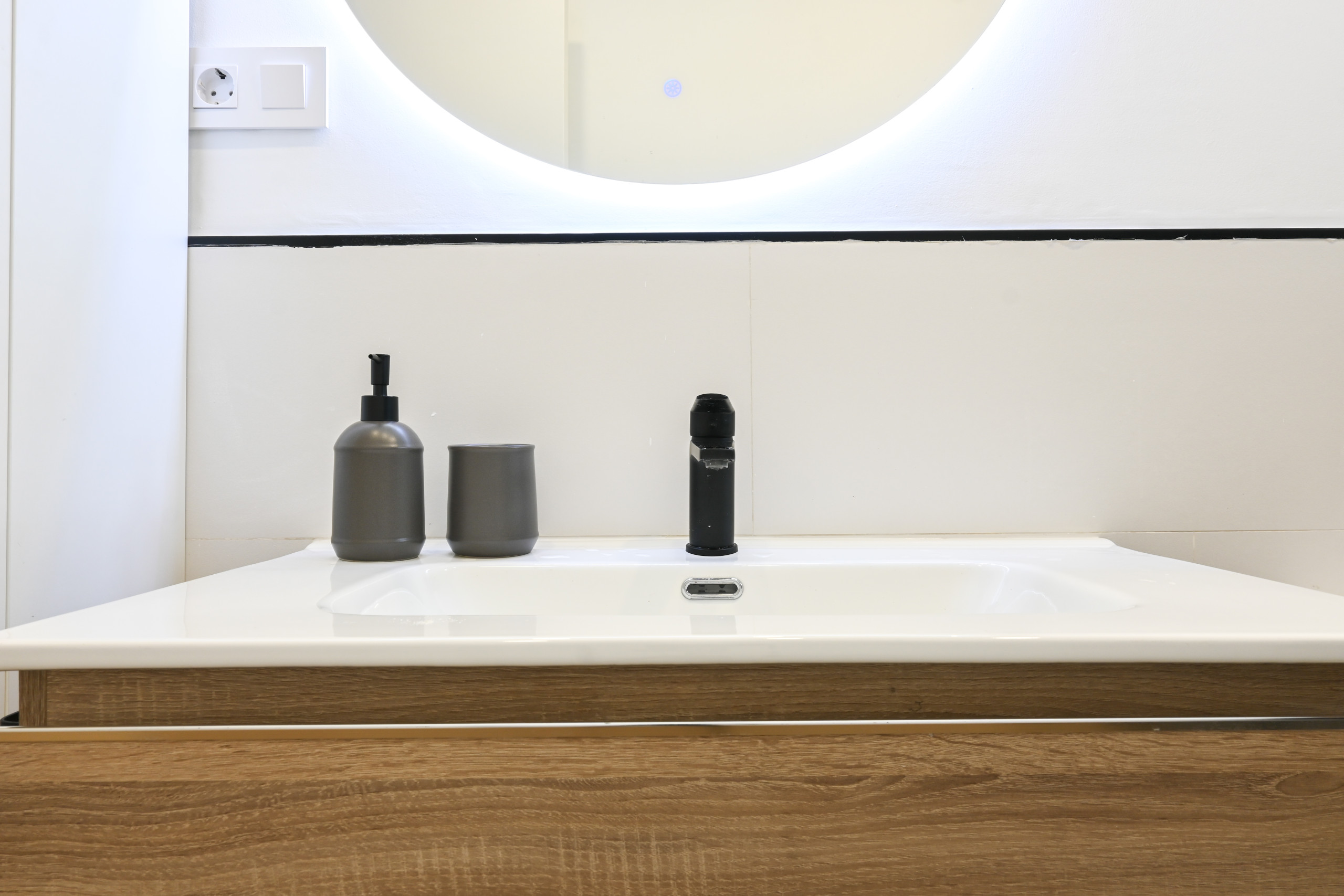 El baño incluye un plato de ducha y accesorios, mampara de vidrio y un lavabo con almacenamiento. El diseño es funcional pero atractivo, con detalles modernos que elevan la experiencia diaria.