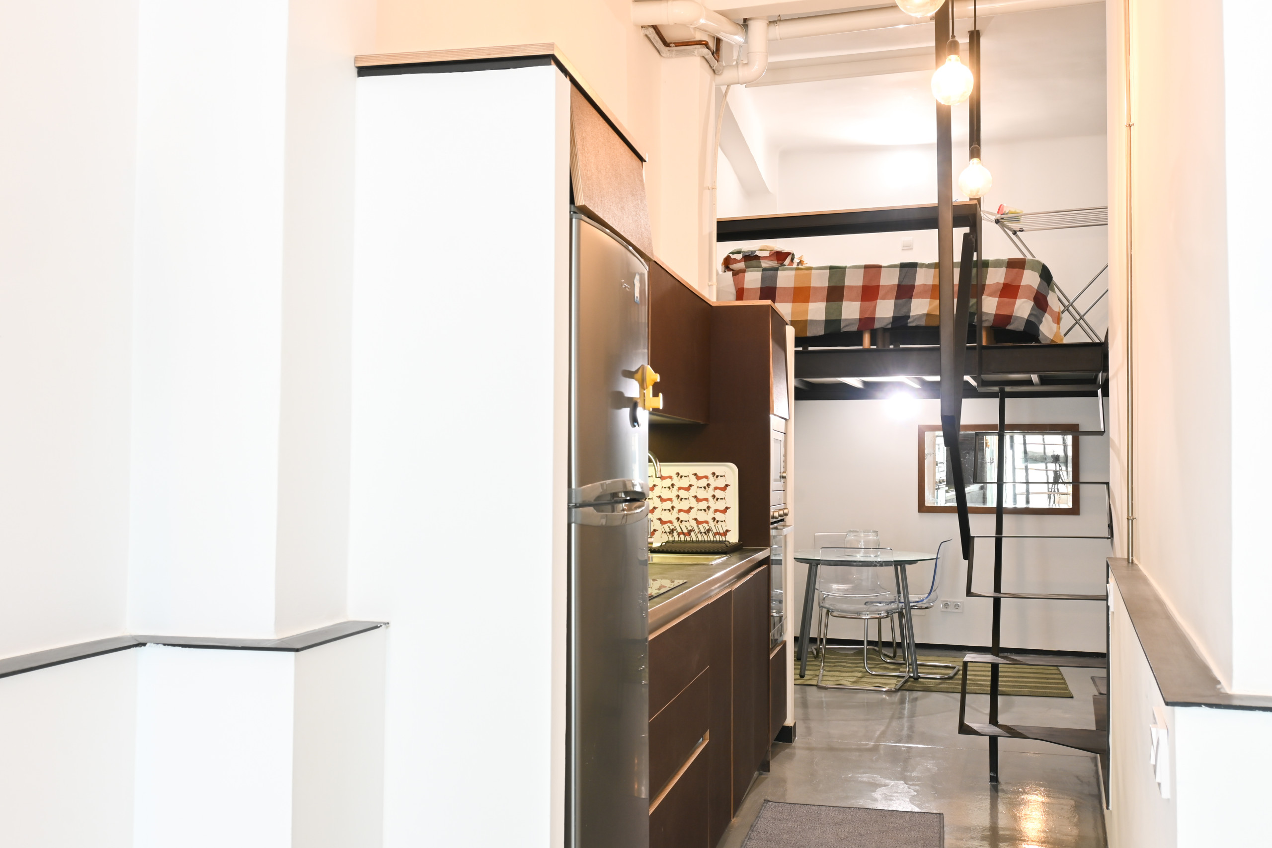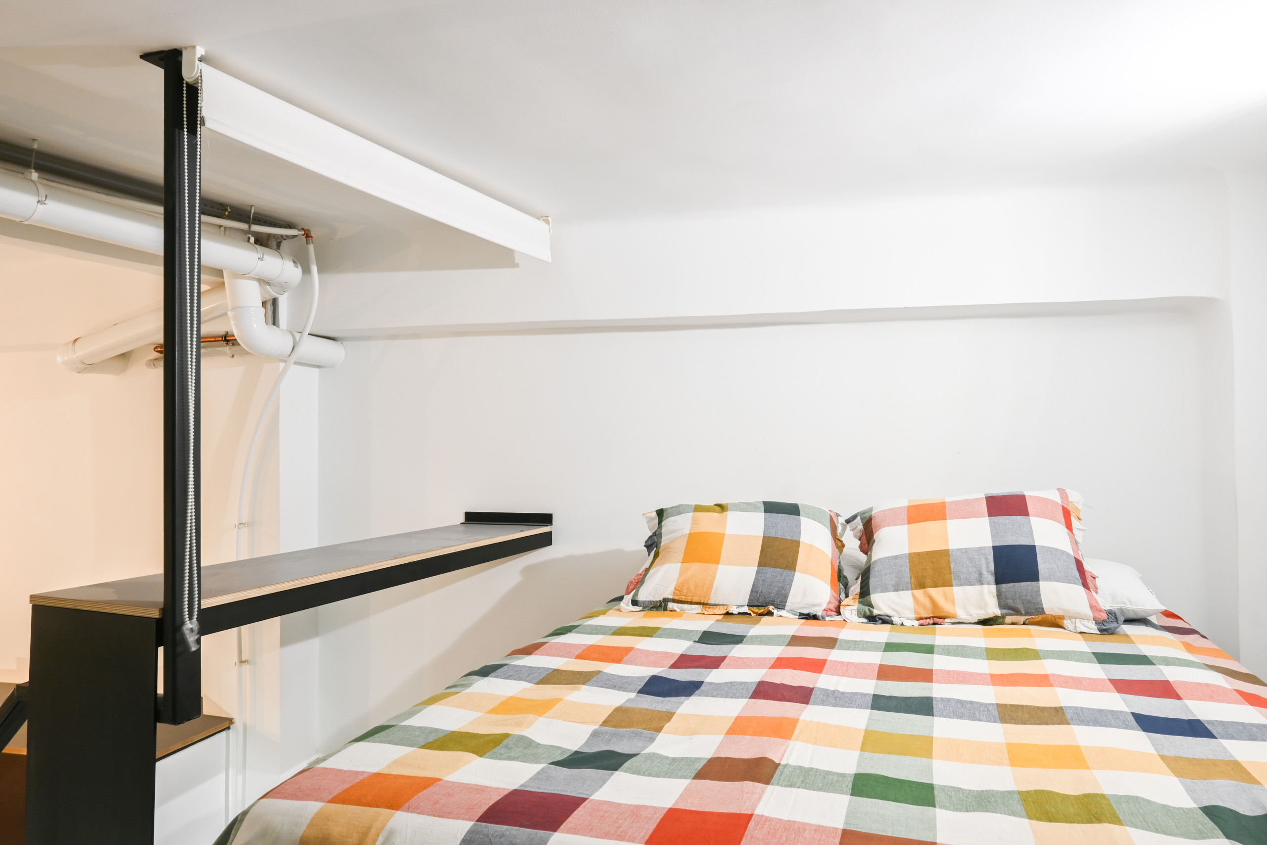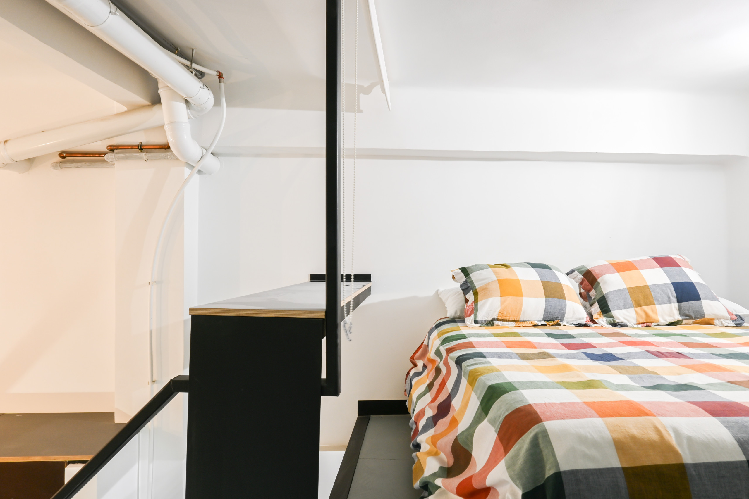 La cama doble se encuentra en un mezanine, un nivel elevado que optimiza el espacio y permite aprovechar mejor la altura del techo. El acceso a esta área se realiza mediante una escalera de diseño contemporáneo, añadiendo al encanto industrial del lugar.