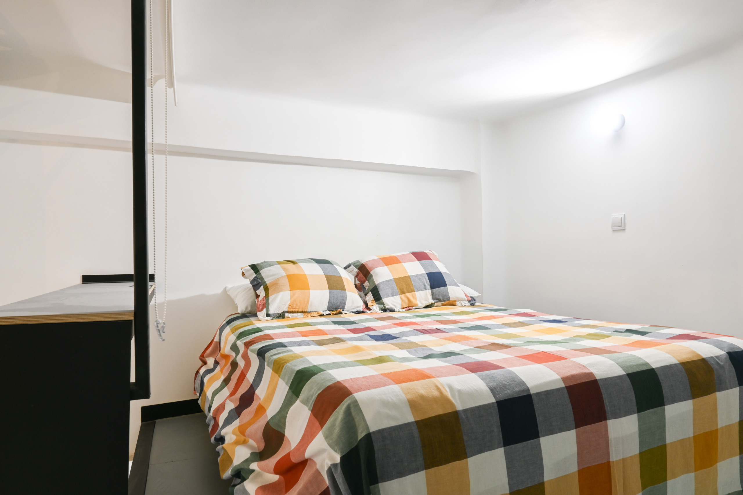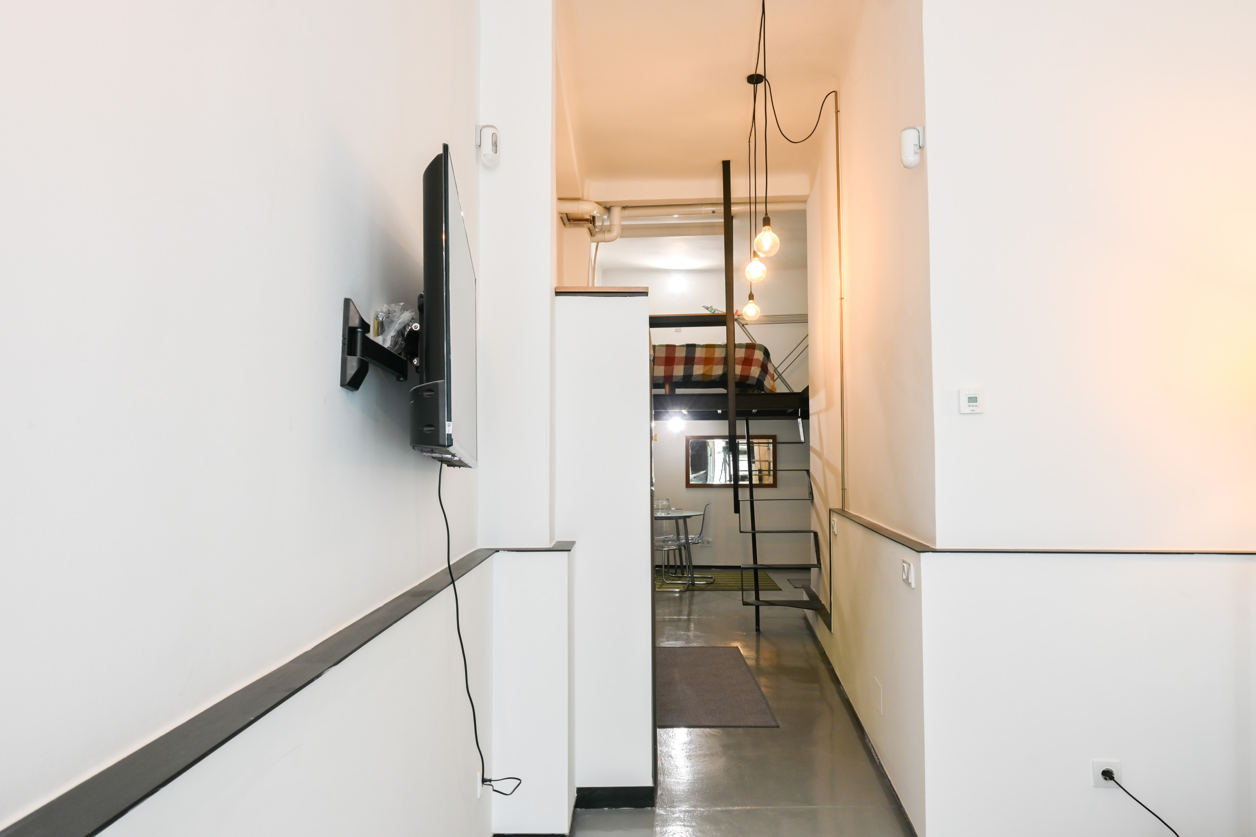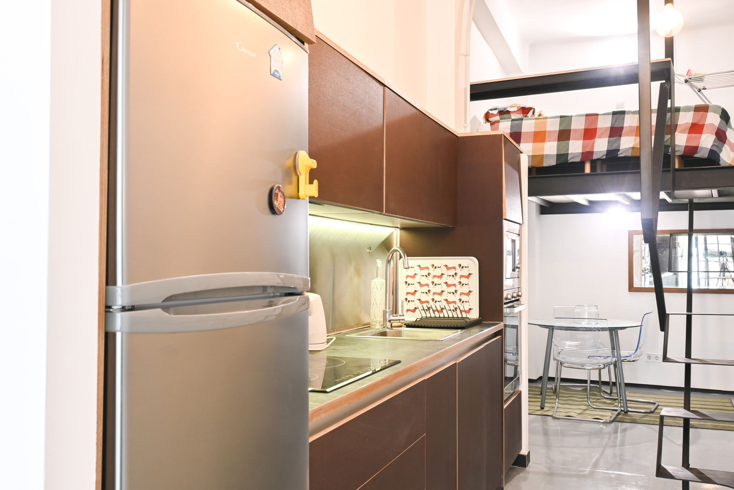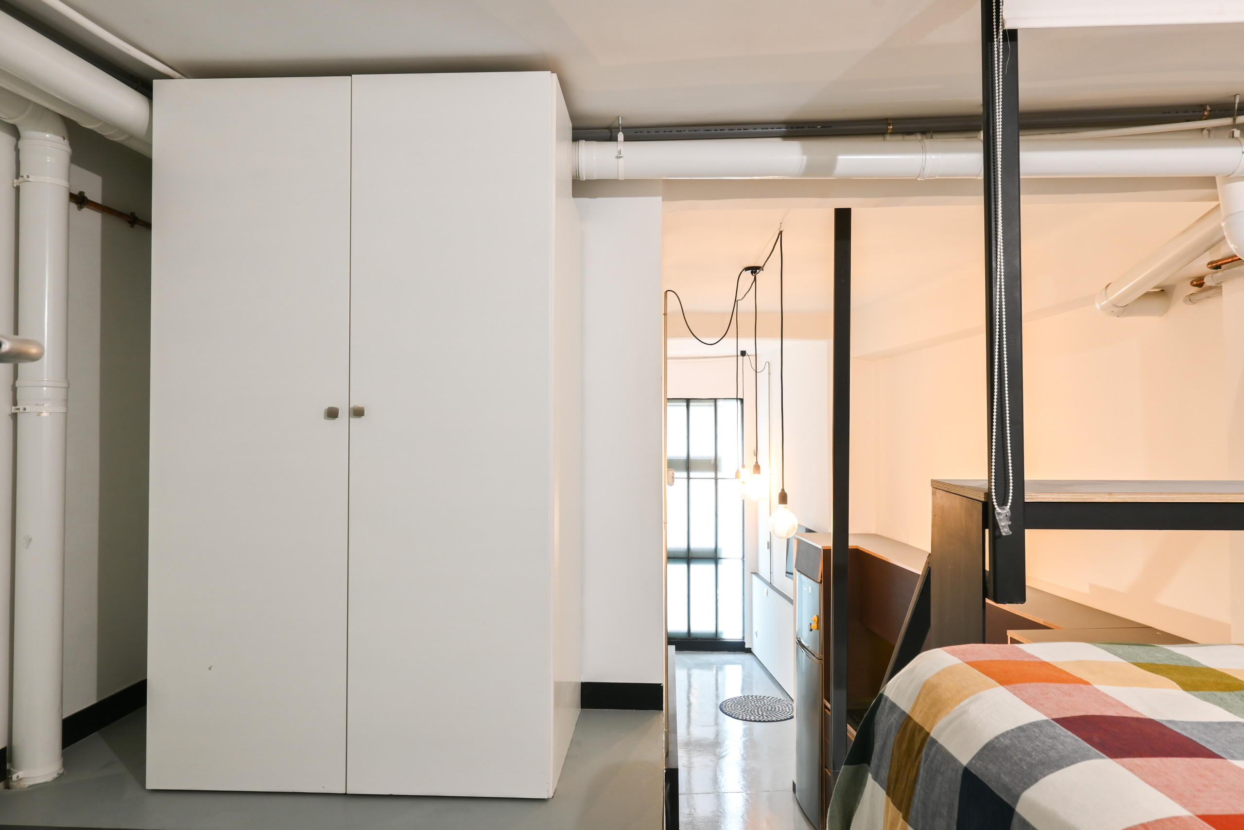 La cama doble se encuentra en un mezanine, un nivel elevado que optimiza el espacio y permite aprovechar mejor la altura del techo. El acceso a esta área se realiza mediante una escalera de diseño contemporáneo, añadiendo al encanto industrial del lugar.