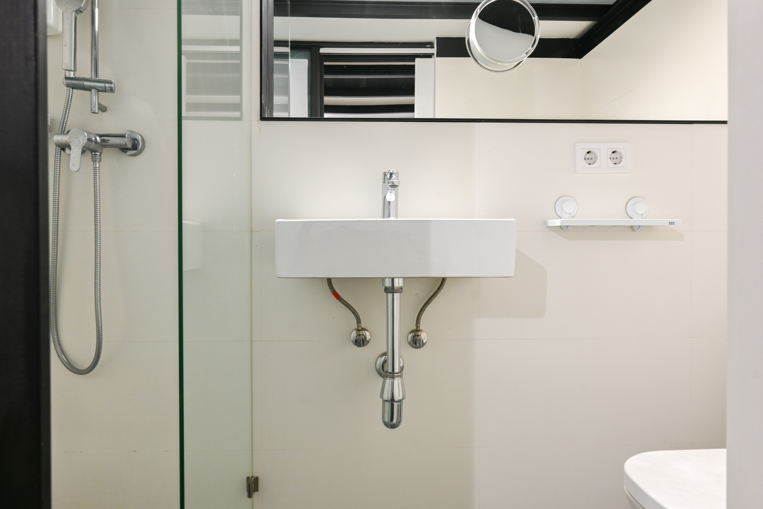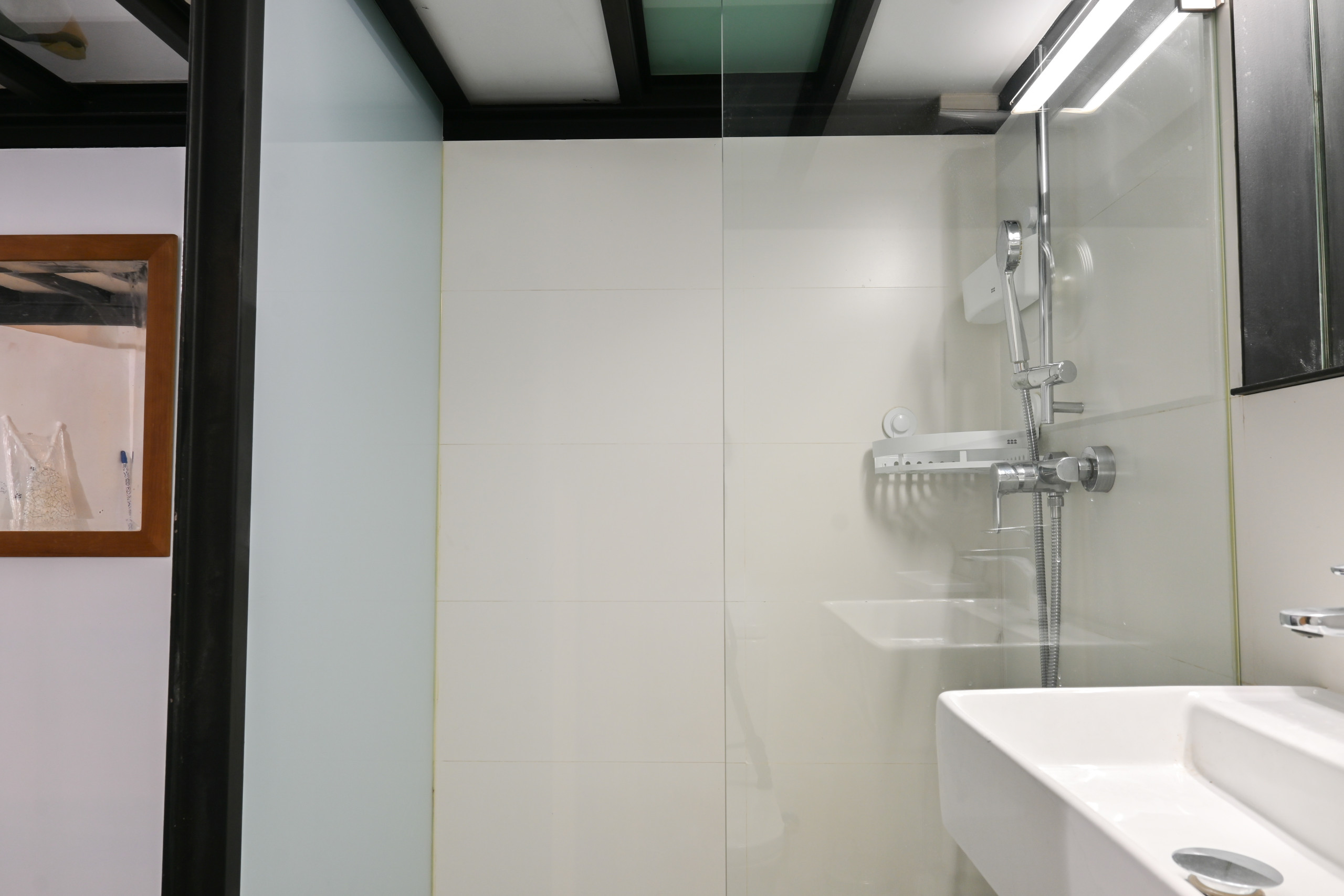 El baño tiene un plato de ducha moderno, con una mampara de vidrio transparente y accesorios cromados. El uso de azulejos en tonos neutros complementa el estilo industrial, mientras que el lavabo suspendido y el espejo sin marco aportan un toque minimalista.