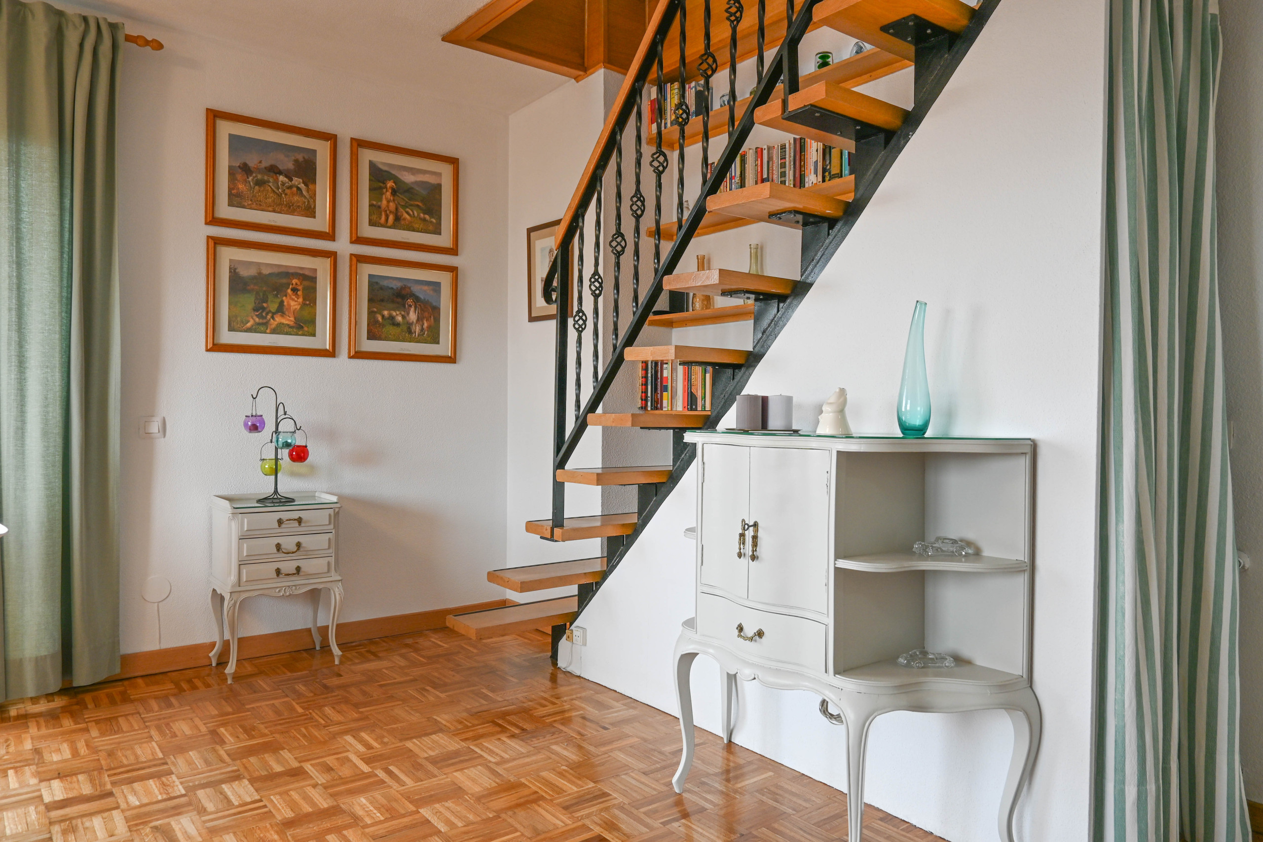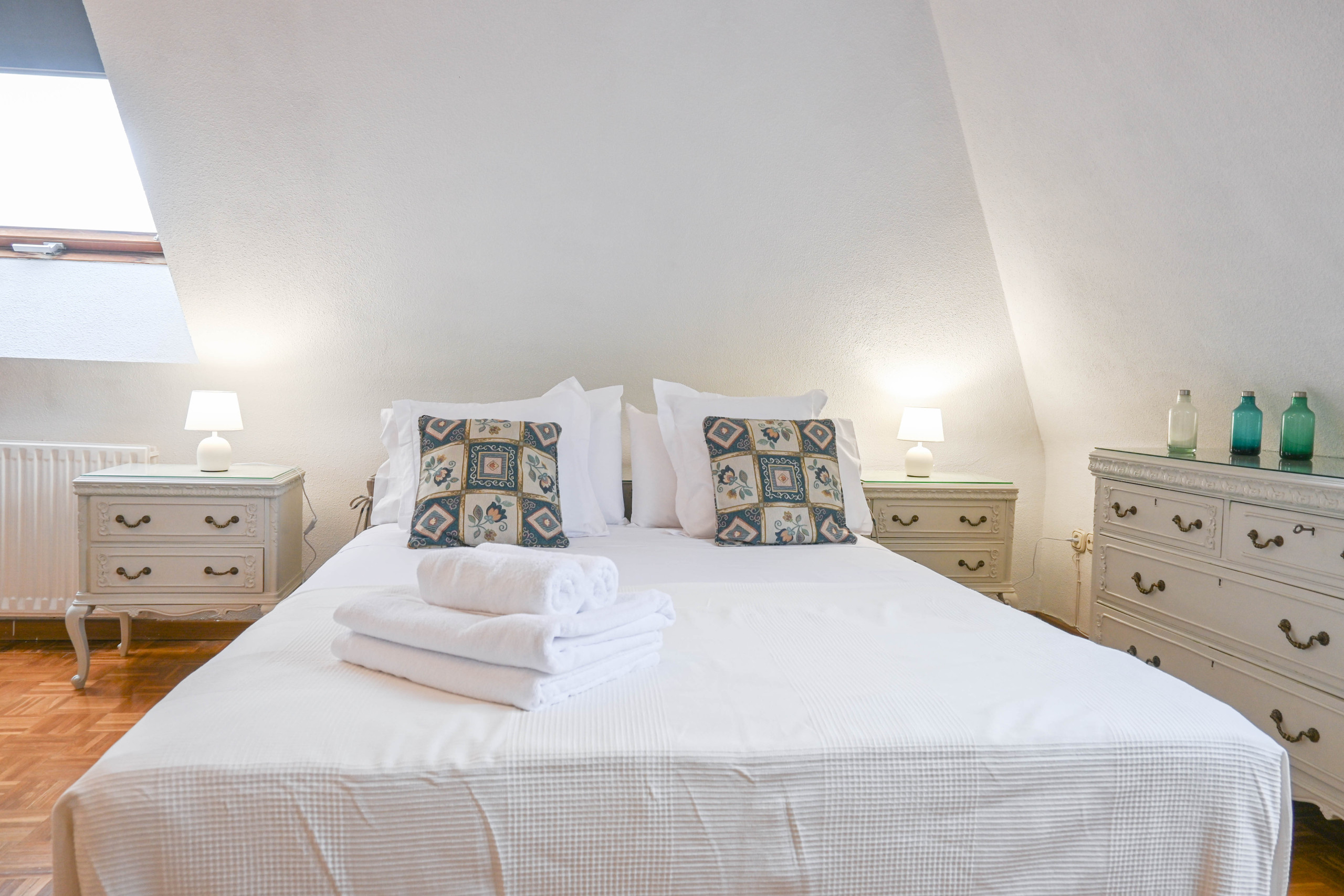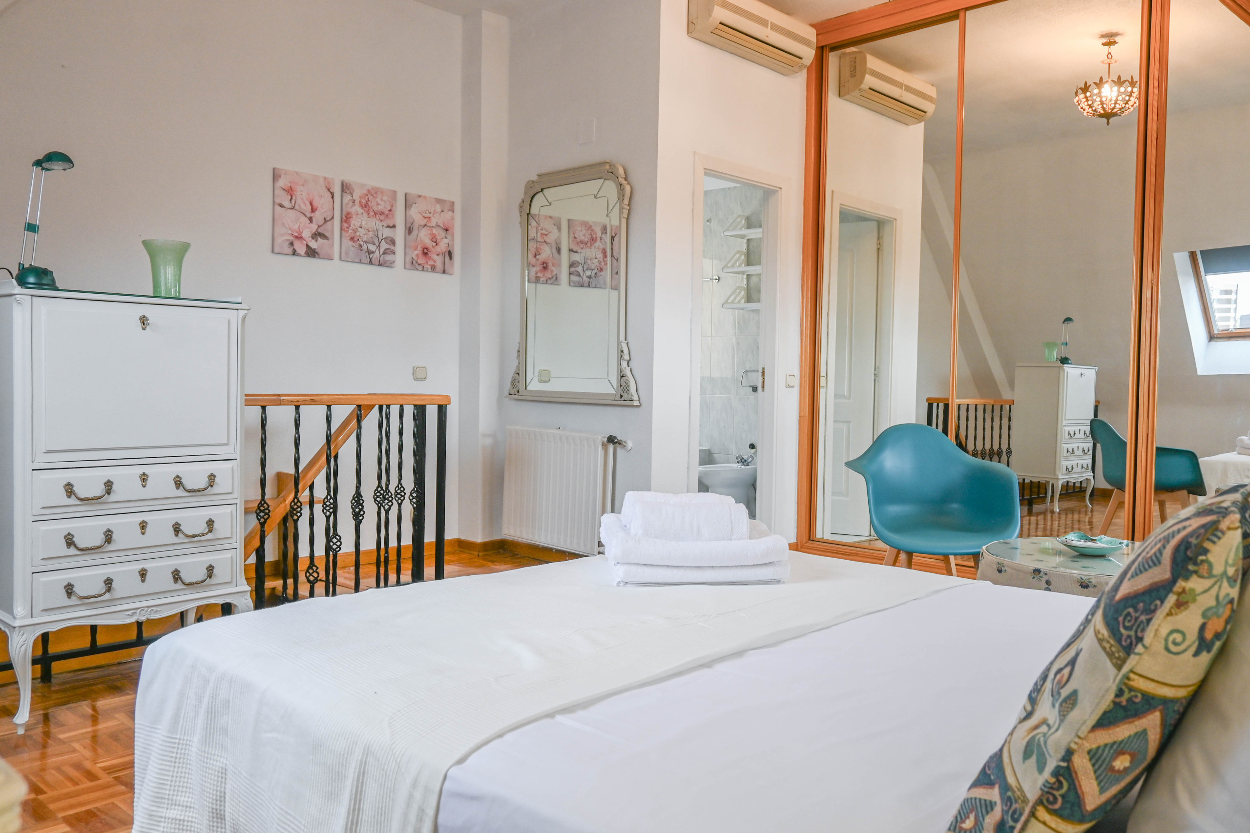 La planta alta alberga el refugio privado del dúplex: una amplia habitación doble que incluye una zona de estar, ideal para crear un rincón de lectura o un espacio de trabajo cómodo. Además, desde la ventana se pueden apreciar las imponentes Cuatro Torres, un elemento icónico de Madrid que otorga a esta habitación un carácter especial. El baño en suite, con una relajante bañera, está diseñado para ofrecer momentos de tranquilidad mientras se disfruta de las vistas panorámicas de la ciudad.