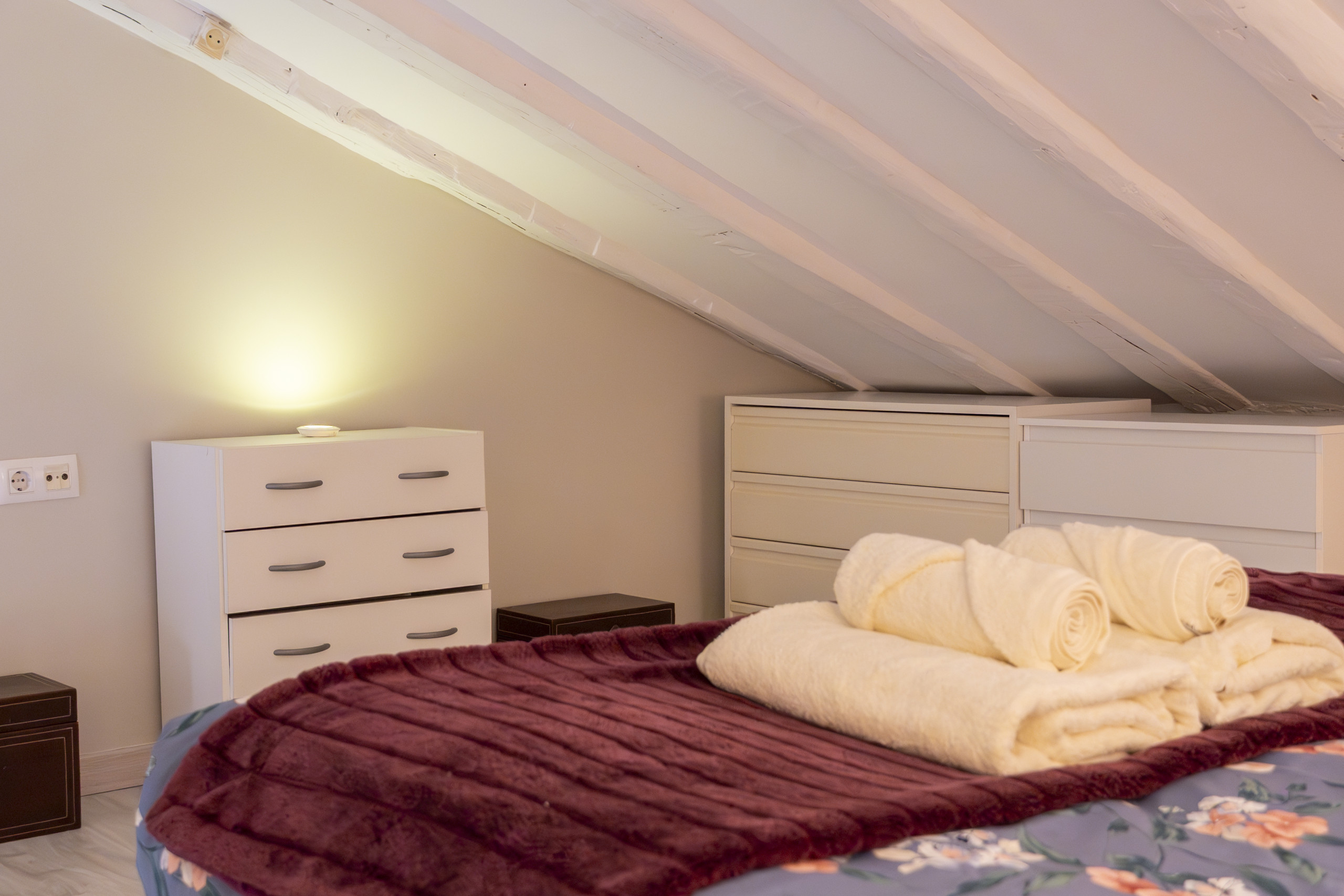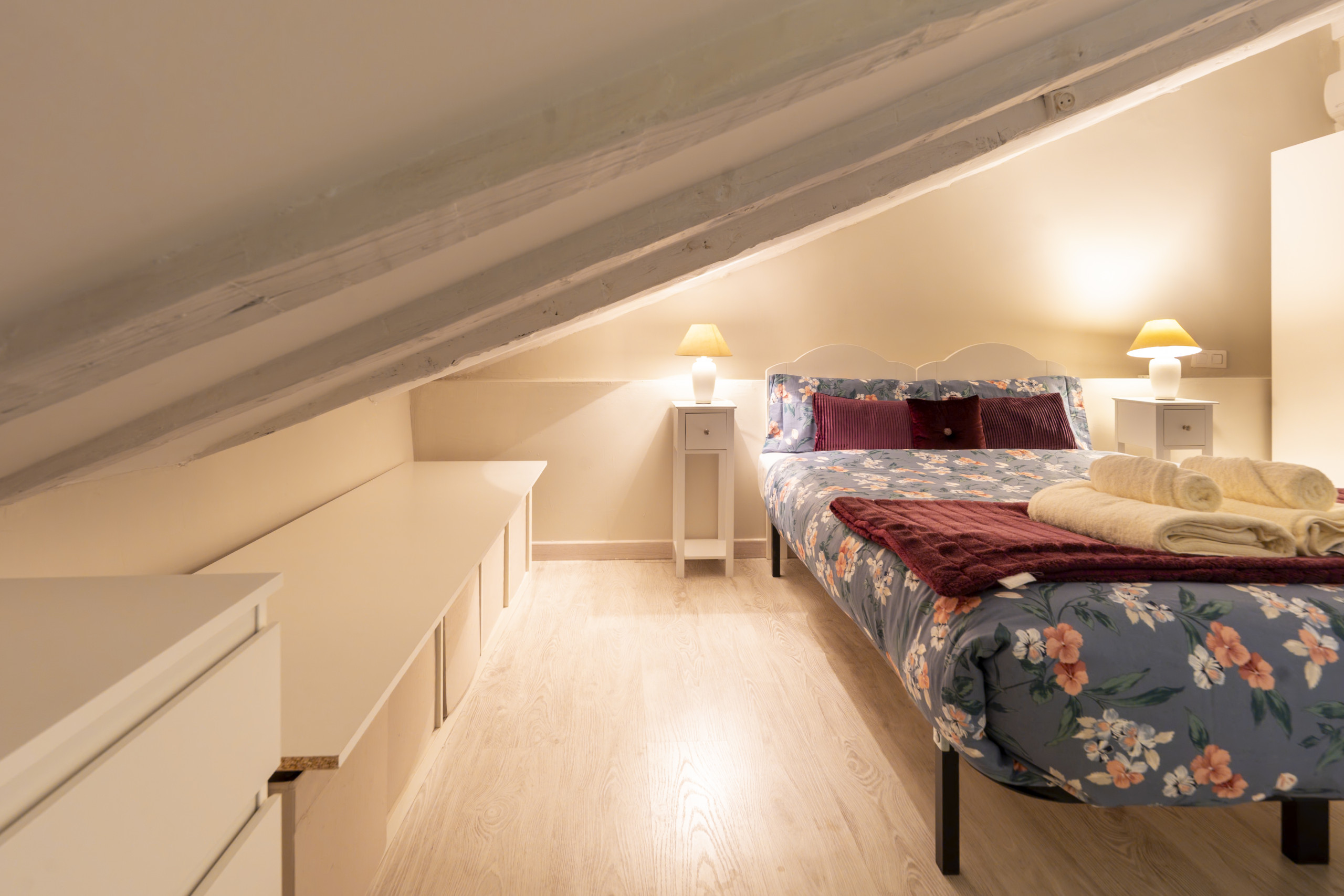 En la parte superior del dúplex se encuentra el dormitorio principal, un espacio íntimo y acogedor, ideal para el descanso. La habitación cuenta con una cómoda cama matrimonial, perfecta para garantizar un sueño reparador. Además, dispone de un amplio armario y numerosos espacios de almacenaje, lo que permite mantener la estancia siempre organizada sin comprometer la sensación de amplitud.