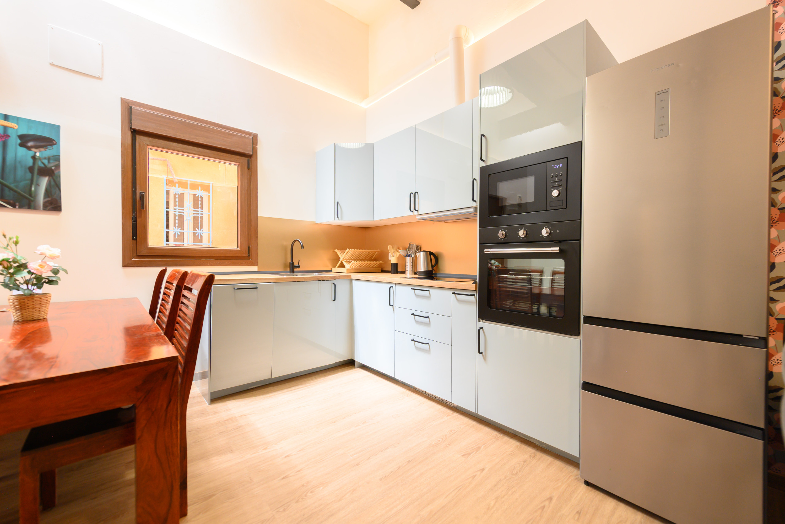 La cocina está completamente equipada, incluyendo nevera, microondas, horno, placa de inducción y hervidor de agua, ideal para preparar comidas como en casa.