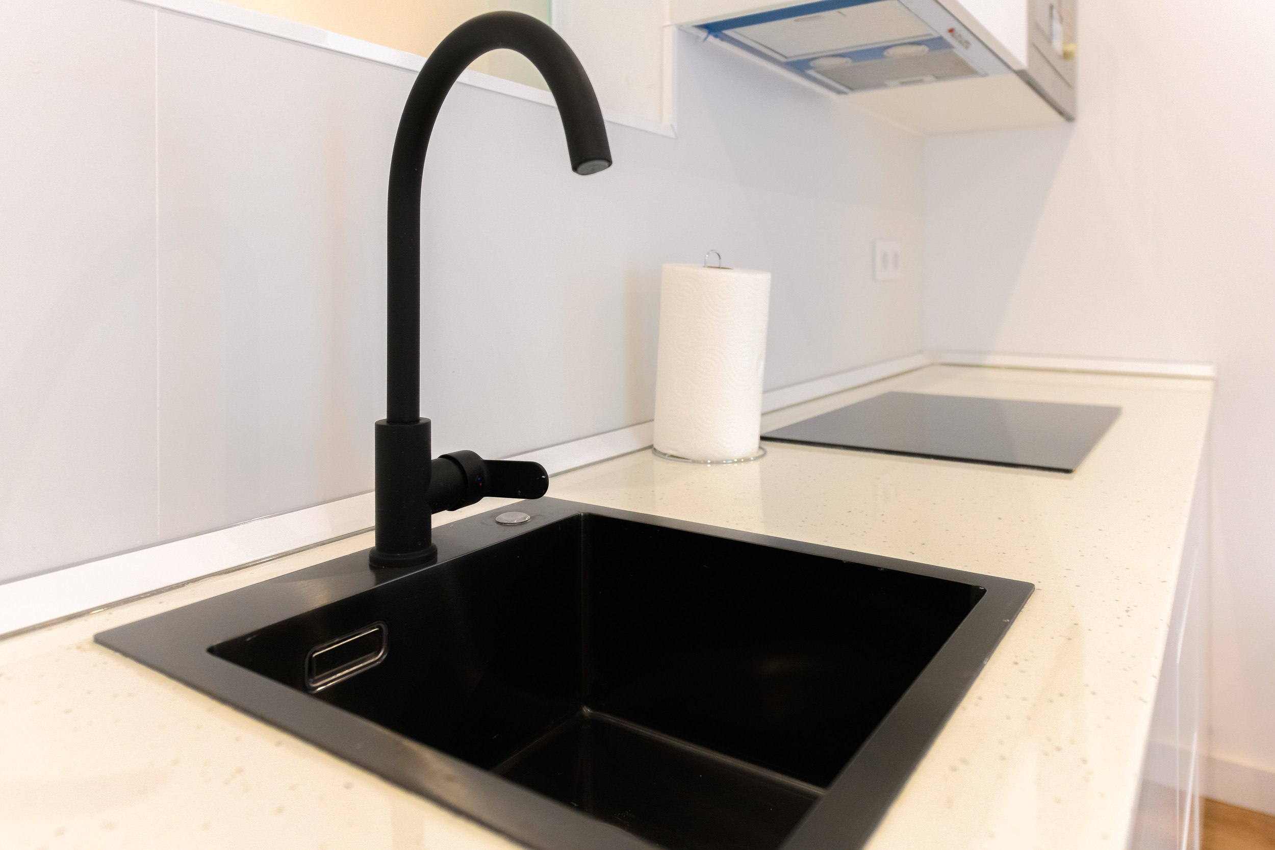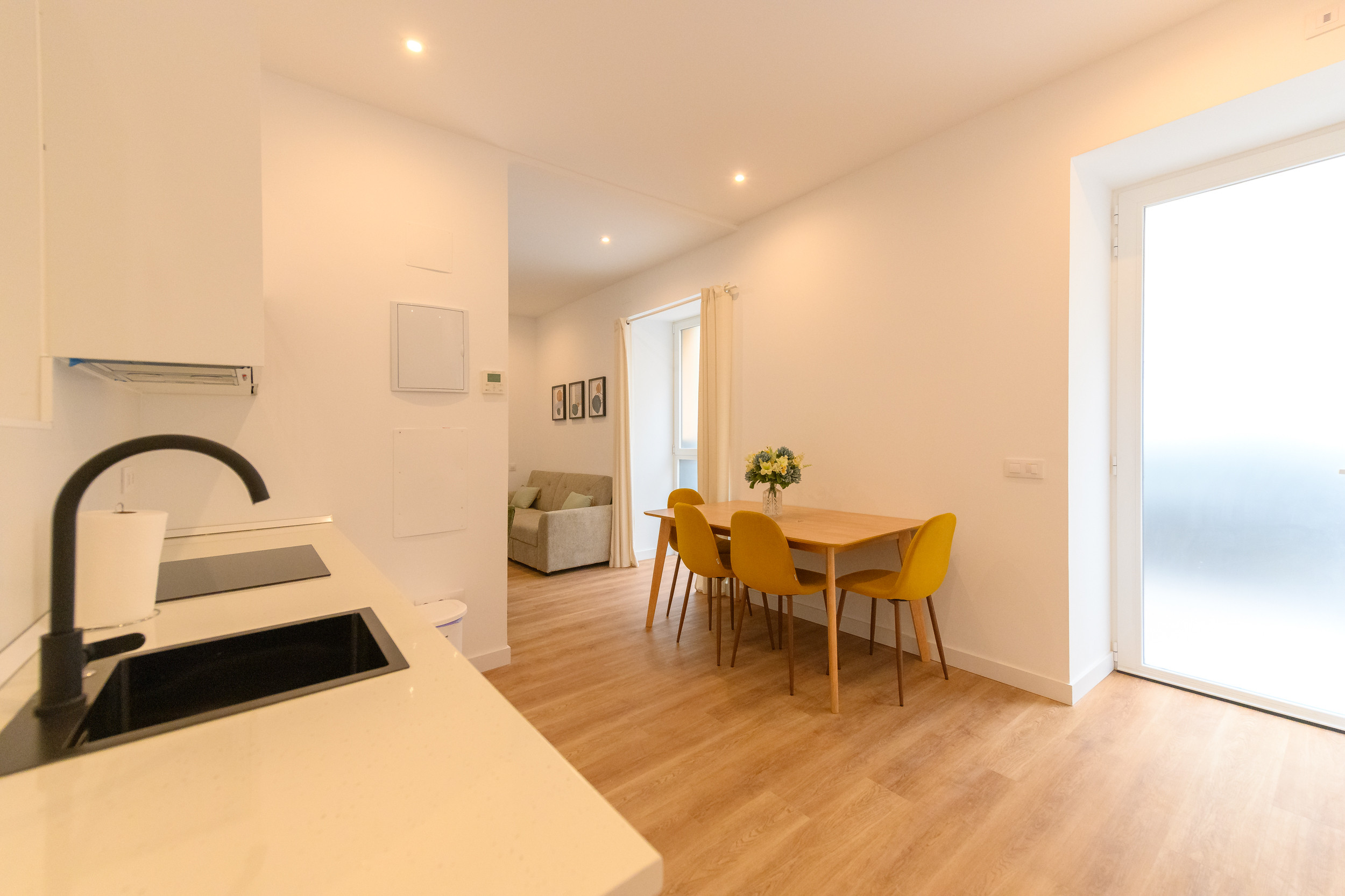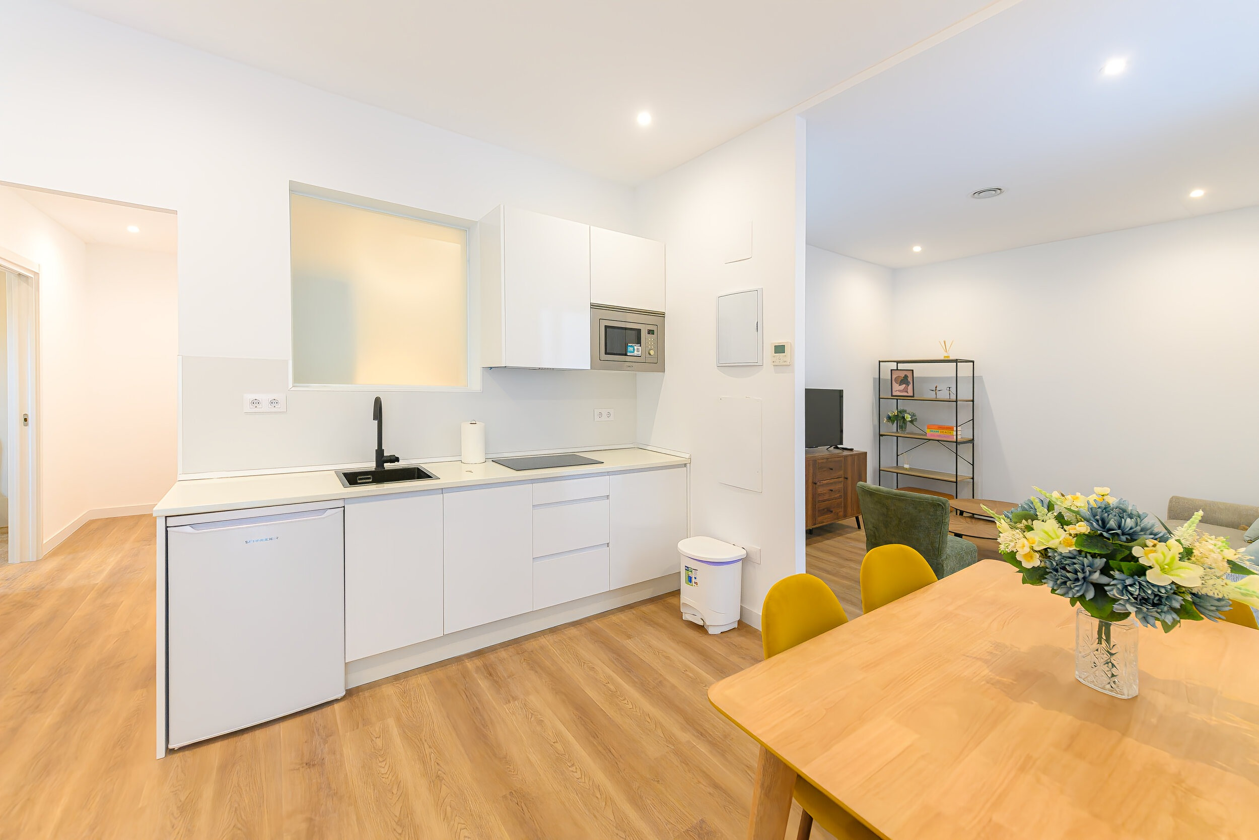 Al entrar, te recibe una elegante cocina estilo americana completamente equipada, integrada en el área de comedor. La cocina dispone de lavavajillas, nevera pequeña , microondas y todos los electrodomésticos y utensilios necesarios para que te sientas como en casa desde el primer día. Al lado de la cocina se encuentra el salón, que cuenta con un sofá cama perfecto para recibir visitas y una televisión para tus momentos de relax.