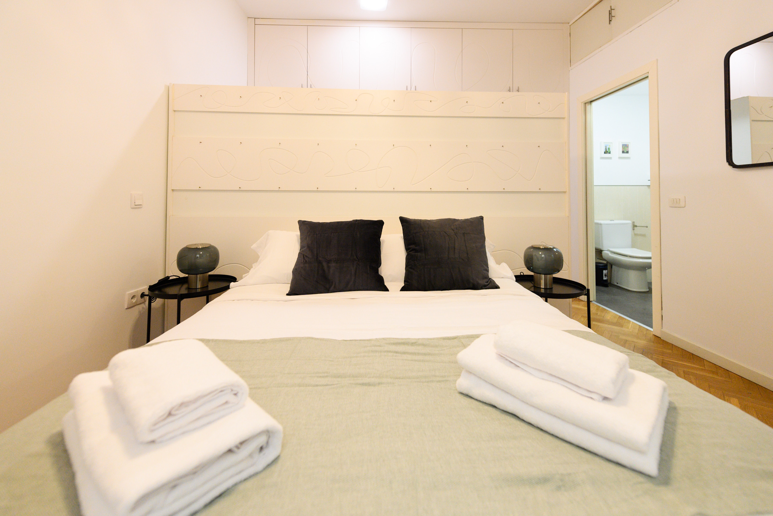El piso dispone de tres habitaciones, destacando una de ellas por su práctico vestidor, diseñado para optimizar el almacenamiento. La habitación principal tipo suite incluye baño privado con plato de ducha, ofreciendo un espacio íntimo y exclusivo. El segundo baño, también con plato de ducha, mantiene el diseño moderno del conjunto.