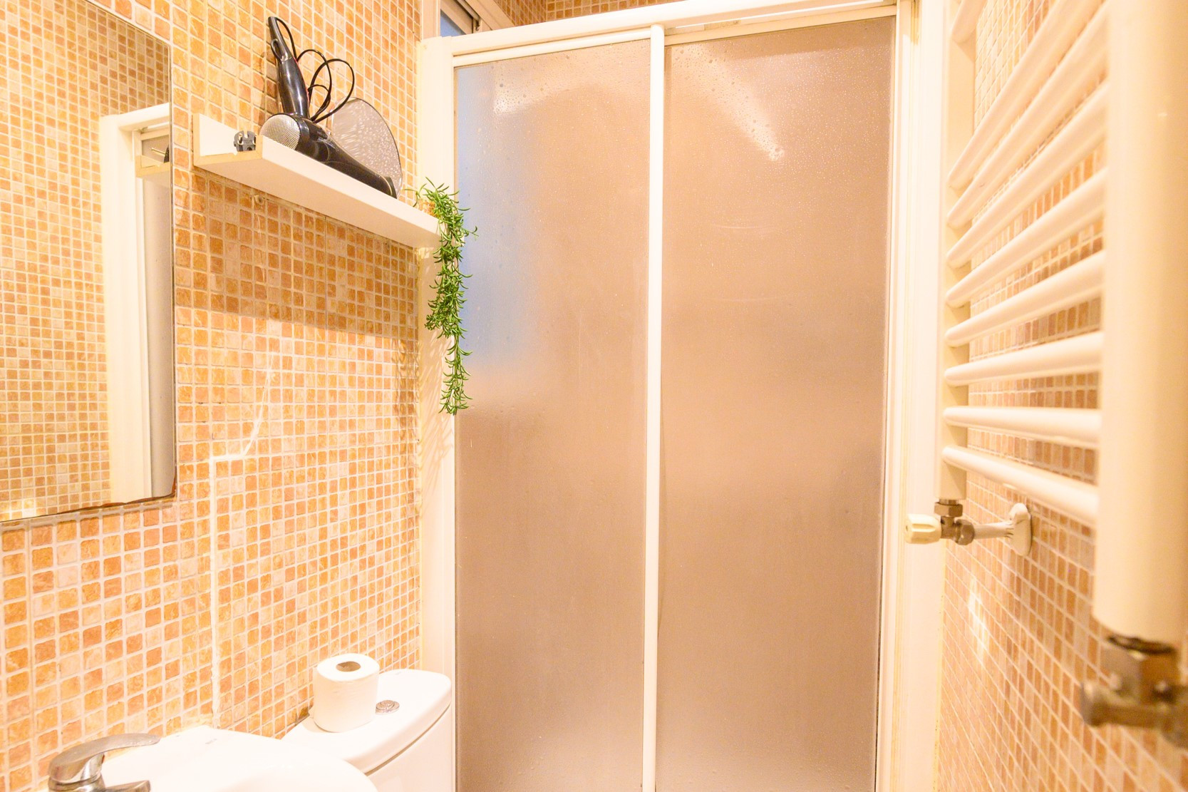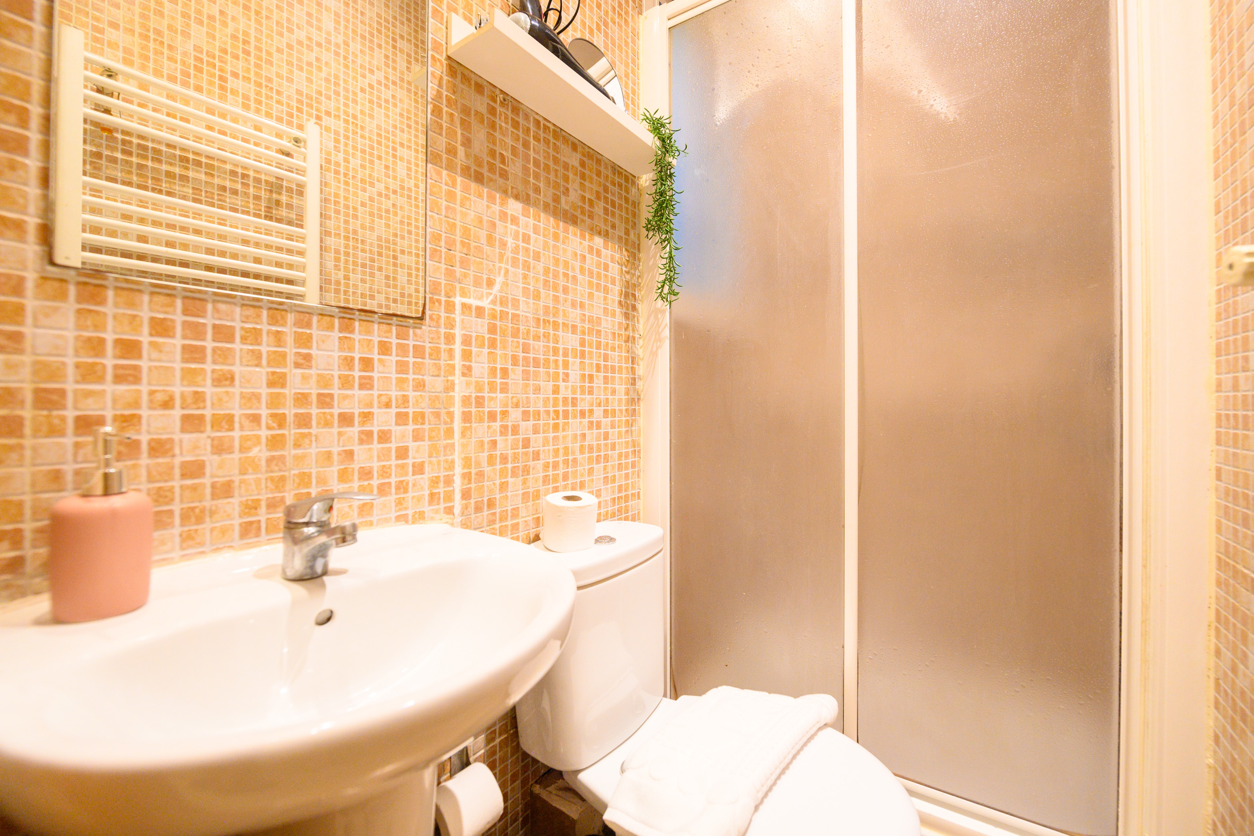 El baño de la vivienda está equipado con un plato de ducha, garantizando comodidad y funcionalidad. Los acabados modernos y los materiales de calidad aseguran un ambiente limpio y elegante, ideal para relajarse después de un largo día explorando la ciudad.