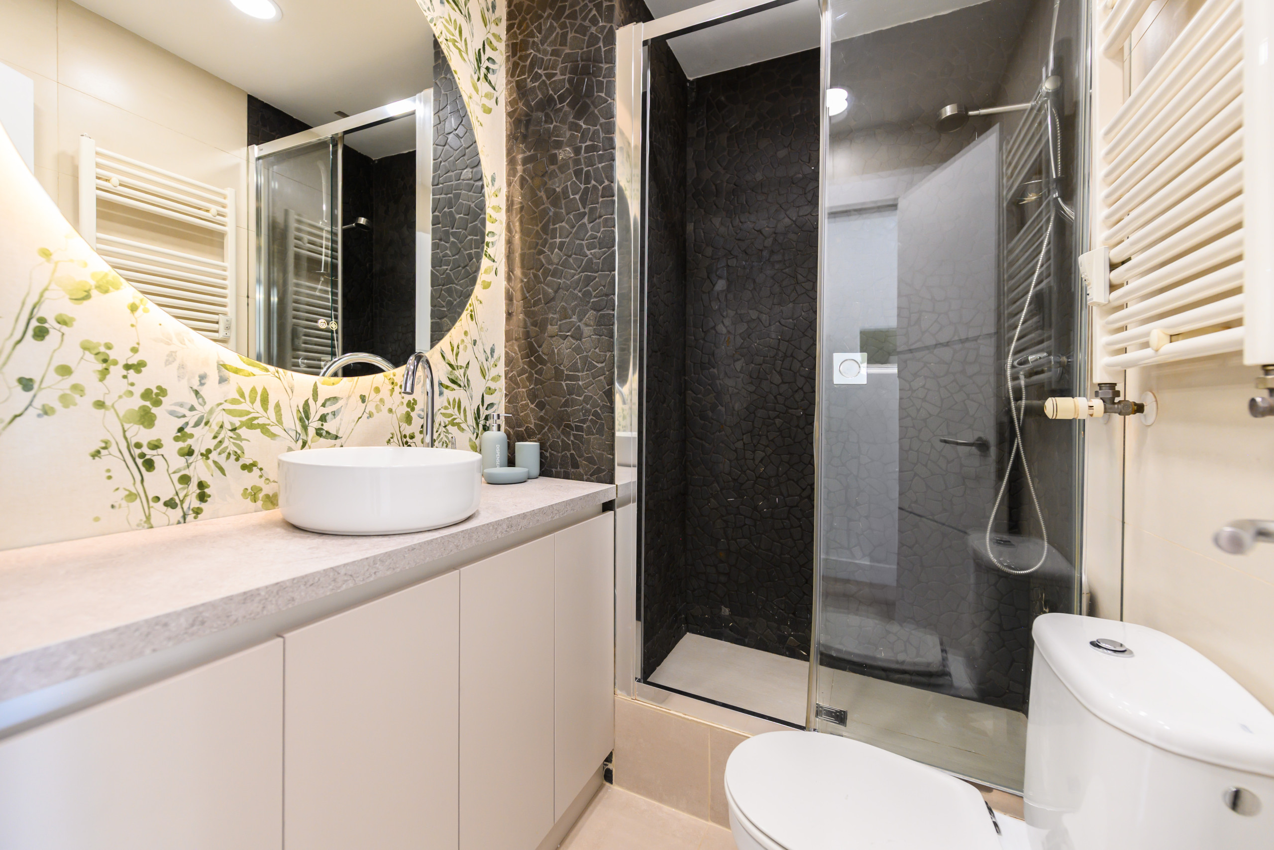 El baño incluye un plato de ducha, espejo, mueble en el lavado moderno y funcional.