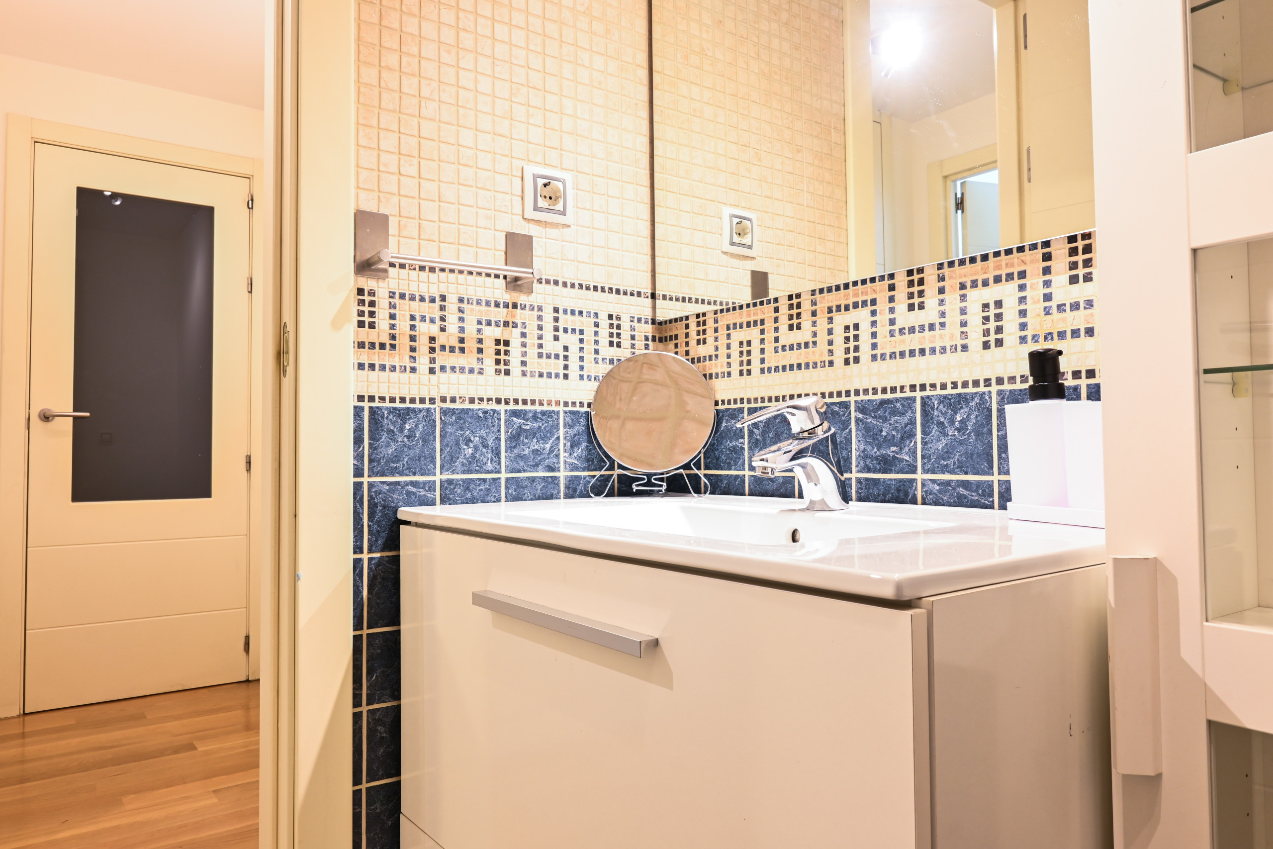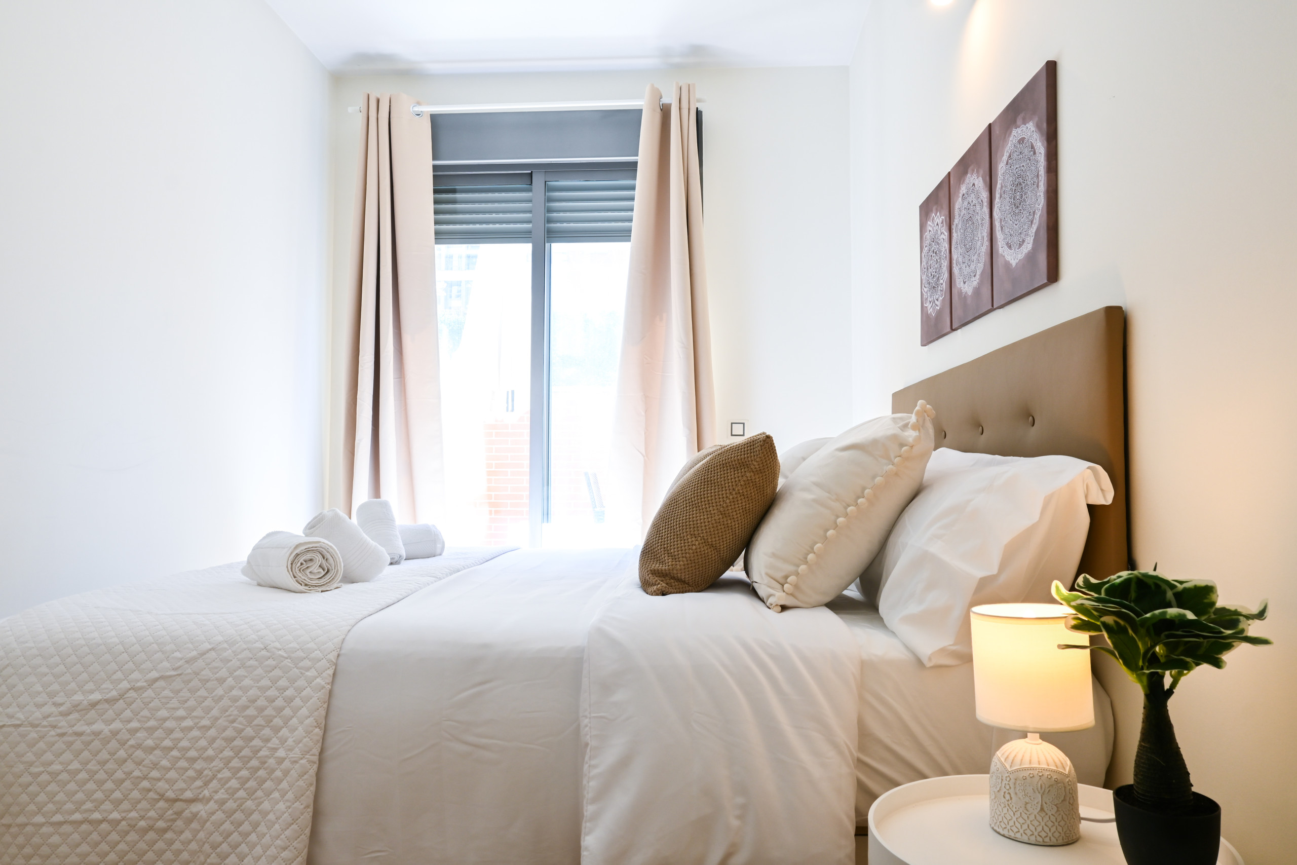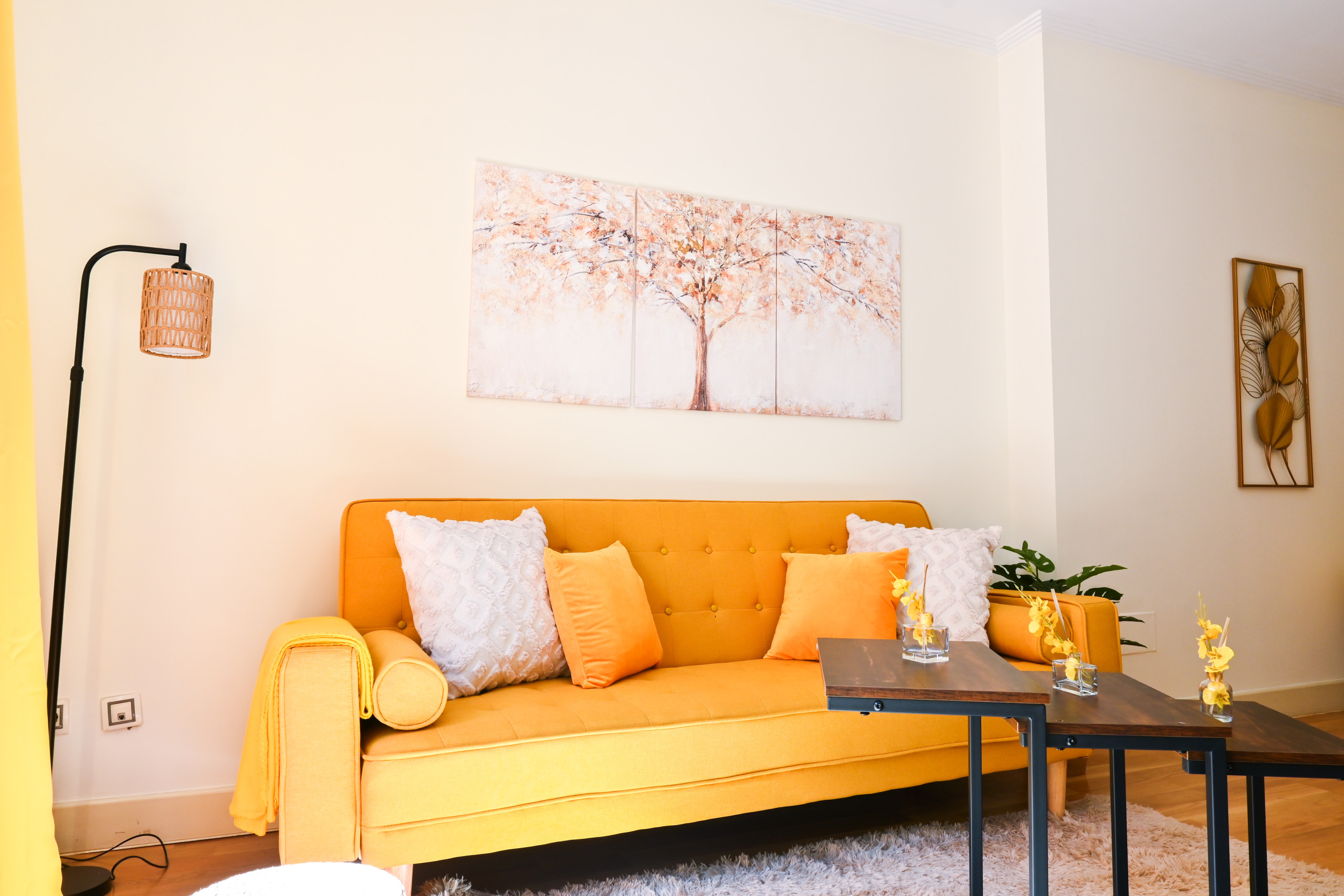 Al ingresar al apartamento, serás recibido por un espacio luminoso y acogedor, decorado con gusto y elegancia en cada detalle. El salón, con sus tonos cálidos y muebles cuidadosamente seleccionados, es el lugar perfecto para relajarte y disfrutar de momentos de descanso con tus seres queridos. El cómodo sofá cama invita a tomar una siesta o disfrutar de una película en la televisión de pantalla plana.