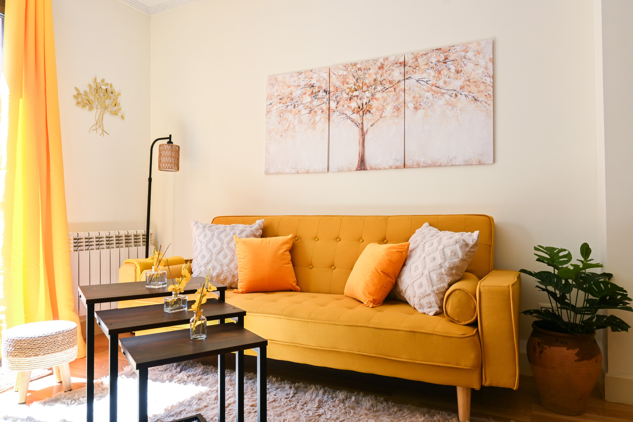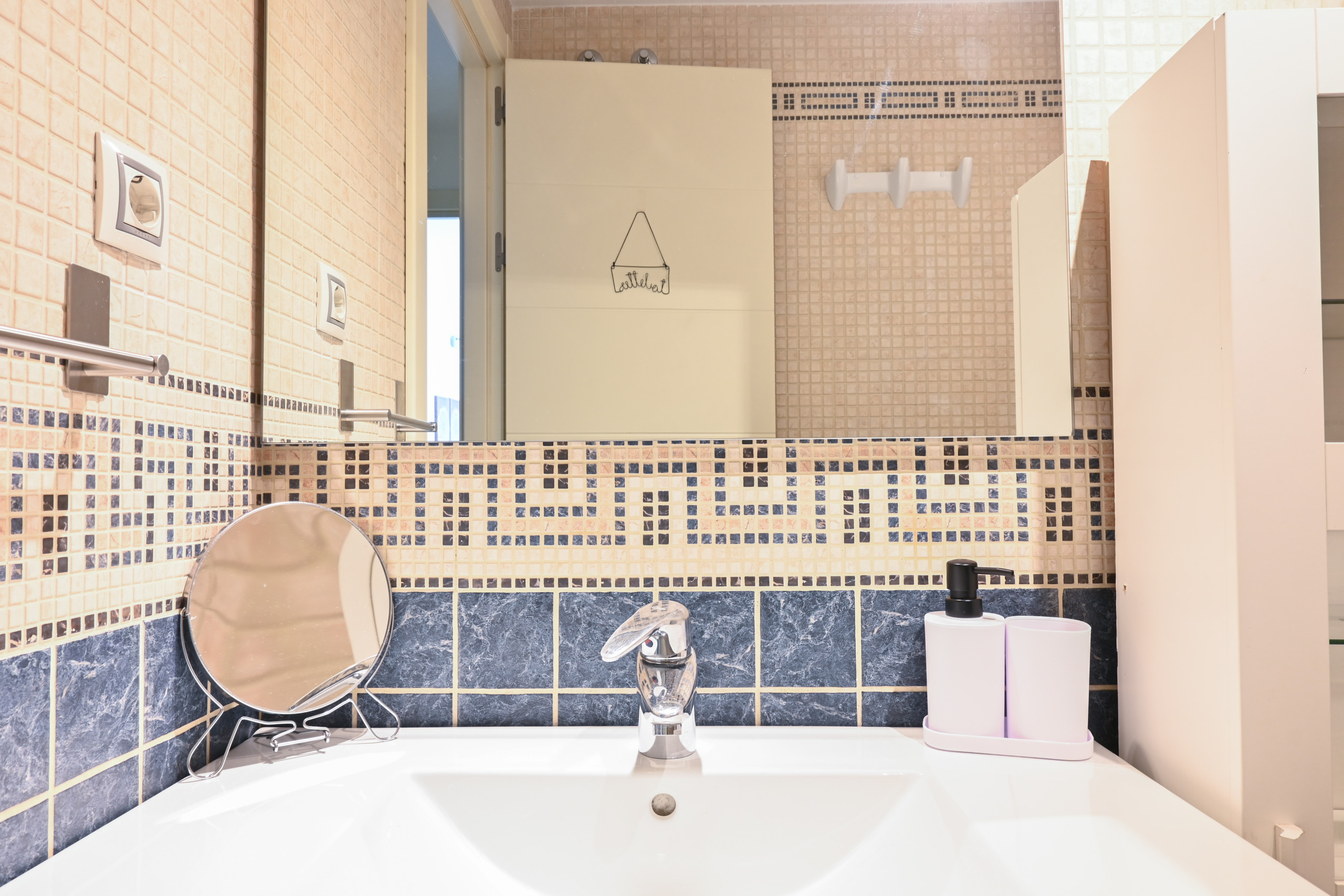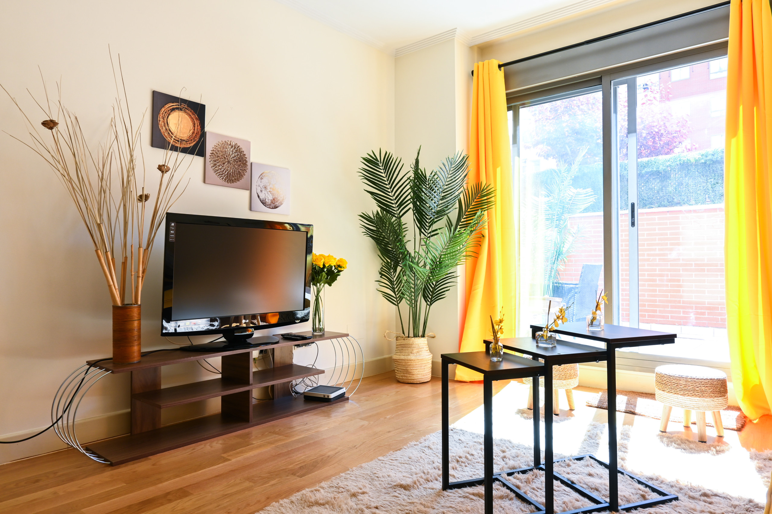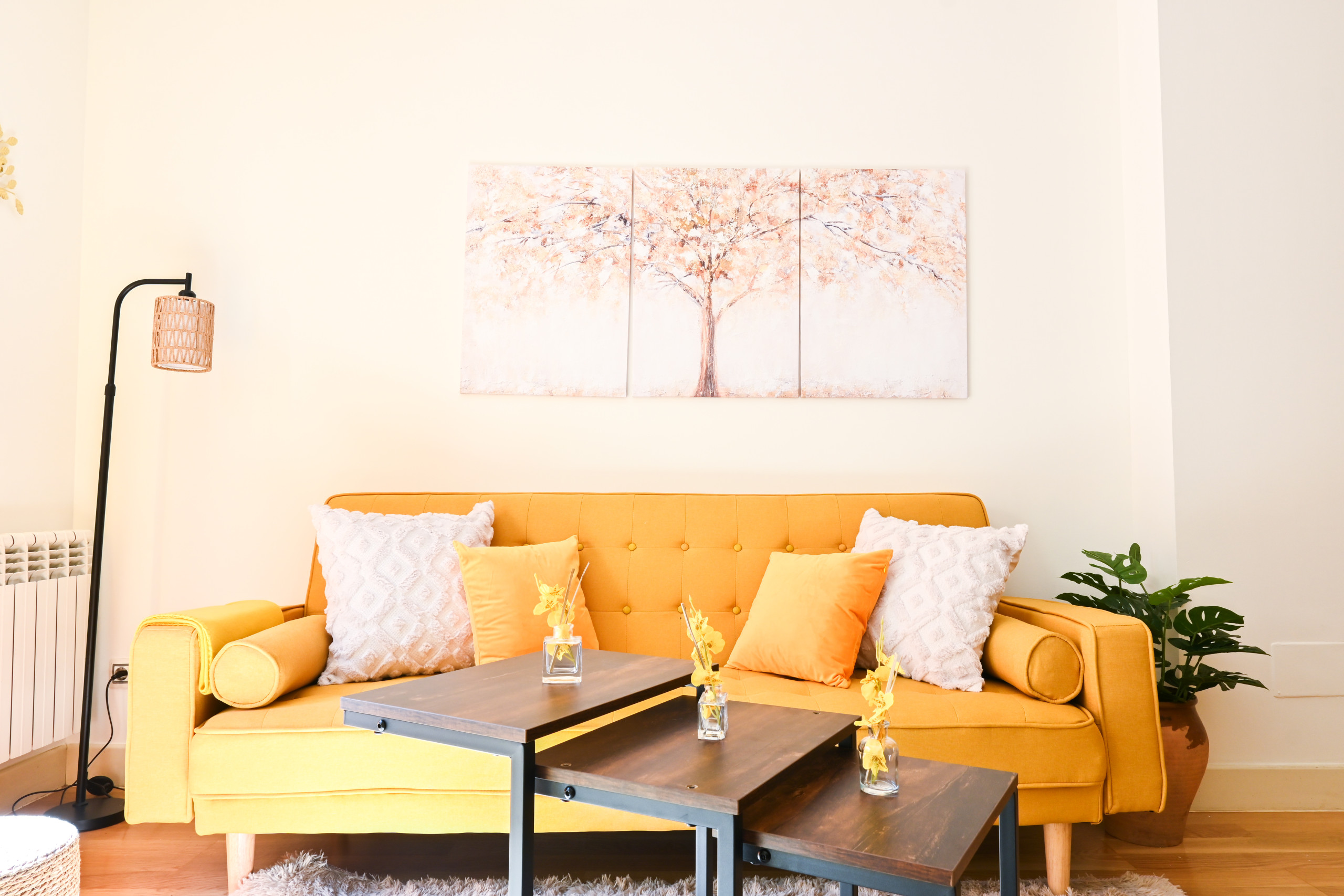 Al ingresar al apartamento, serás recibido por un espacio luminoso y acogedor, decorado con gusto y elegancia en cada detalle. El salón, con sus tonos cálidos y muebles cuidadosamente seleccionados, es el lugar perfecto para relajarte y disfrutar de momentos de descanso con tus seres queridos. El cómodo sofá cama invita a tomar una siesta o disfrutar de una película en la televisión de pantalla plana.