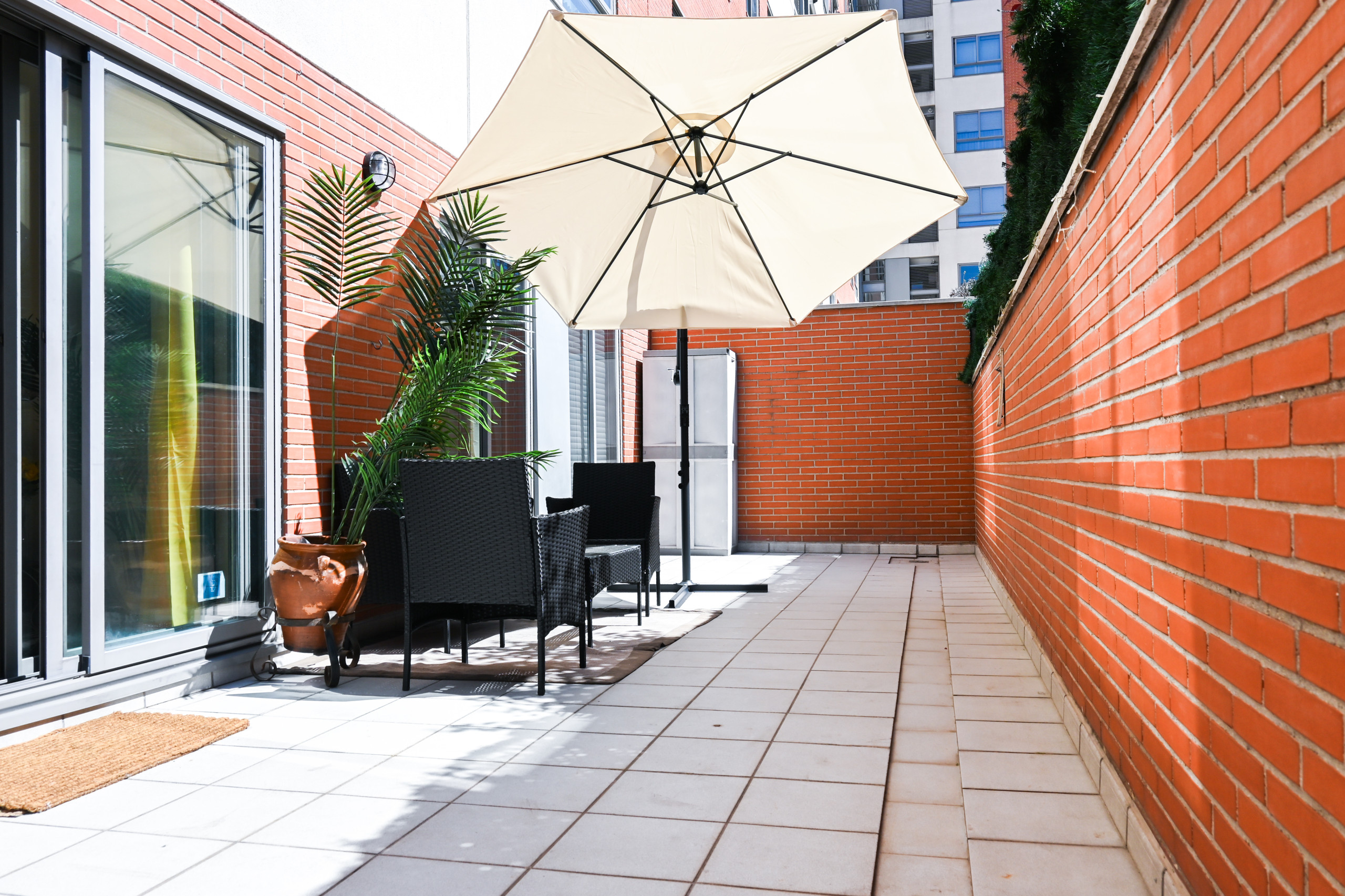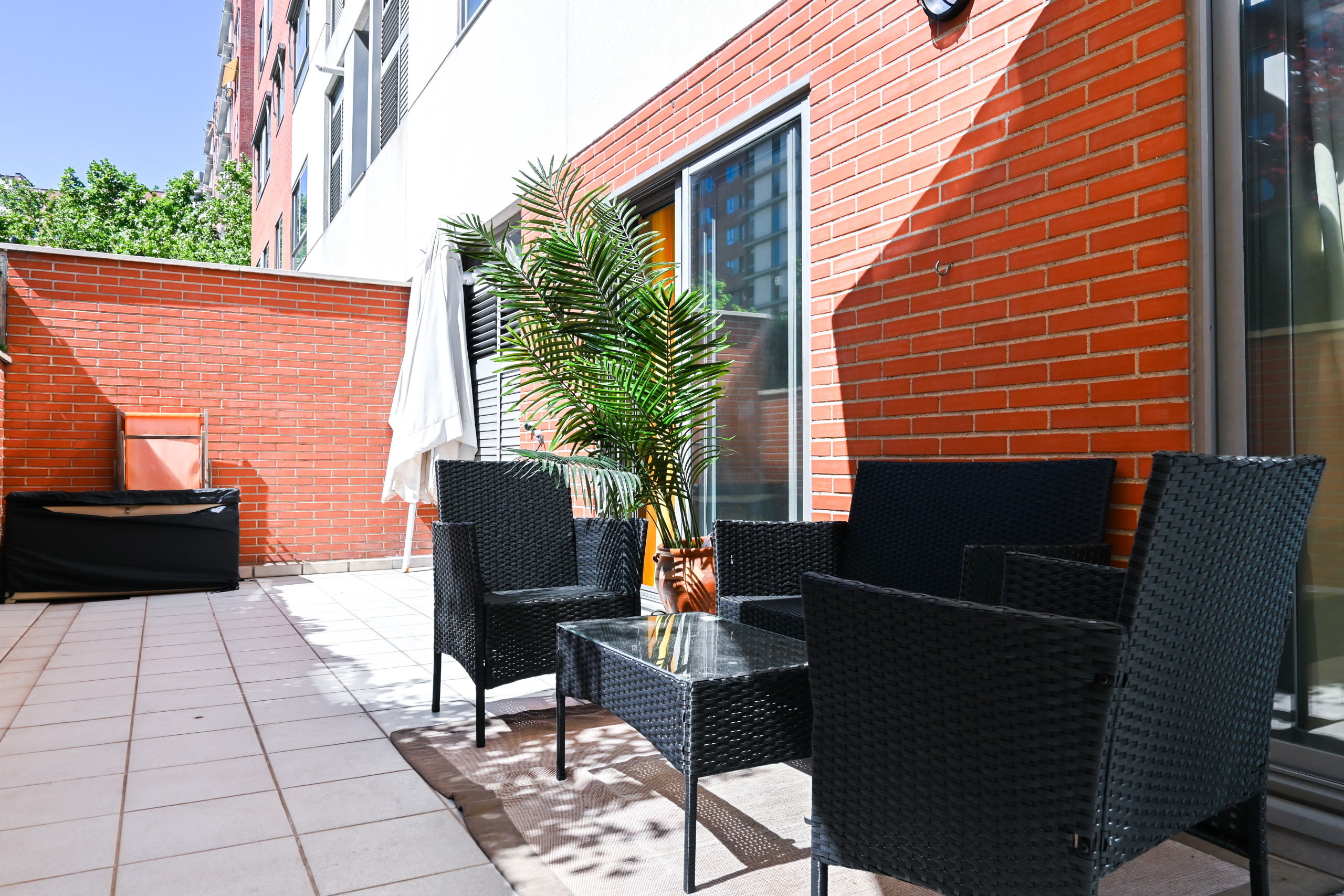 Pero eso no es todo. Este apartamento también cuenta con un encantador patio interior, amueblado con cómodos muebles de exterior y adornado con plantas exuberantes, donde podrás disfrutar de momentos de tranquilidad al aire libre o organizar cenas al aire libre bajo las estrellas.