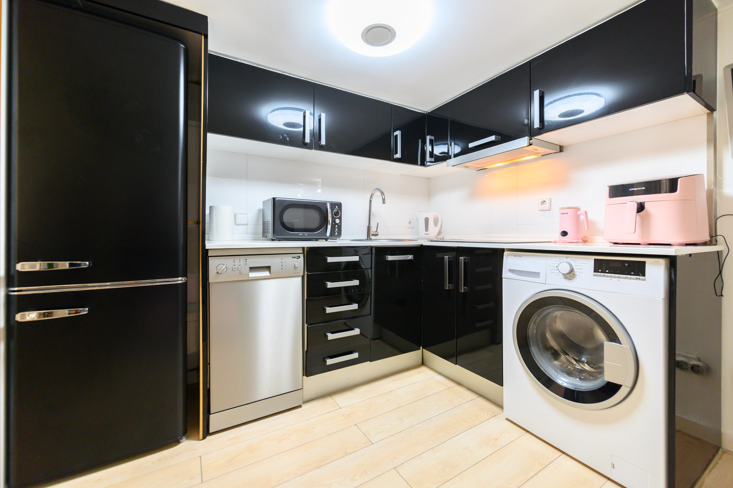 La cocina, de estilo abierto y completamente equipada, dispone de lavavajillas, microondas, nevera, freidora de aire y lavadora, ofreciendo todo lo necesario para el día a día. Además, en esta planta se ubica un baño completo con plato de ducha, mueble de lavabo y espejo de diseño moderno.