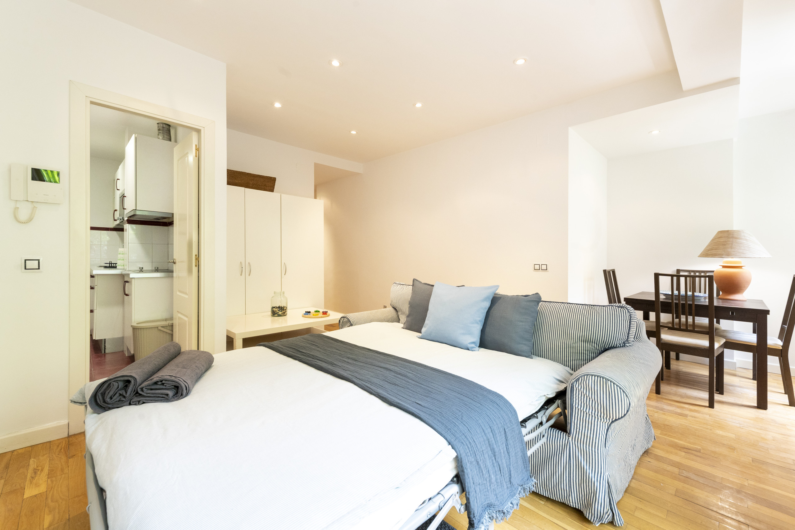 El salón-comedor es un espacio luminoso y versátil, con una zona de comedor perfecta para tus reuniones y un cómodo sofá cama doble, ideal para recibir visitas. Desde aquí, podrás acceder al balcón con vistas a la calle, un rincón perfecto para disfrutar del aire fresco o simplemente relajarte al final del día.