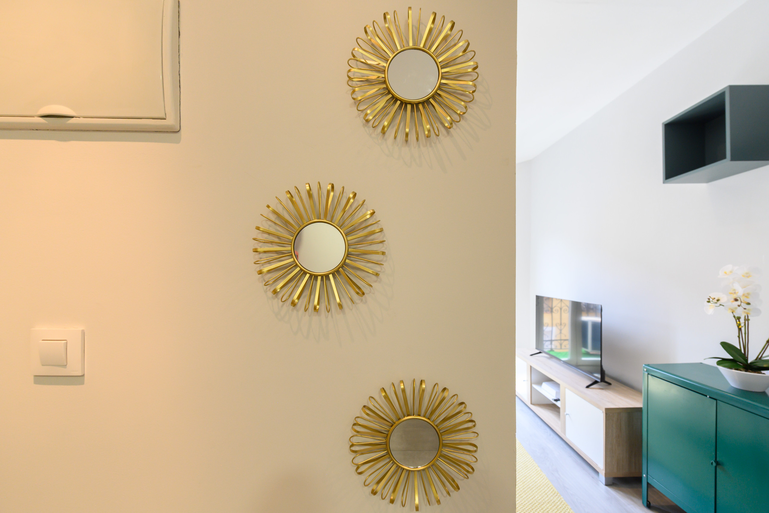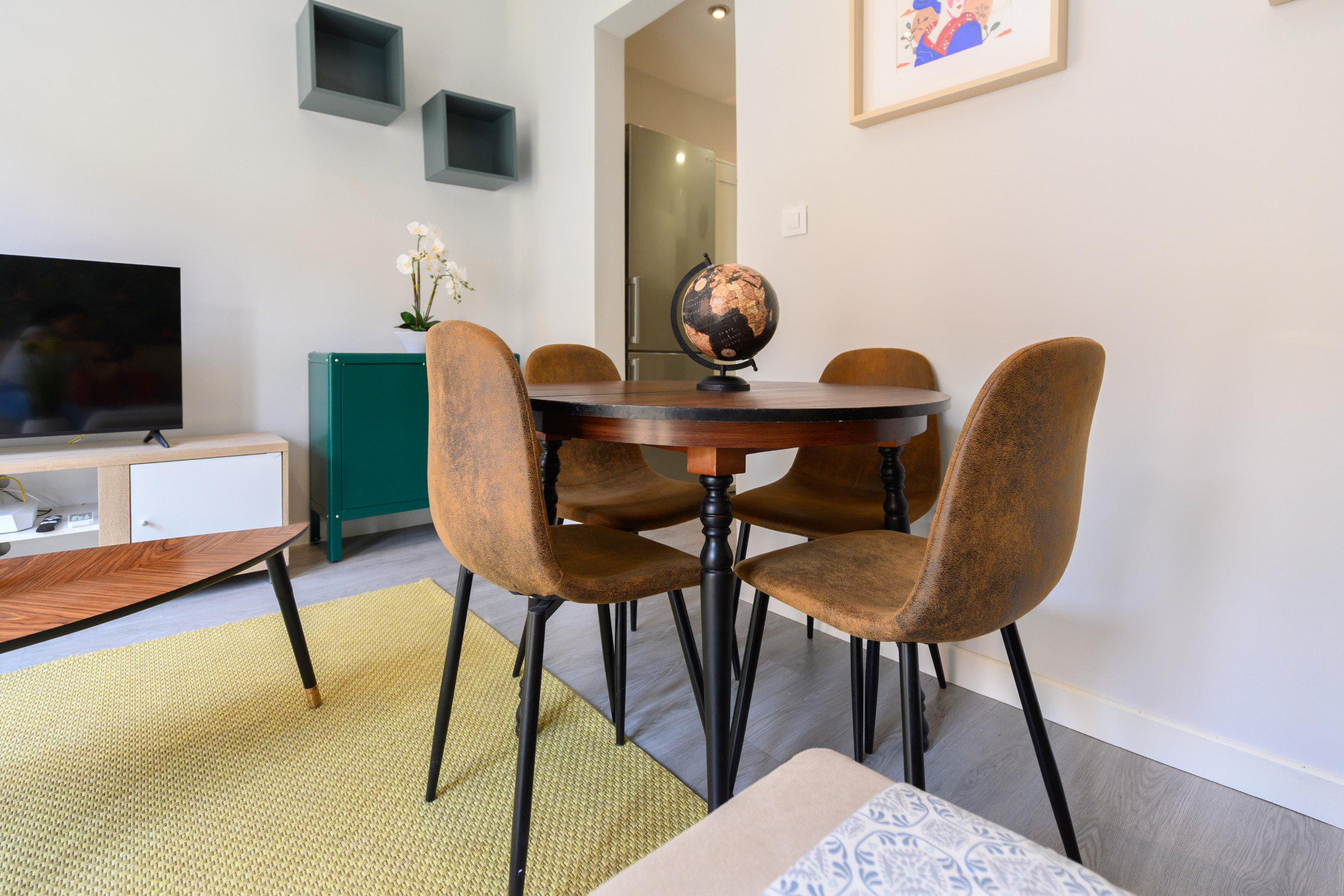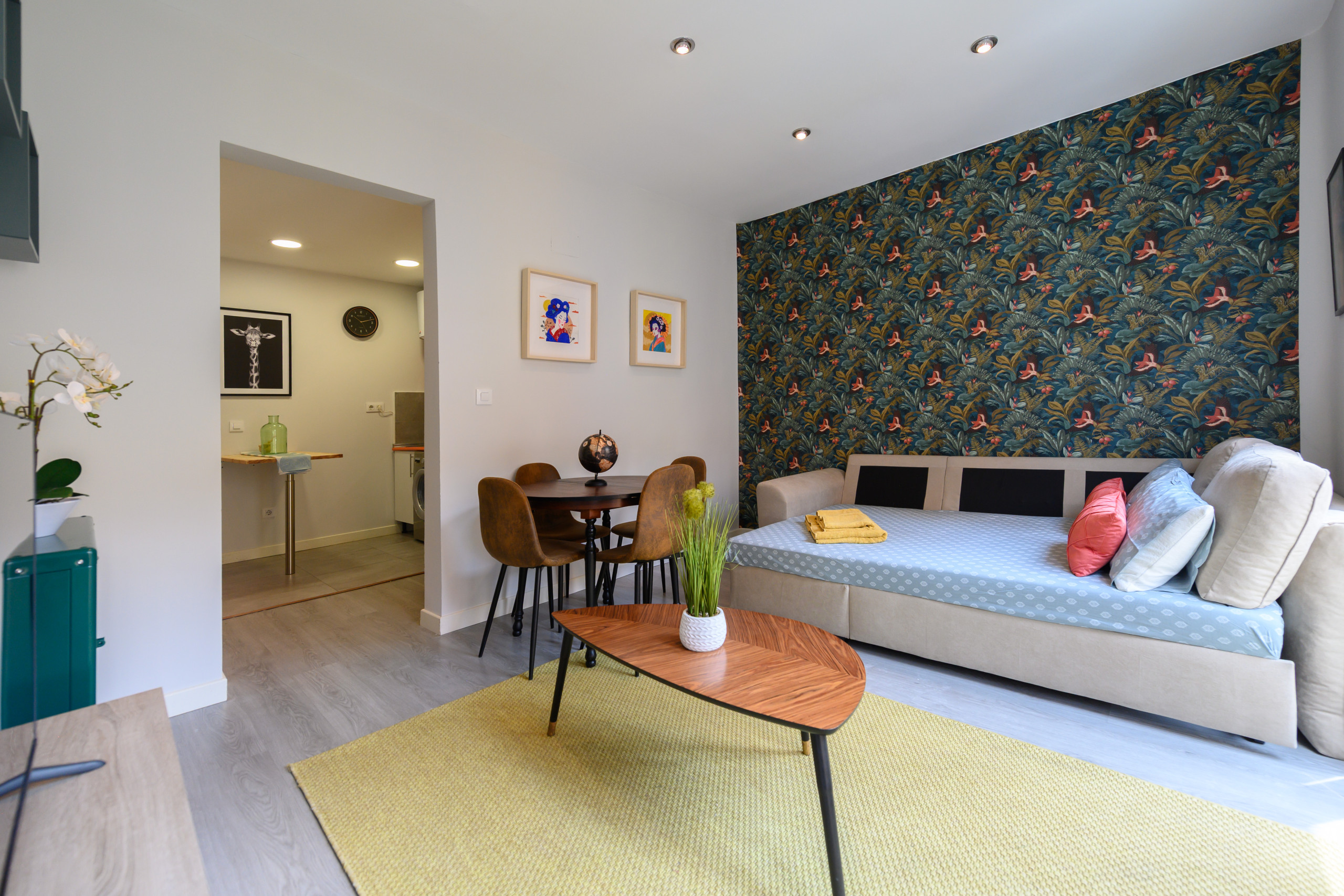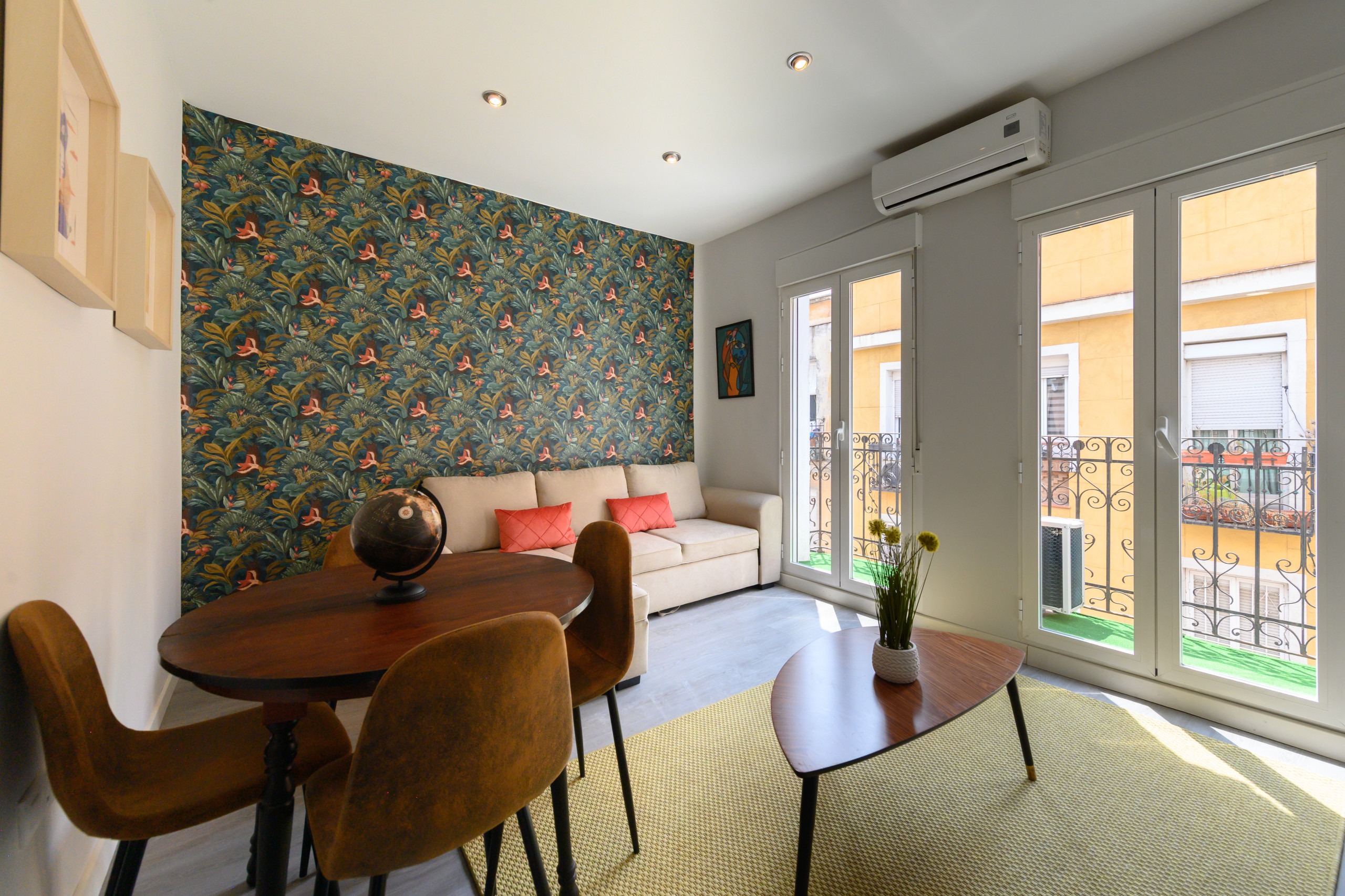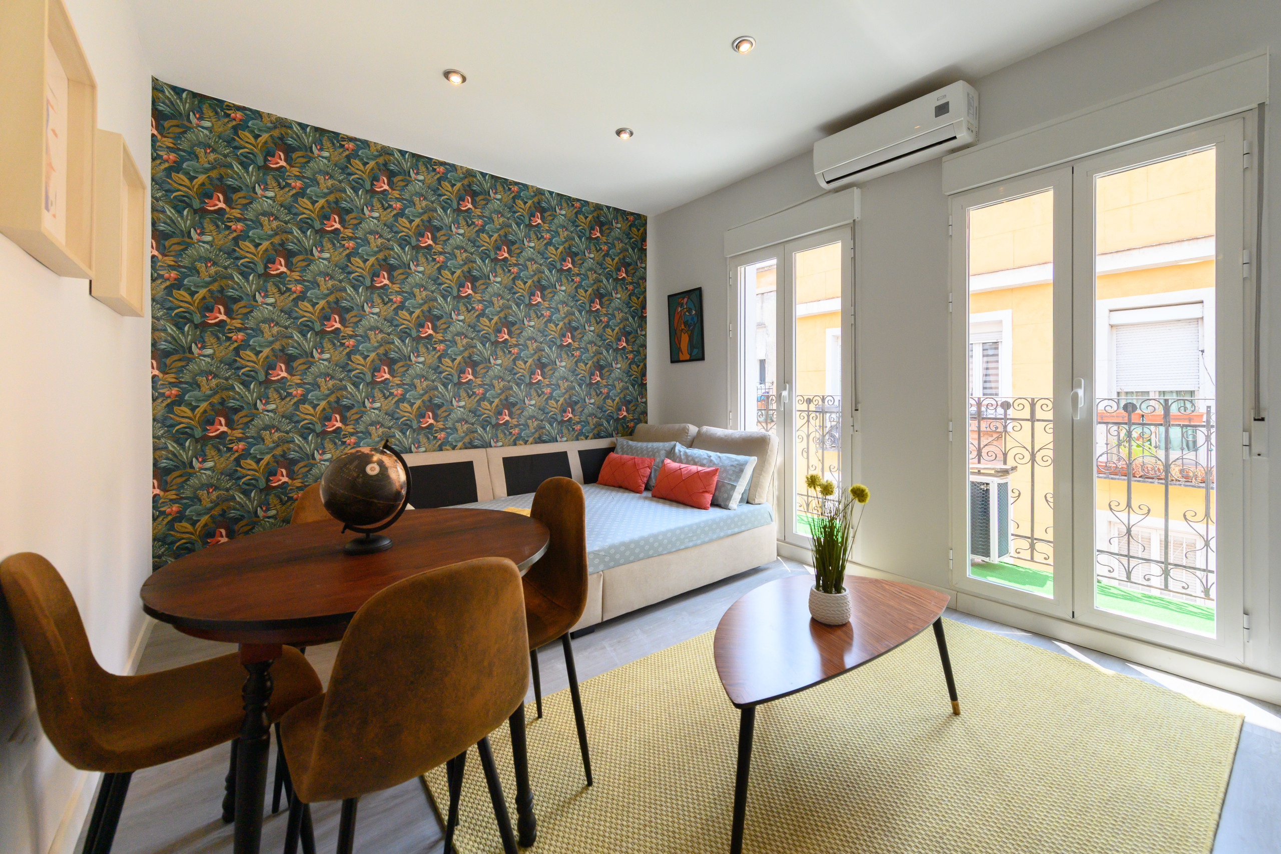 El salón amplio y luminoso, decorado con gusto y pensado para el descanso. Un gran ventanal con acceso al balcón permite la entrada de abundante luz natural, creando un ambiente cálido y acogedor durante todo el día. El salón está equipado con un cómodo sofá cama, ideal para huéspedes adicionales, una mesa de comedor para hasta 4 personas y un aire acondicionado que garantiza confort incluso en los días más calurosos del verano.