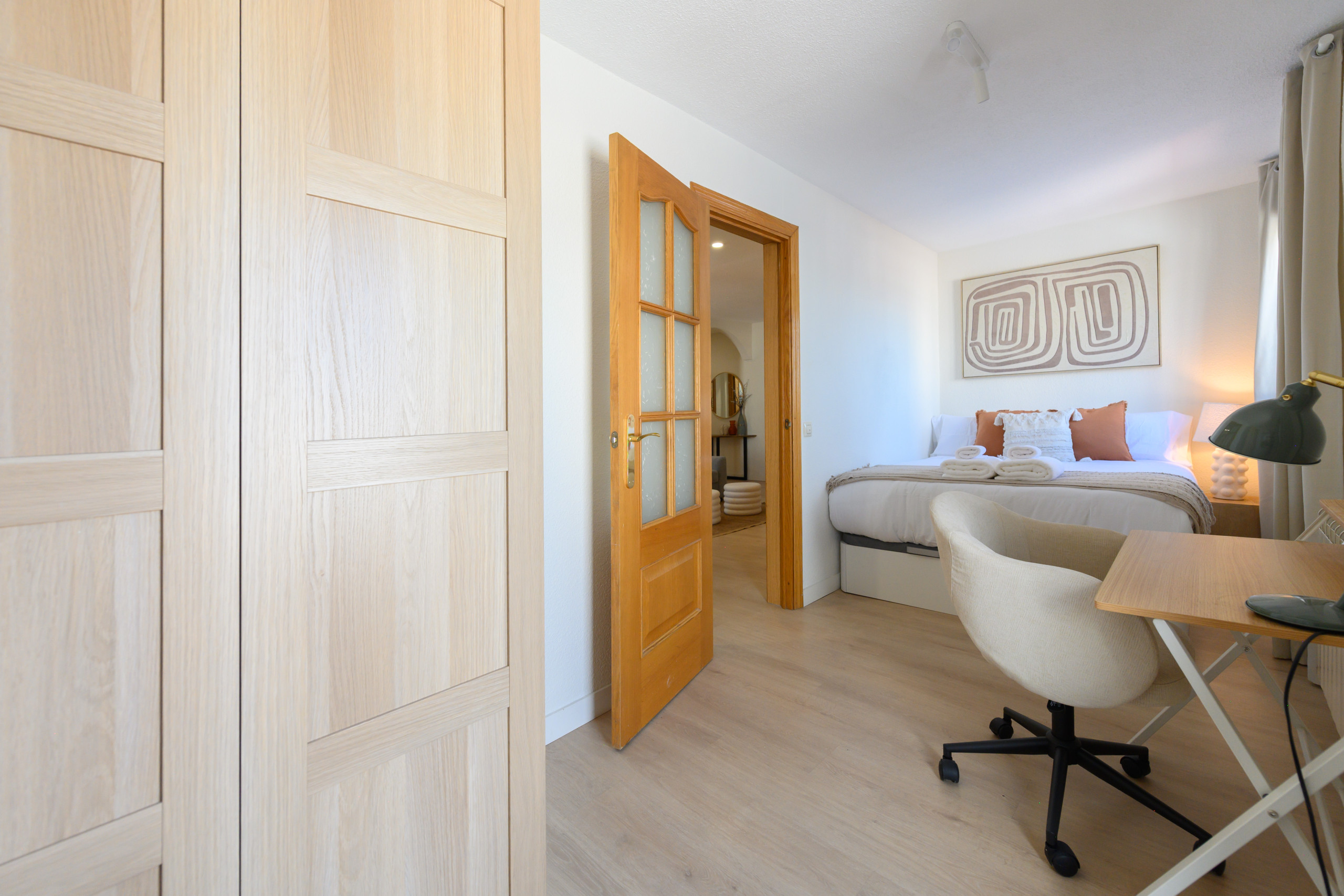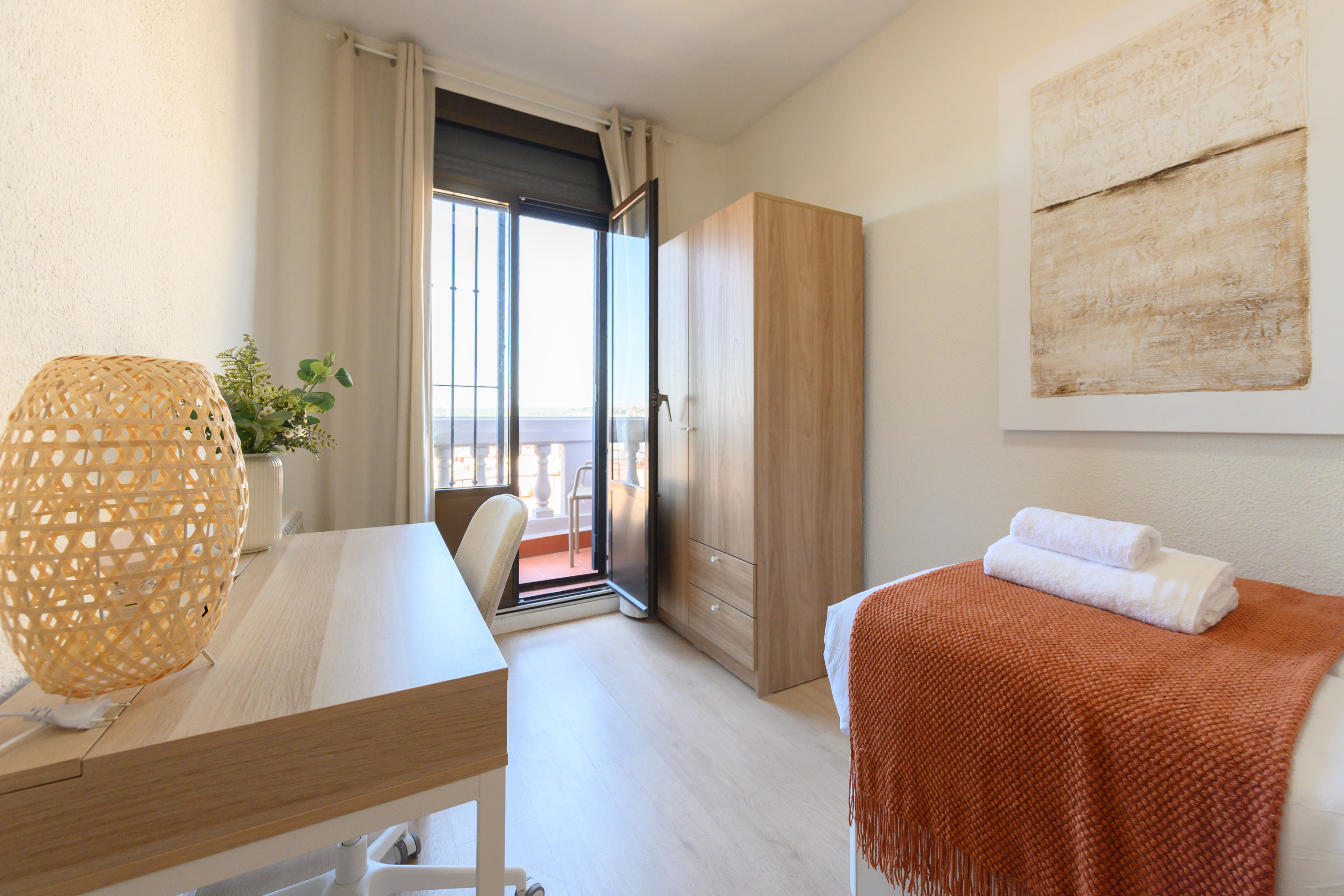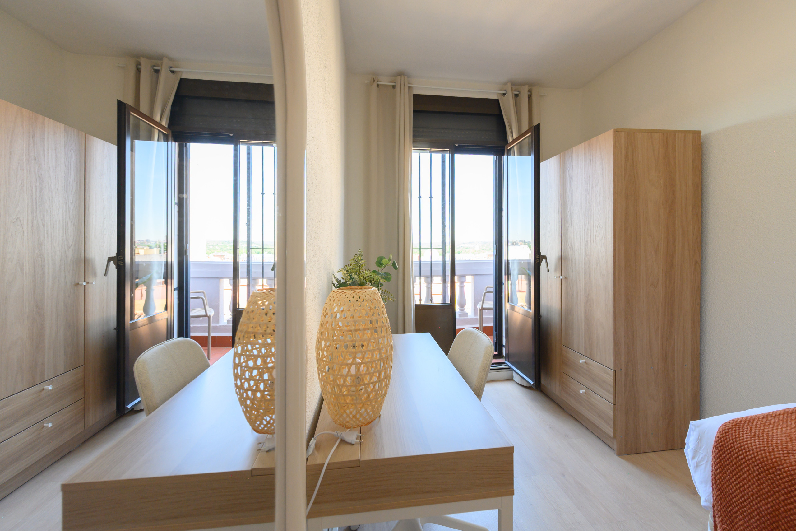 La vivienda cuenta con dos habitaciones bien iluminadas; ambas con escritorio; una de ellas con un acogedor balcón que permite la entrada de luz natural y una cama individual, ideal para relajarse al aire libre, y la otra con una cama matrimonial, una amplia terraza equipada con mobiliario, perfecta para disfrutar de un café por la mañana o una cena al aire libre.
