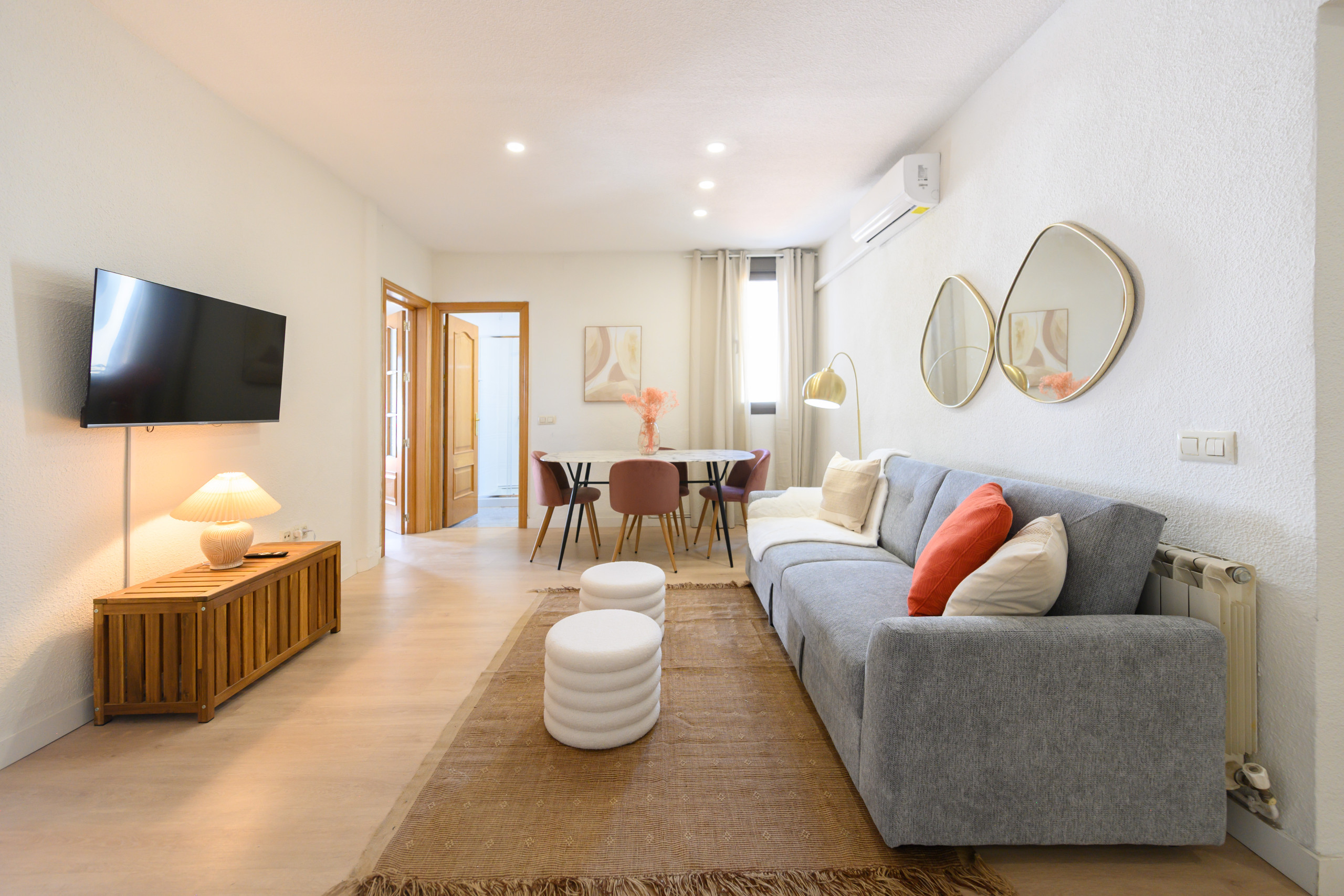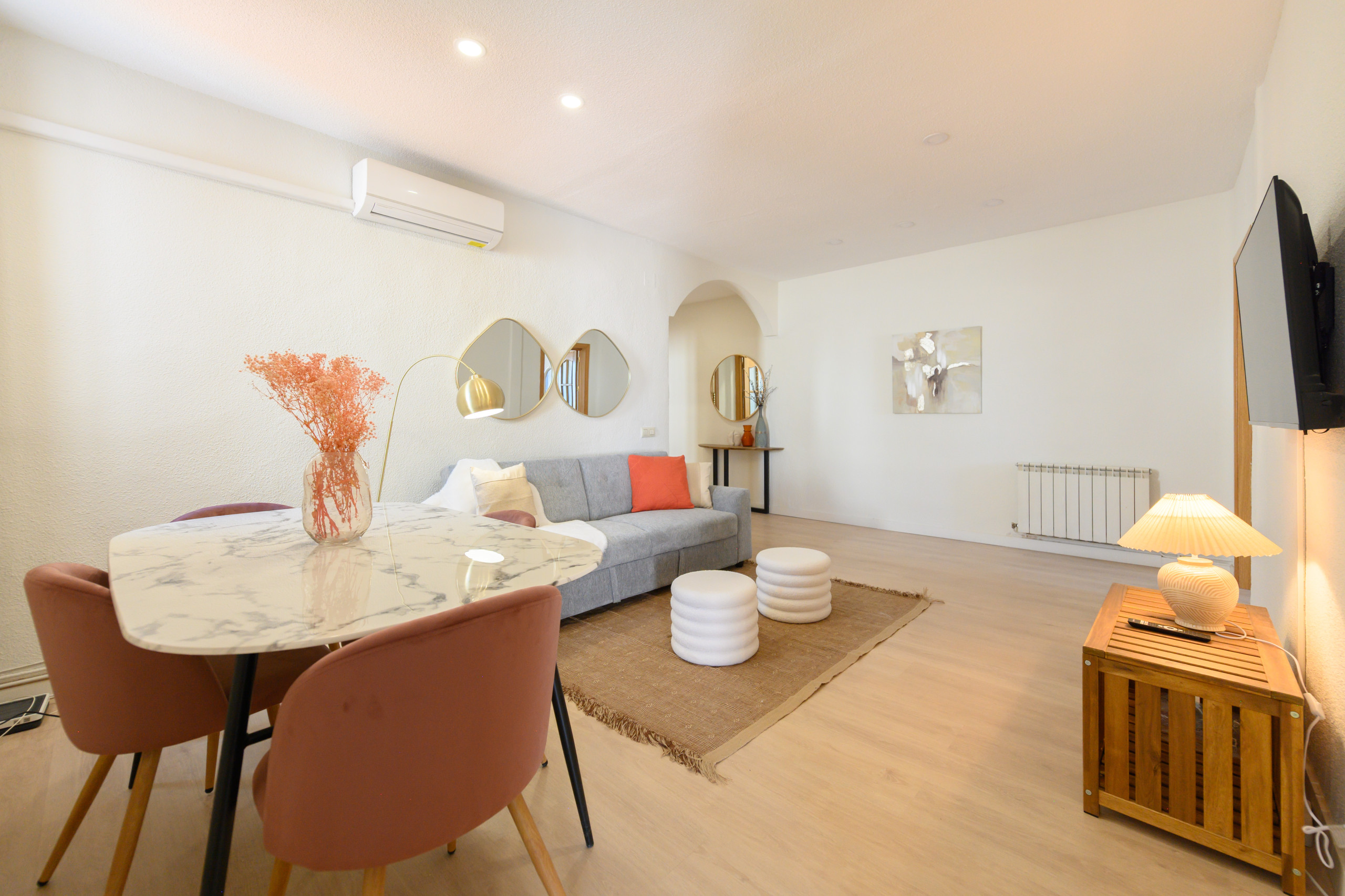 La zona de salón-comedor es un espacio cálido y versátil, amueblado con un cómodo sofá cama, ideal para recibir visitas o disfrutar de momentos de descanso, Además, dispone de una mesa de comedor que permite disfrutar cómodamente de las comidas diarias o de cenas con invitados.