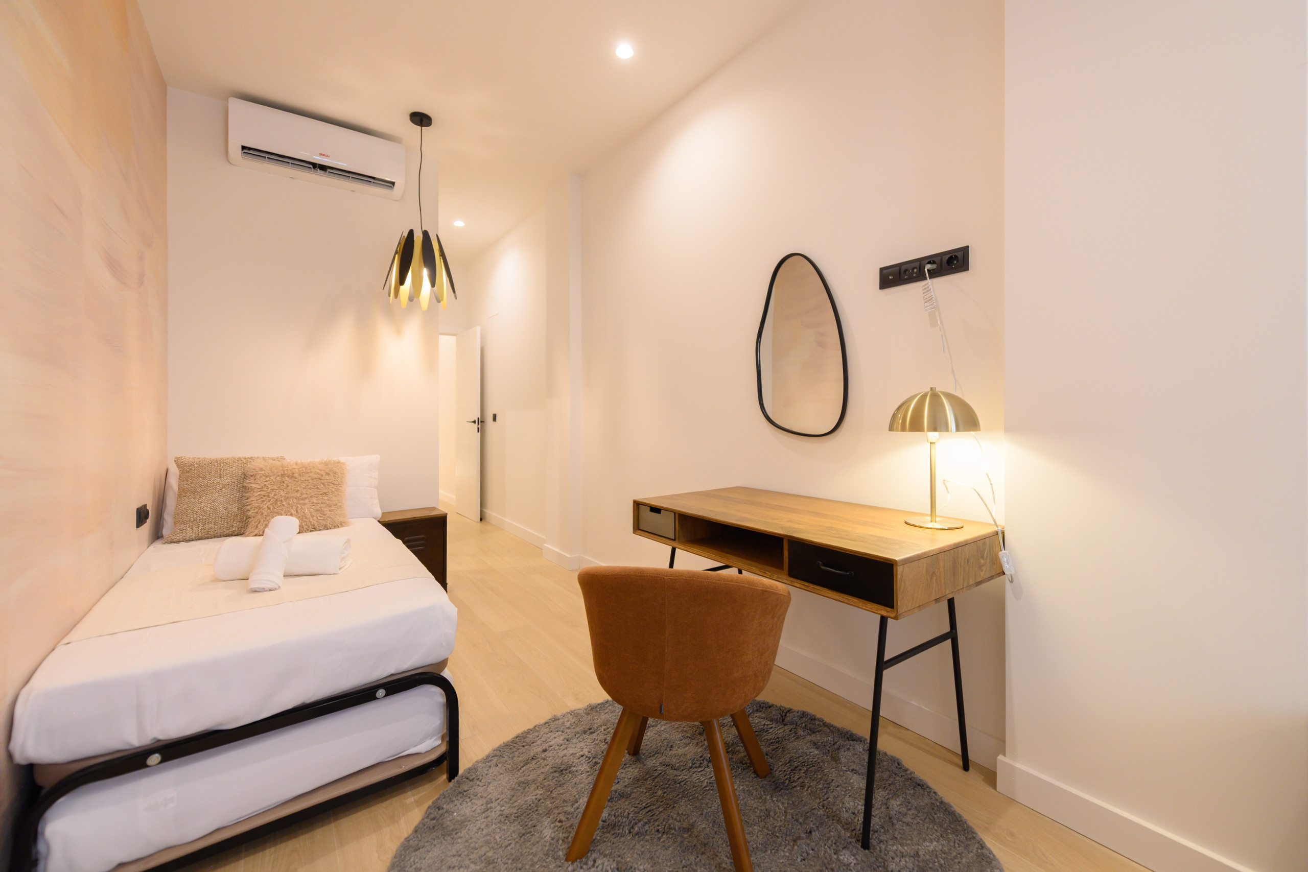 o Un tercer dormitorio ideal para familias o grupos, con tres camas individuales, un escritorio y acceso a un baño completo con plato de ducha.