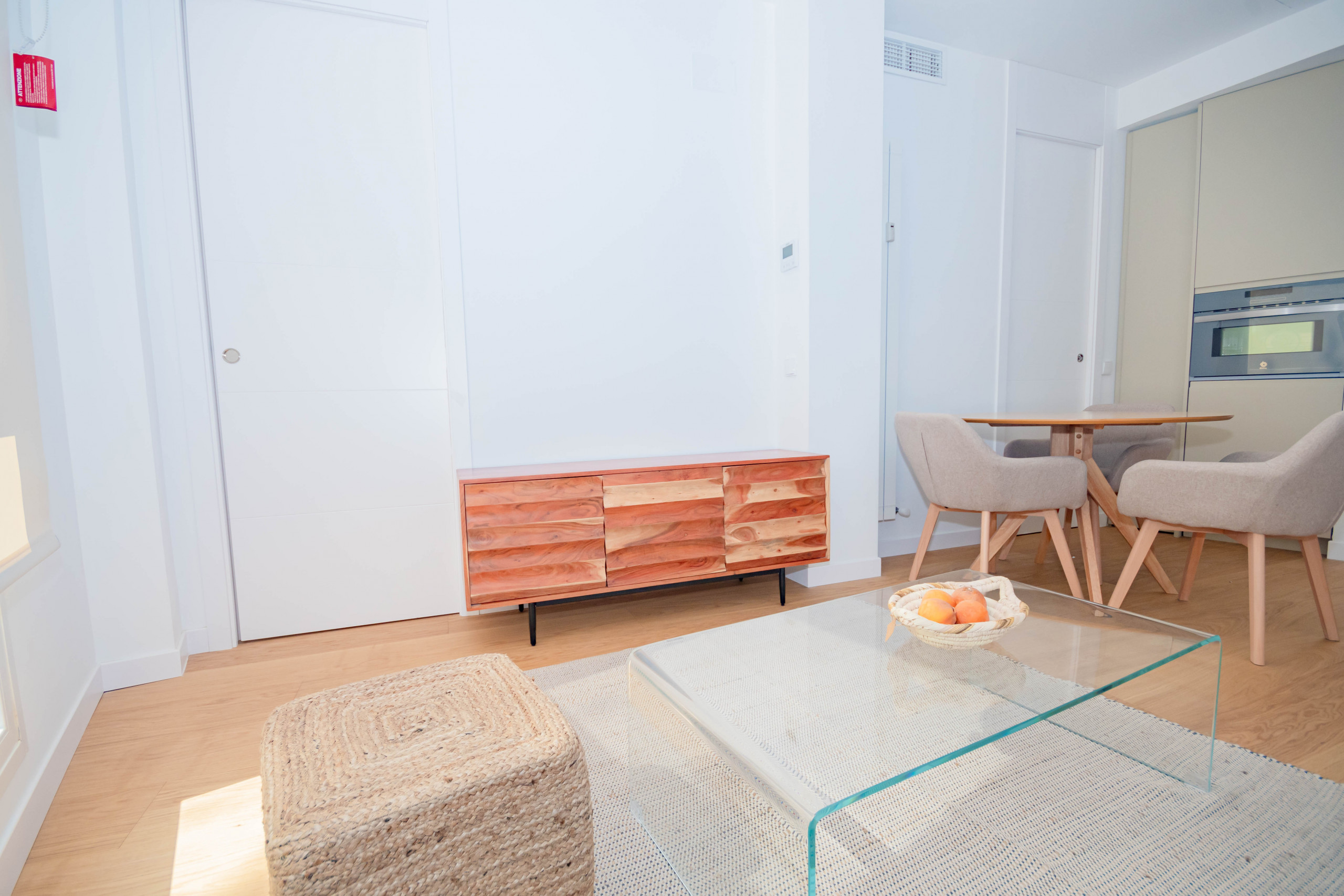 El salón cuenta con un sofá cama individual, perfecto para una persona adicional. Además, cuenta con una mesa de centro, una televisión de pantalla plana y un mueble de almacenamiento. La decoración es moderna, sencilla y acogedora, ideal para relajarse después de un día por la ciudad.