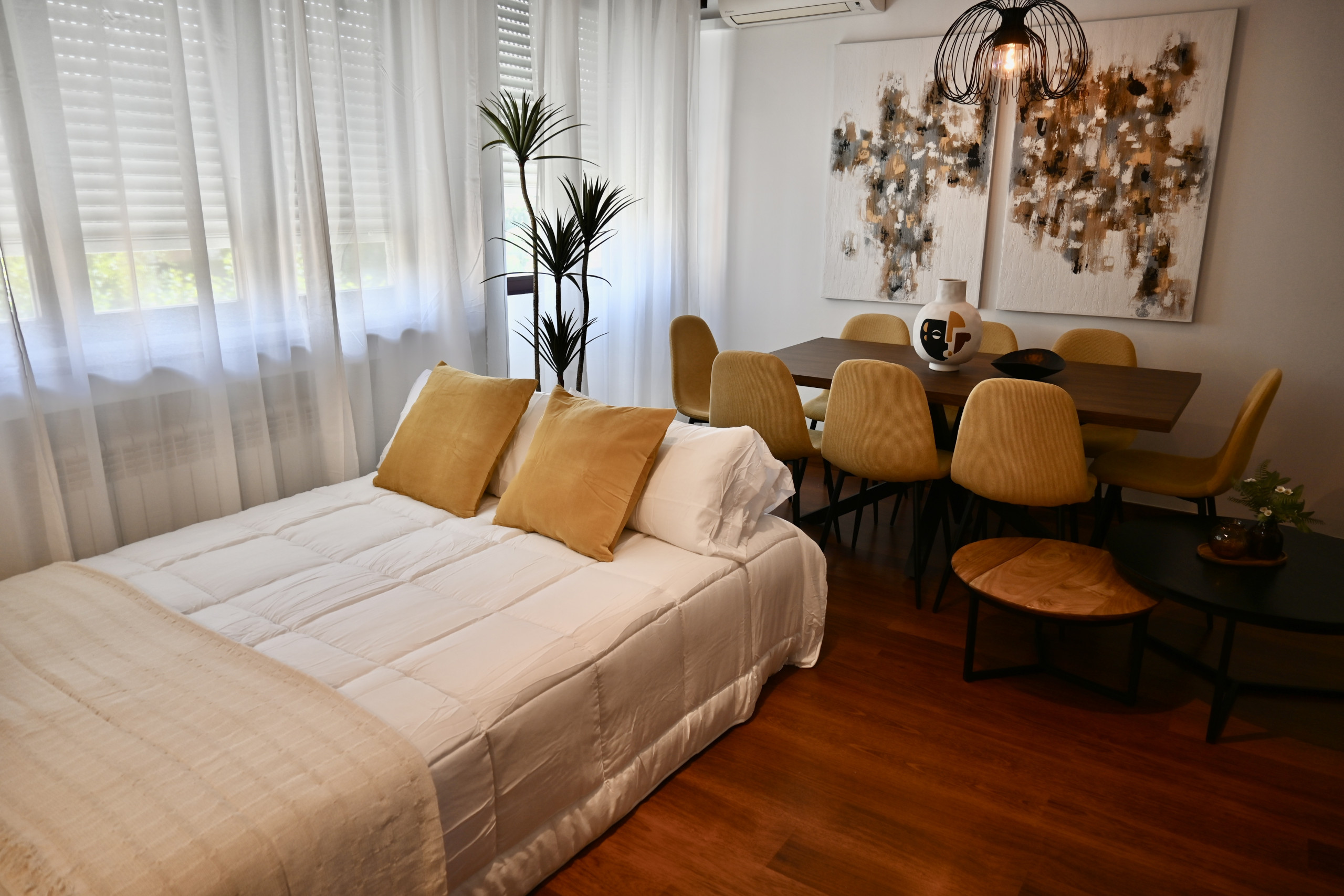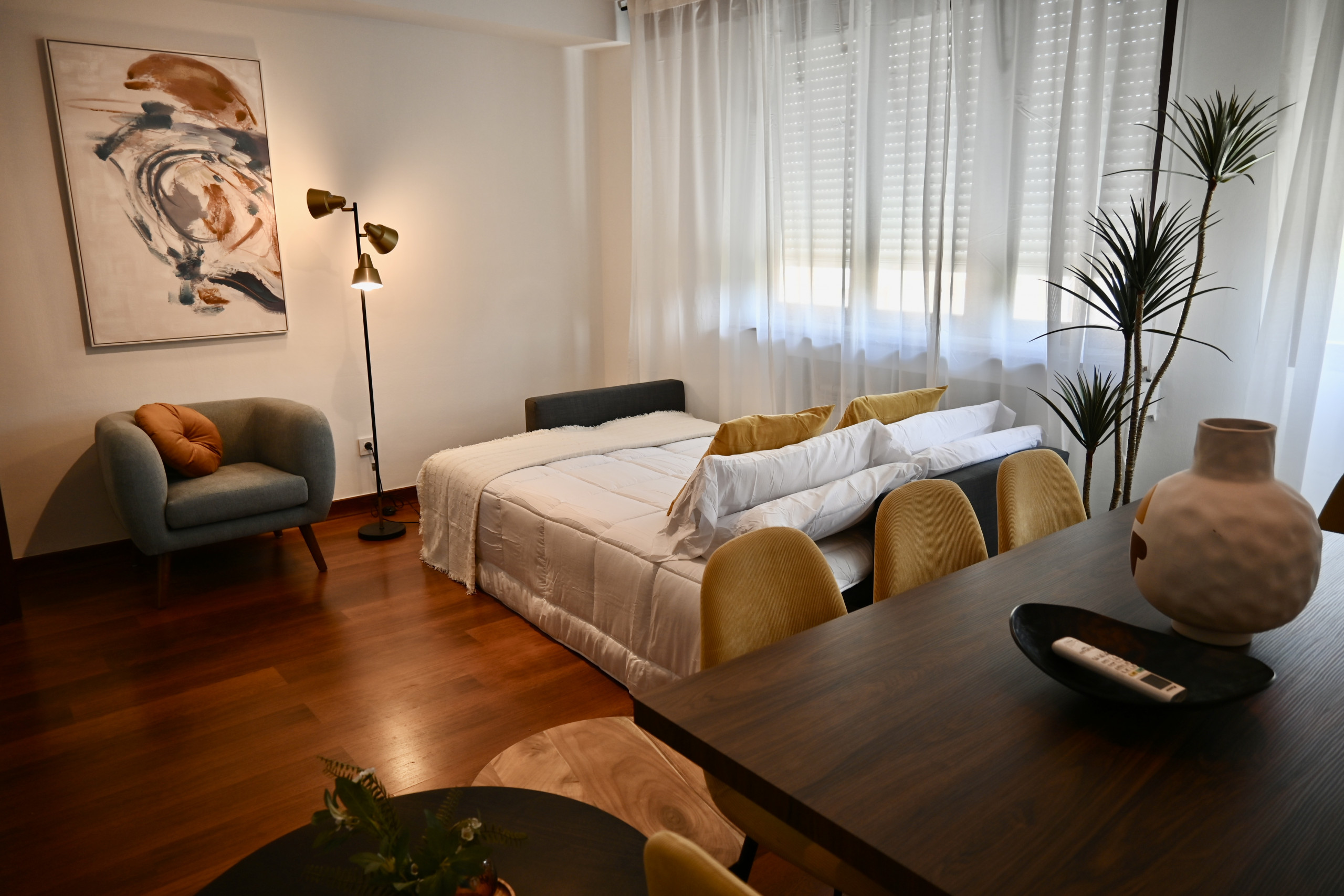 Al ingresar a la vivienda, te encuentras con un amplio salón comedor que irradia luz natural gracias a las hermosas vistas que ofrece. Grandes ventanales que permite disfrutar de vistas panorámicas impresionantes de la ciudad o el paisaje circundante. Este espacio también cuenta con un sofá cama, lo que lo convierte en un lugar versátil para recibir a huéspedes adicionales o relajarte mientras contemplas el entorno.