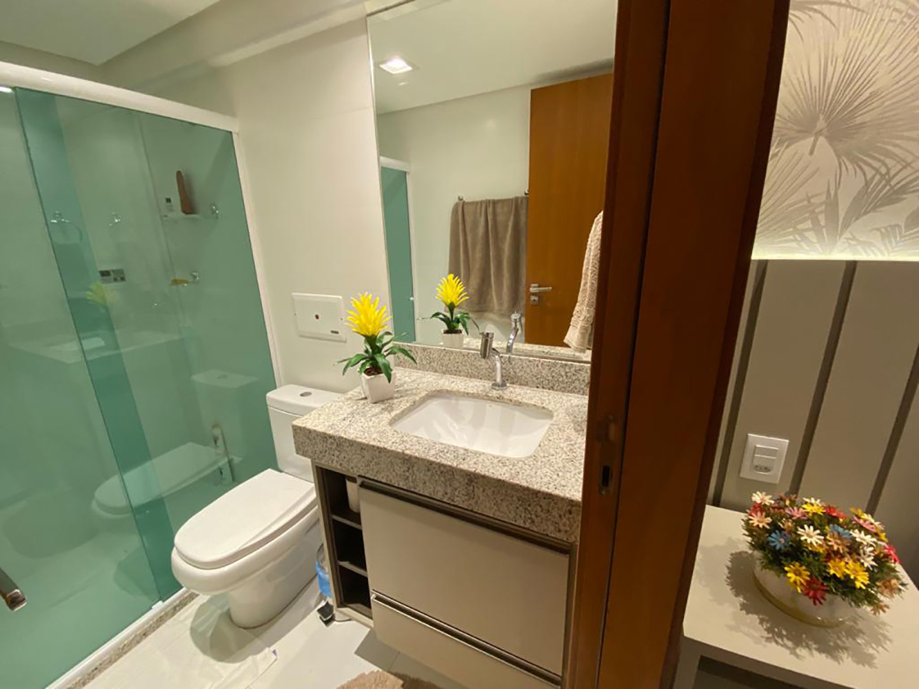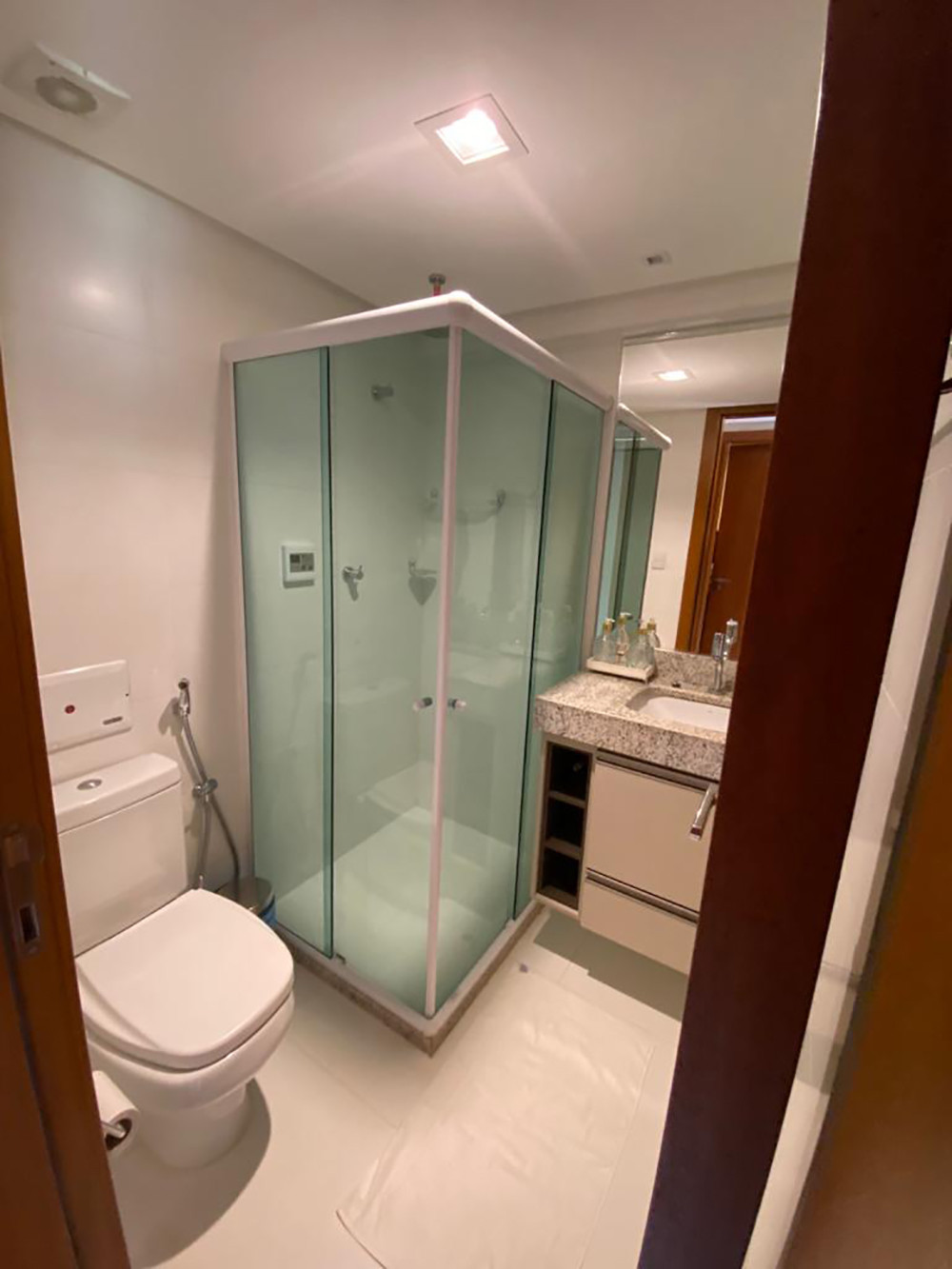 - Os dois banheiros do apartamento têm chuveiro elétrico, box de vidro e espelho.