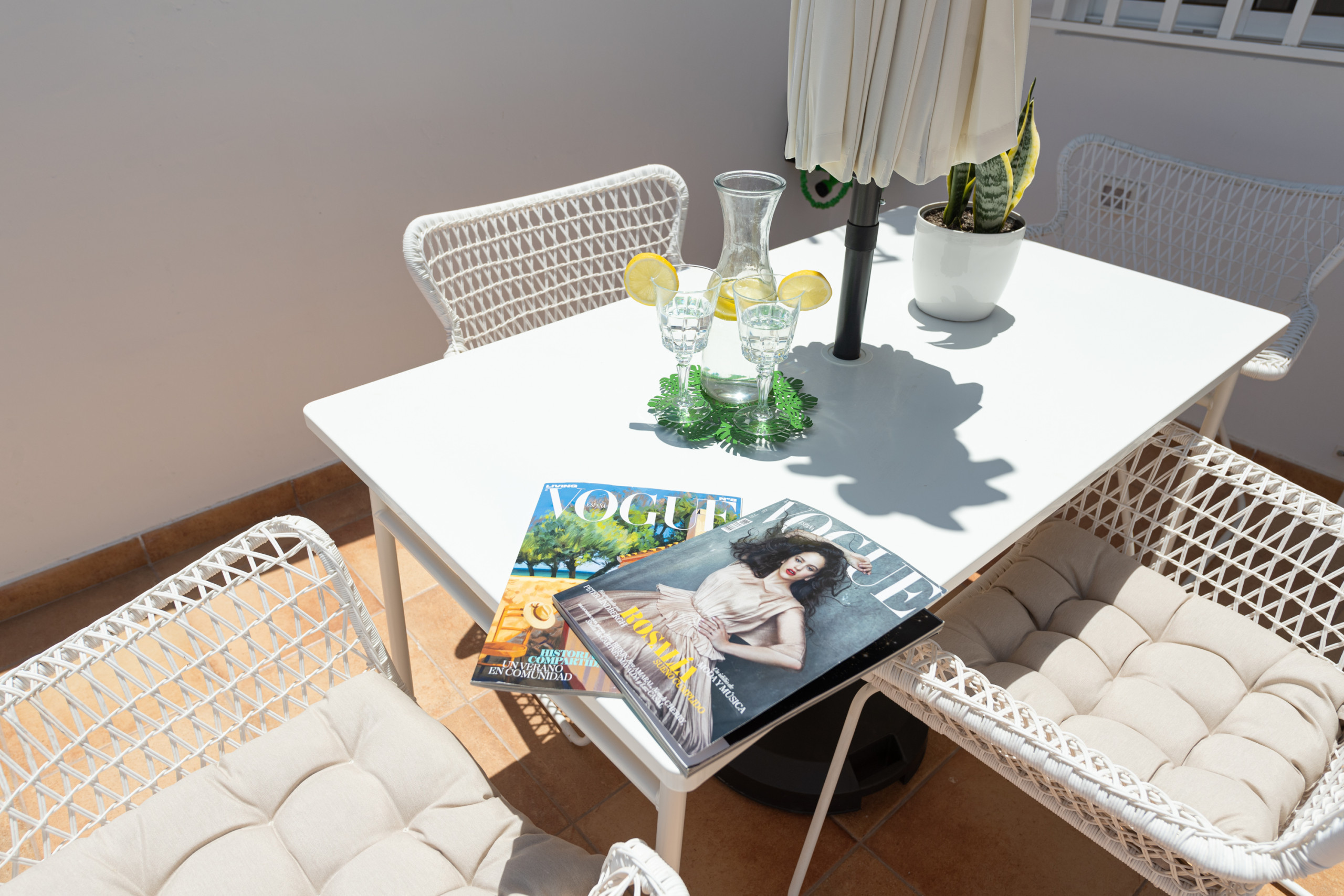 Uno de los mayores atractivos del apartamento es su terraza privada de 22 m², con vistas al mar y a la montaña, equipada con tumbonas, mesa exterior, perfecta para relajarse, disfrutar del atardecer o compartir una comida al aire libre.