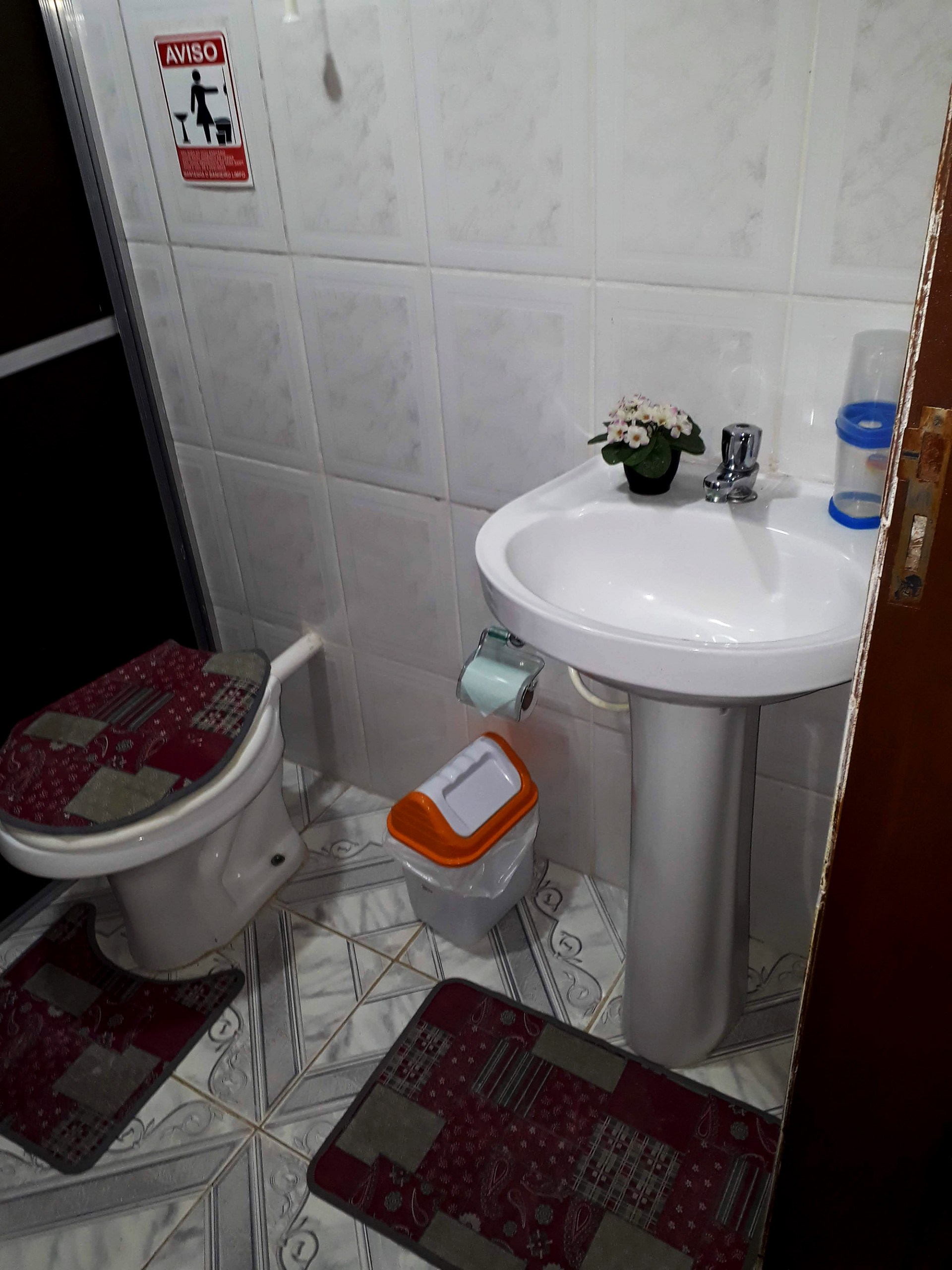 O banheiro privativo está equipado com chuveiro elétrico e box de vidro / acrílico.