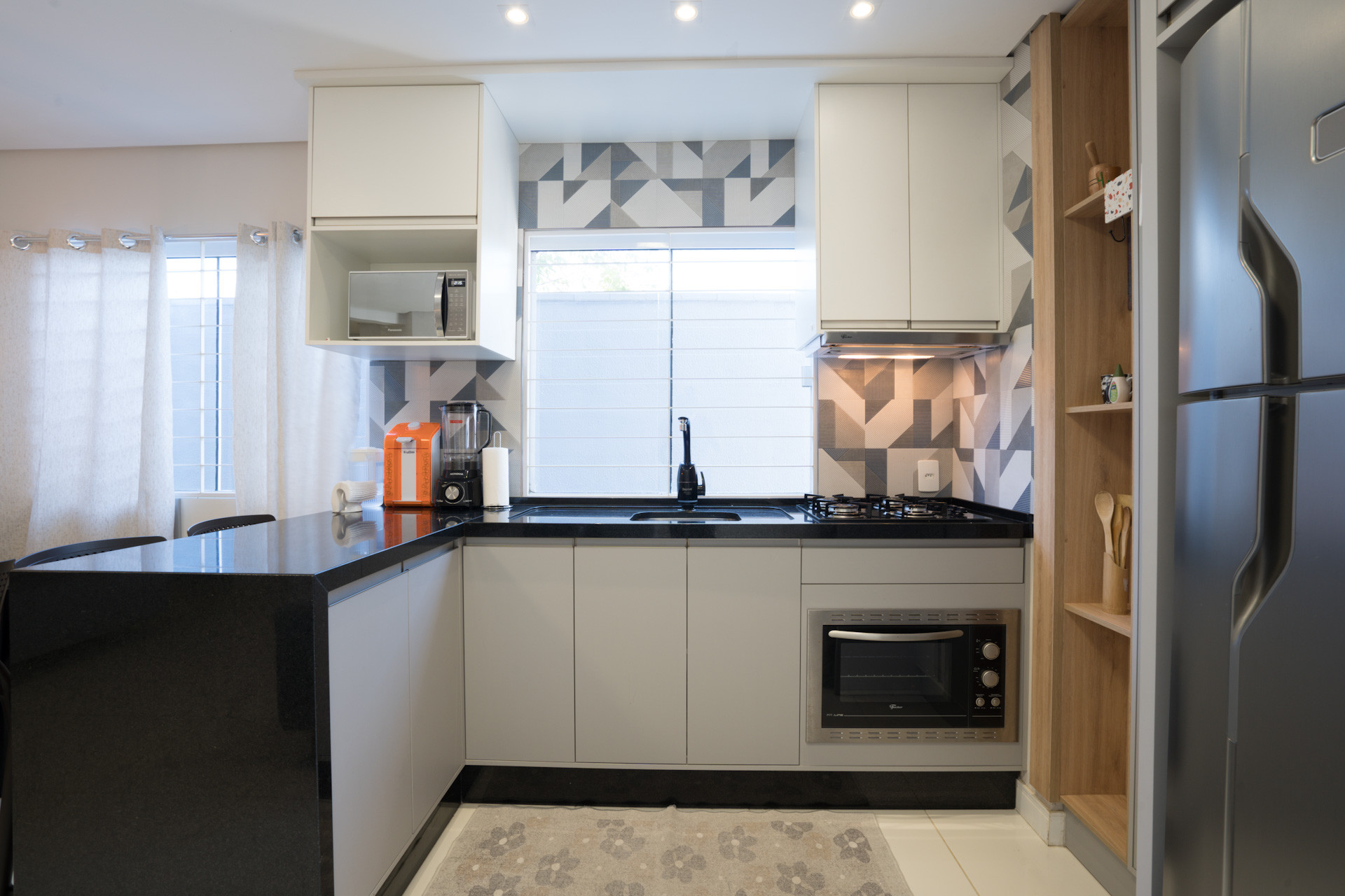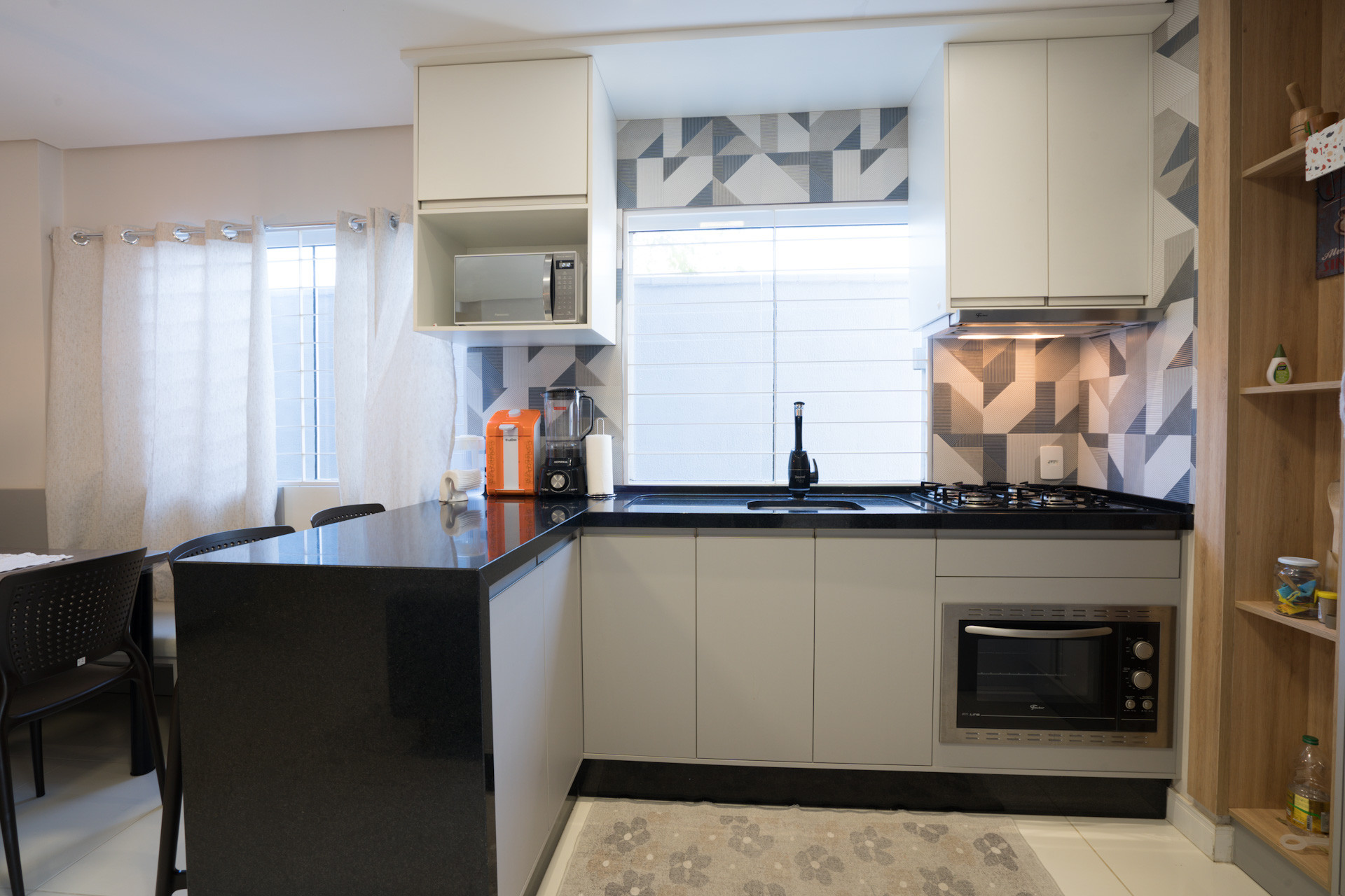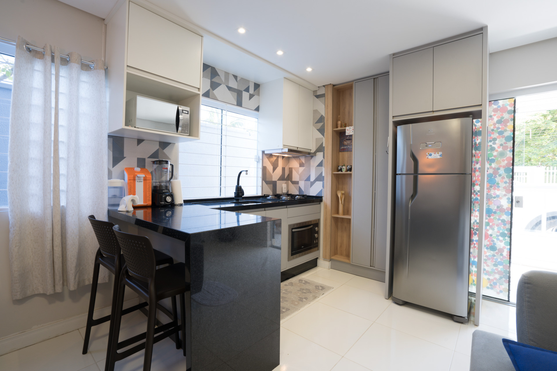 - Cozinha americana com cooktop, exaustor, forno elétrico, geladeira, micro-ondas, lava-louças, liquidificador, panelas, louças e utensílios