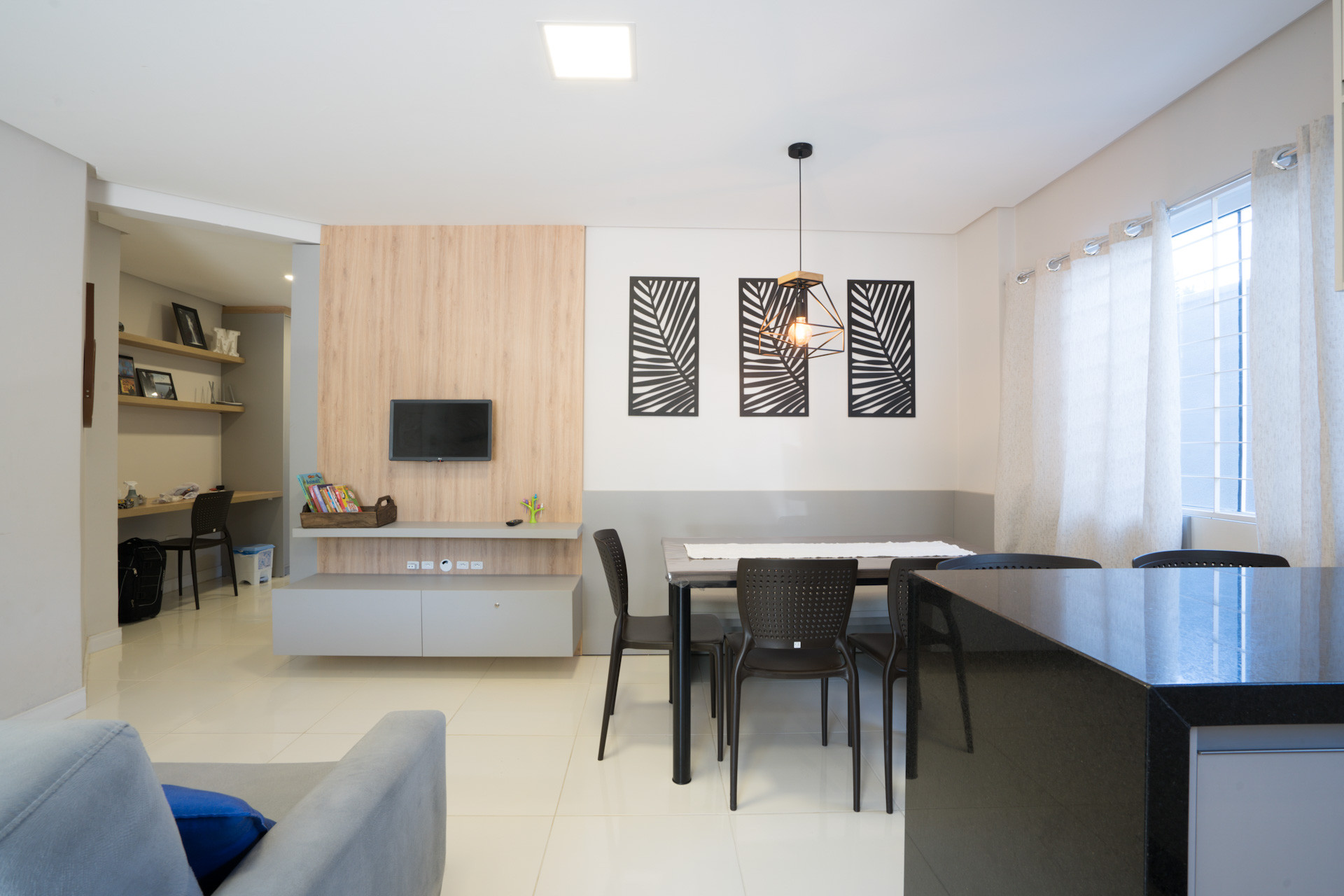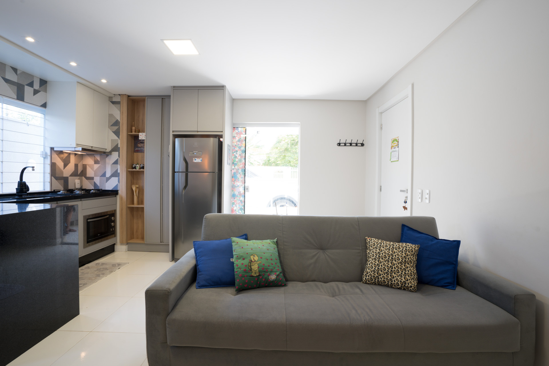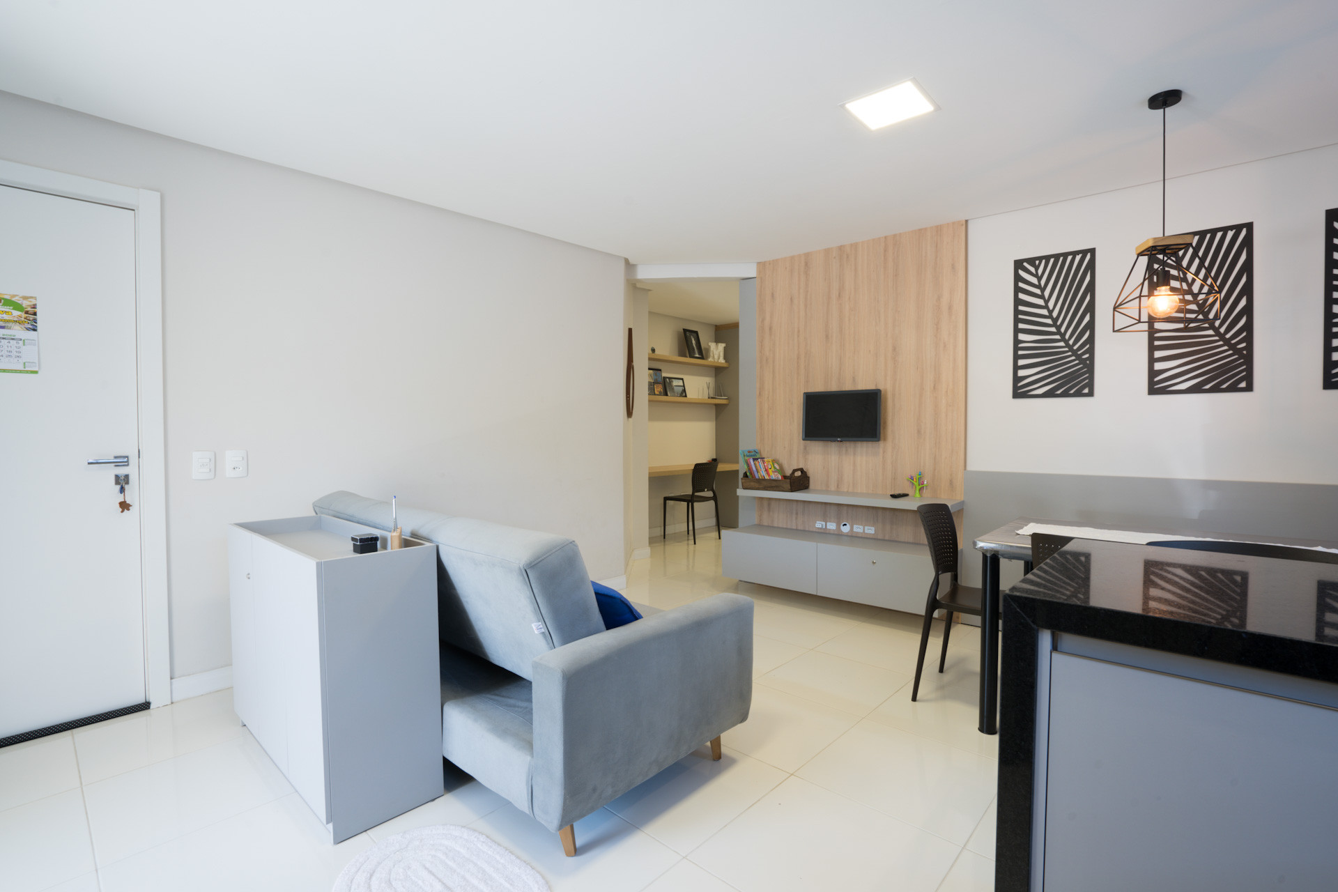 - Cozinha americana com cooktop, exaustor, forno elétrico, geladeira, micro-ondas, lava-louças, liquidificador, panelas, louças e utensílios