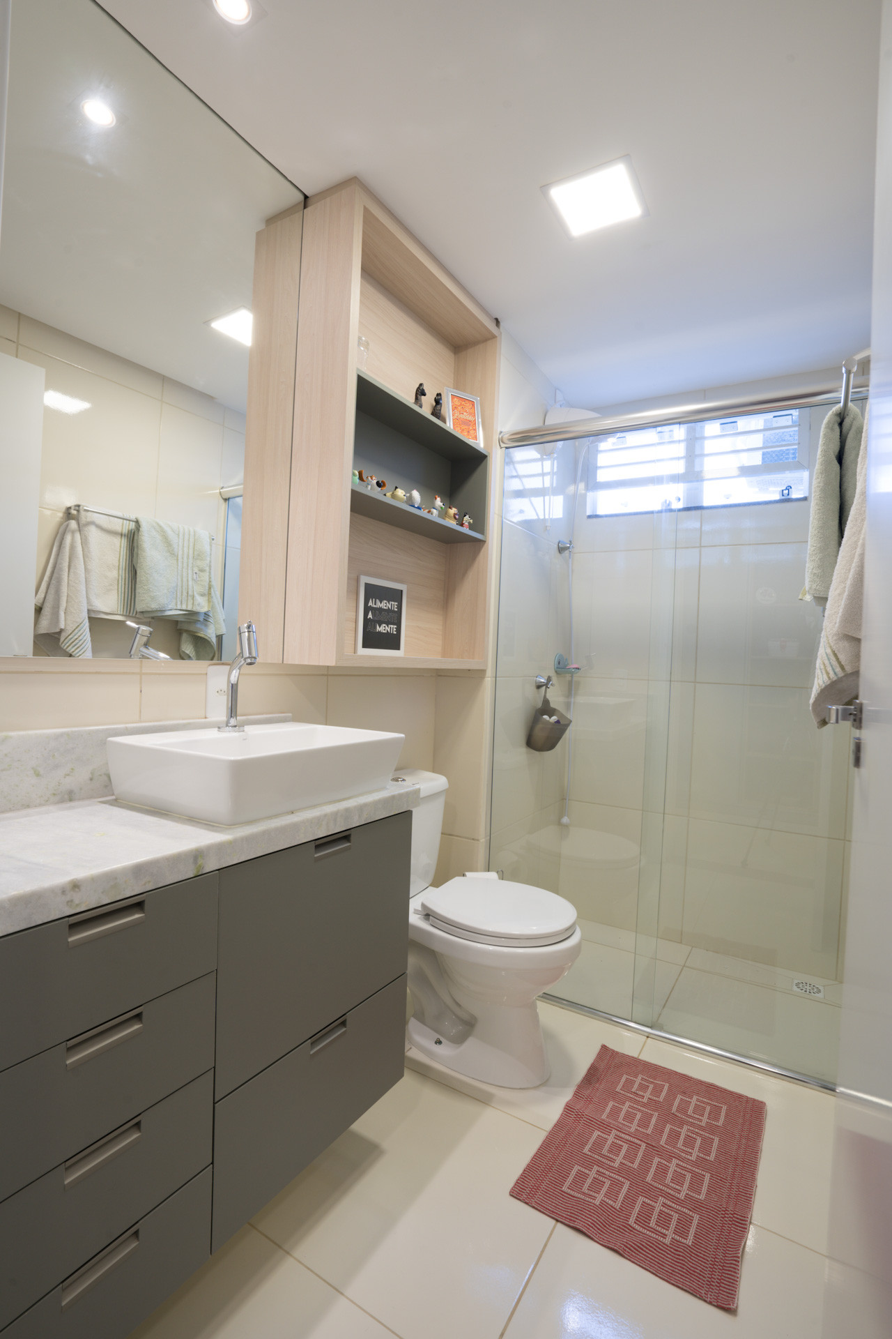 - Banheiros com chuveiro elétrico, box de vidro, armário e espelho