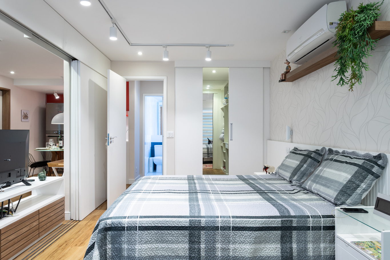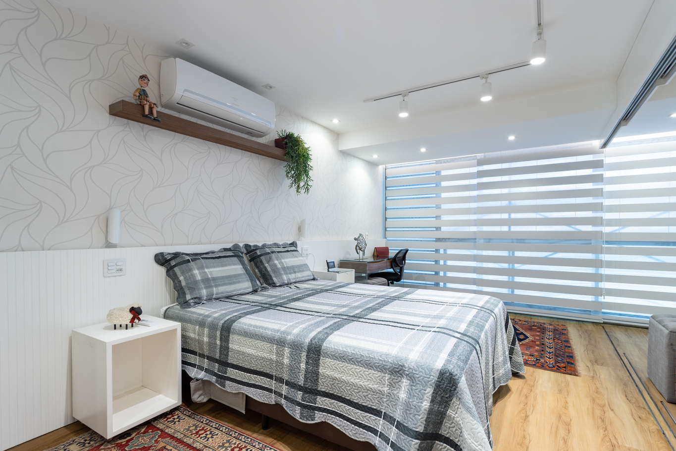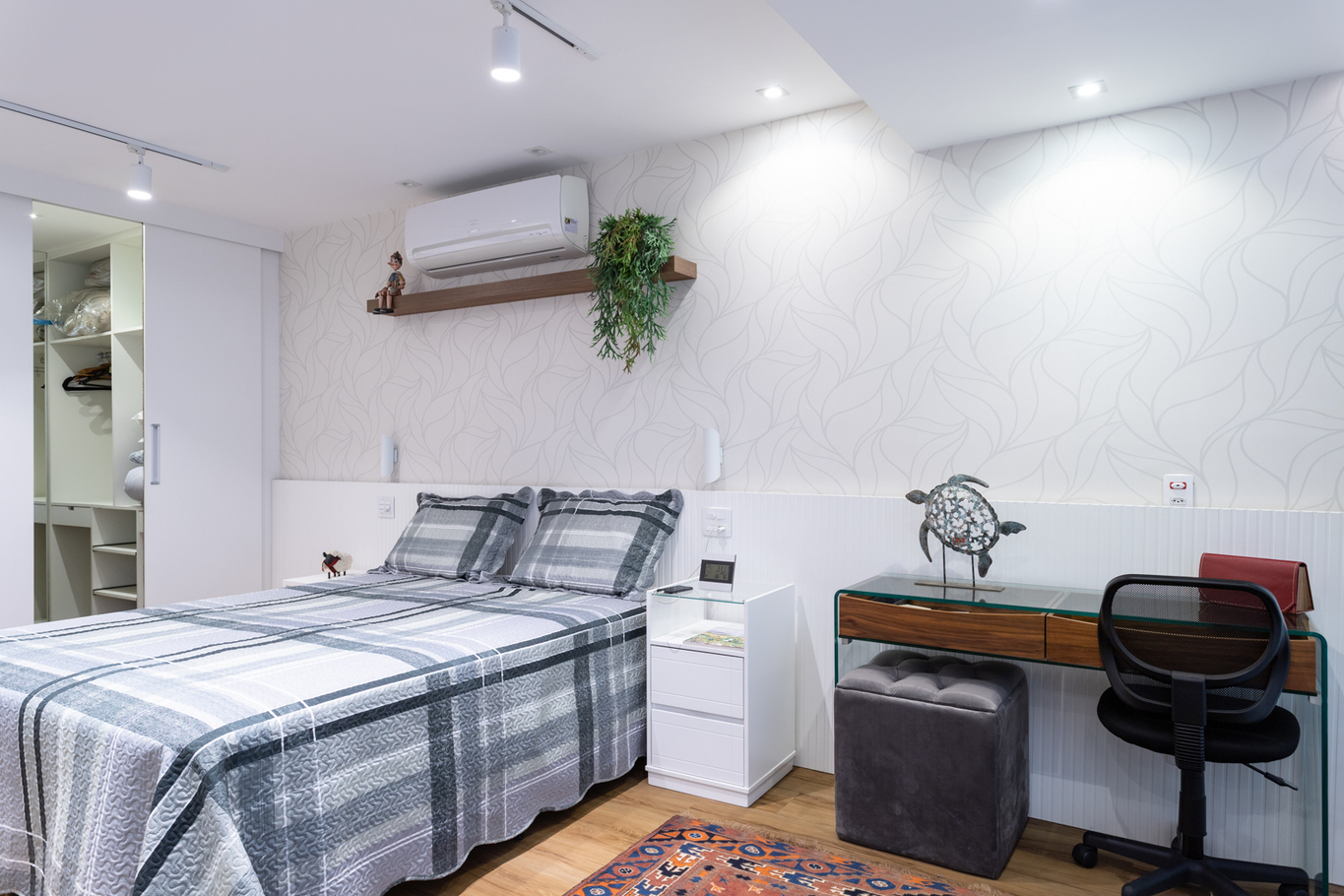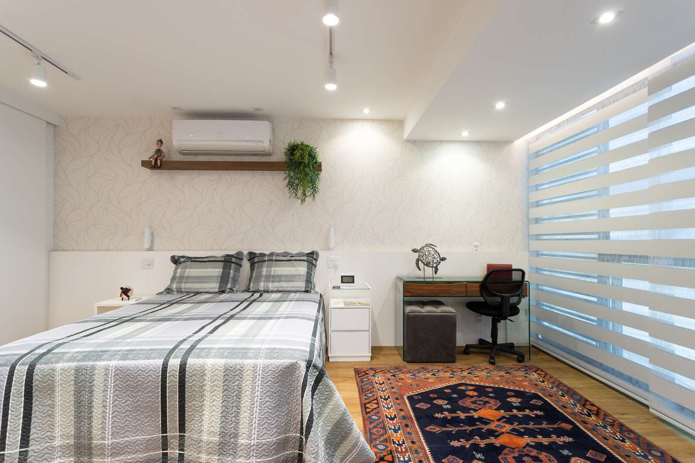 - Habitación 2 con cama queen, aire acondicionado, smart TV, mesa de trabajo, vestidor, alfombra, cortinas y puerta corredera para mayor privacidad
