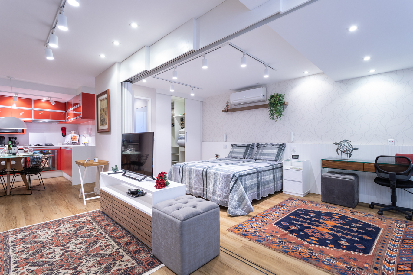 - Sala cómoda con sofá, smart TV, aire acondicionado, cuadros decorativos y pequeño armario con utensilios de uso diario