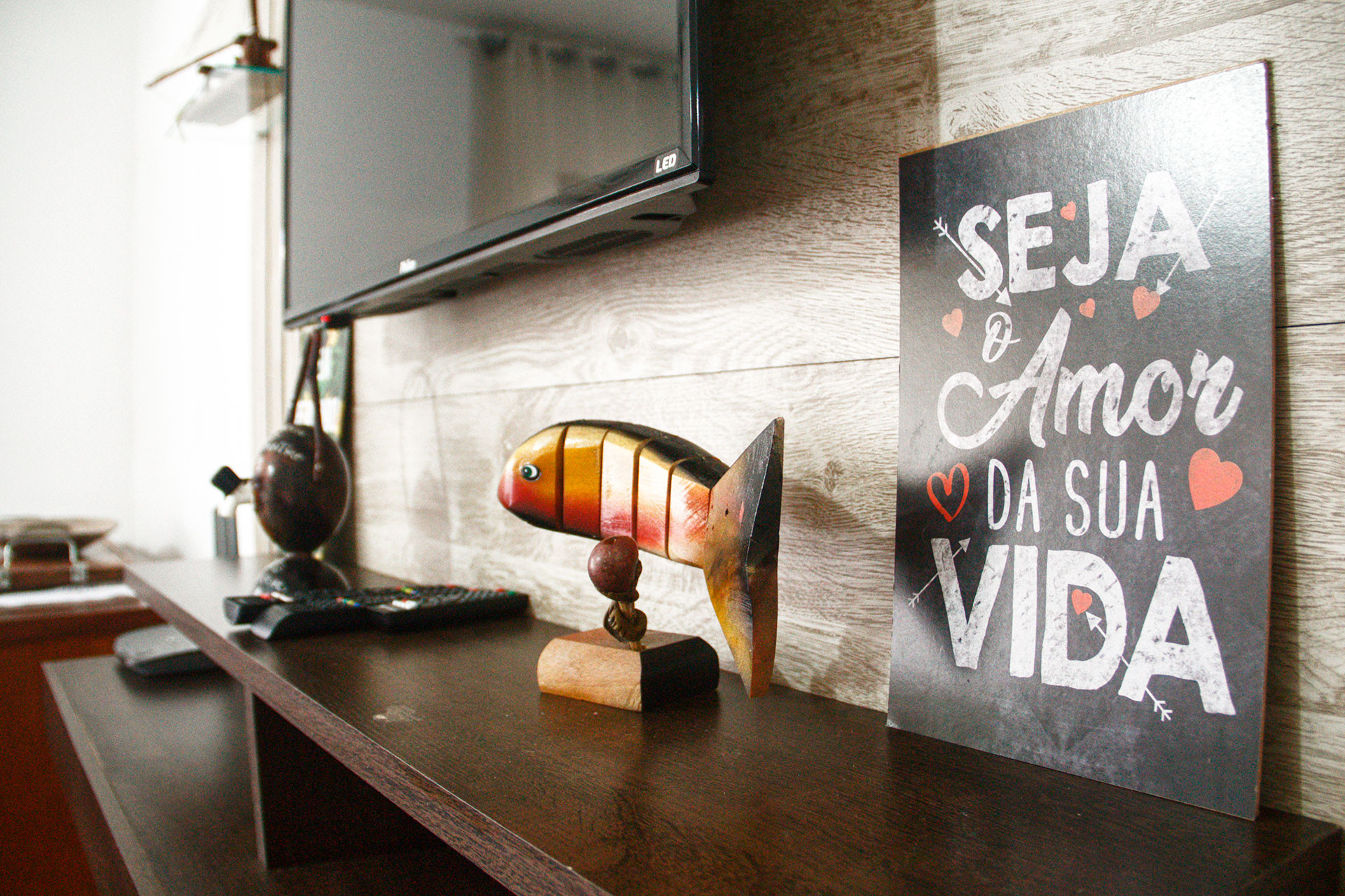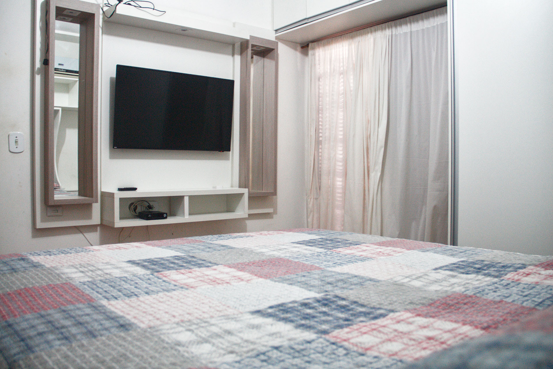 - Suíte com cama de casal, Smart TV, armário, chuveiro elétrico e box de vidro