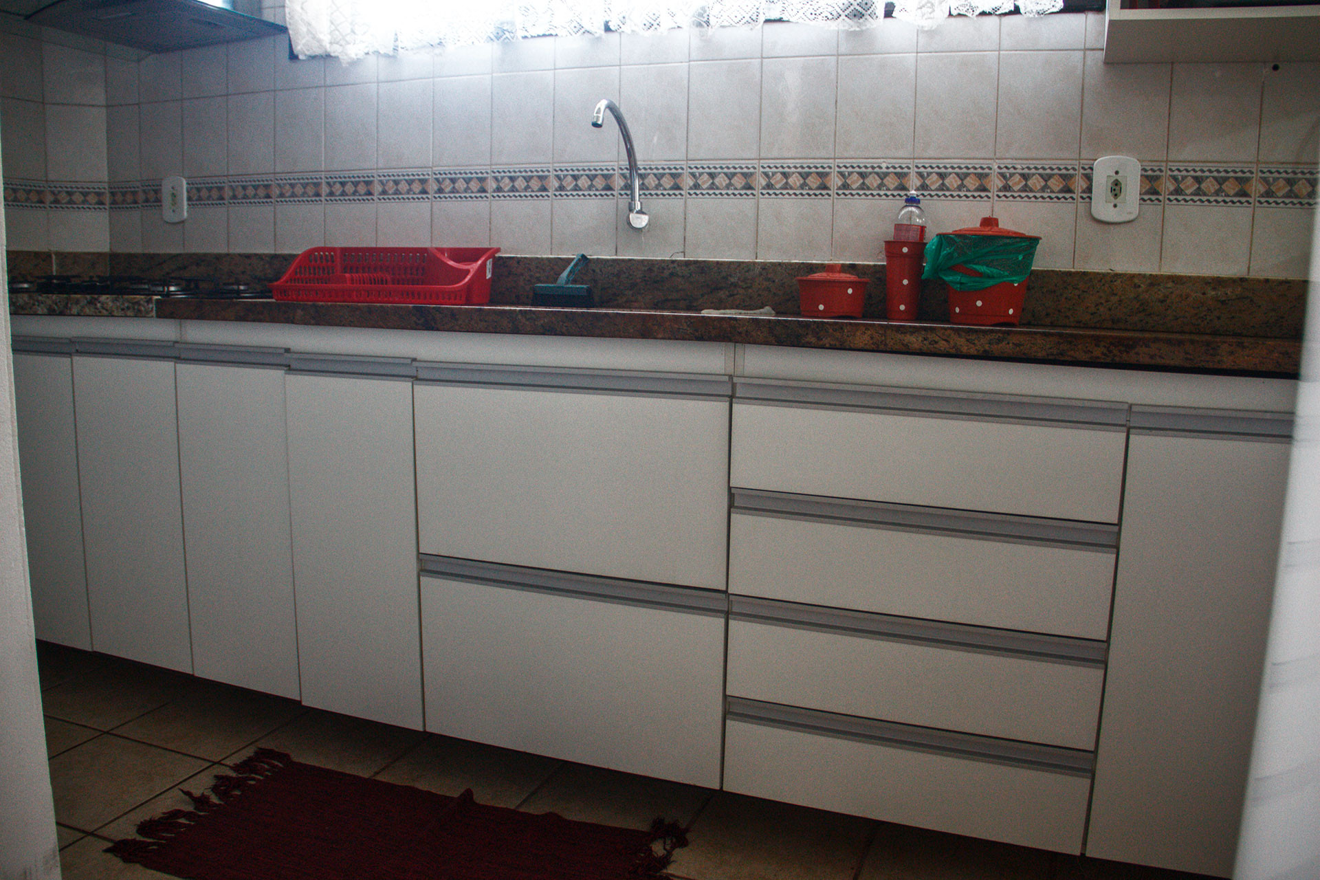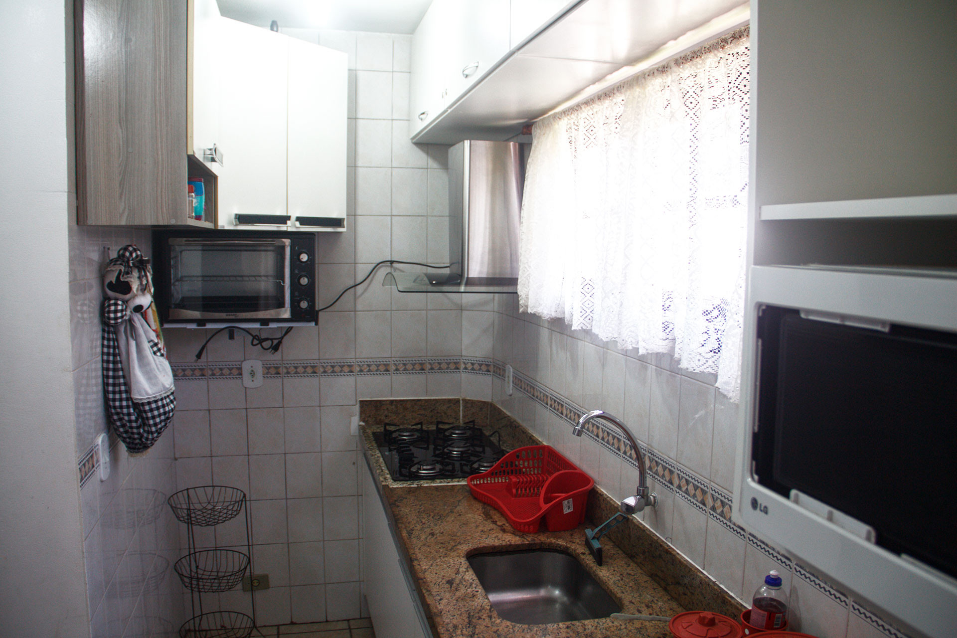- Cozinha americana com cooktop, geladeira, micro-ondas, forno elétrico, liquidificador, cafeteira elétrica, sanduicheira, panelas, louças e utensílios variados