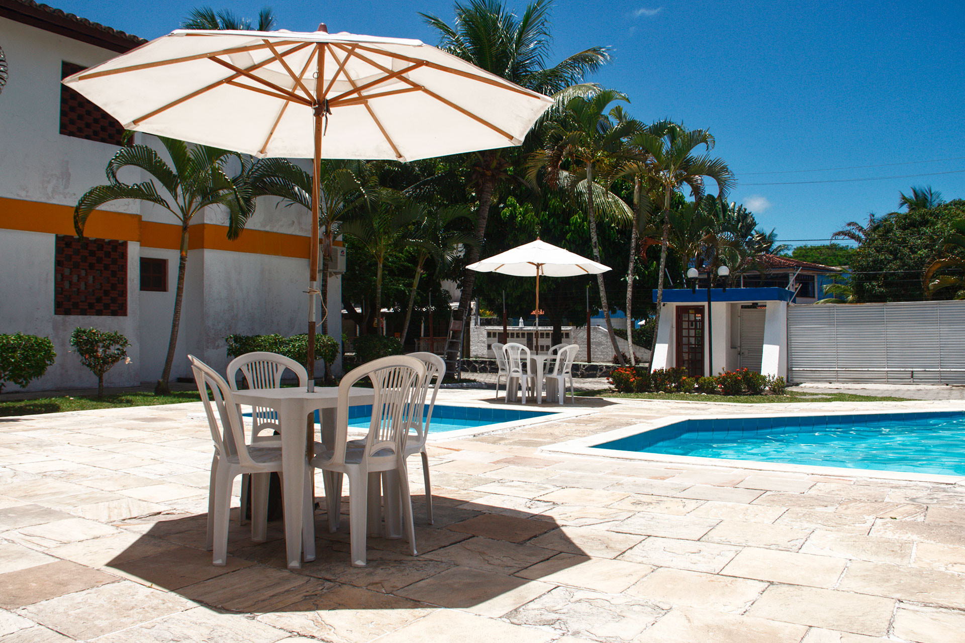 - Espaço com mesa e cadeiras para leituras, de frente para a piscina