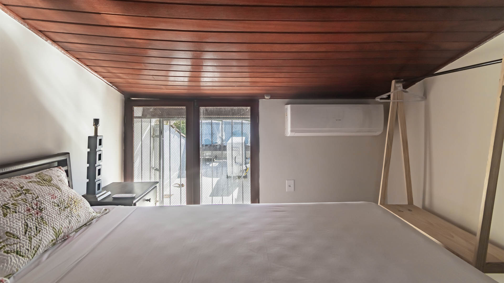 - Habitación/Mezanino: cama de matrimonio cómoda, perchero (caballete) para organizar sus artículos y ropa, edredón, protector de colchón e iluminación acogedora