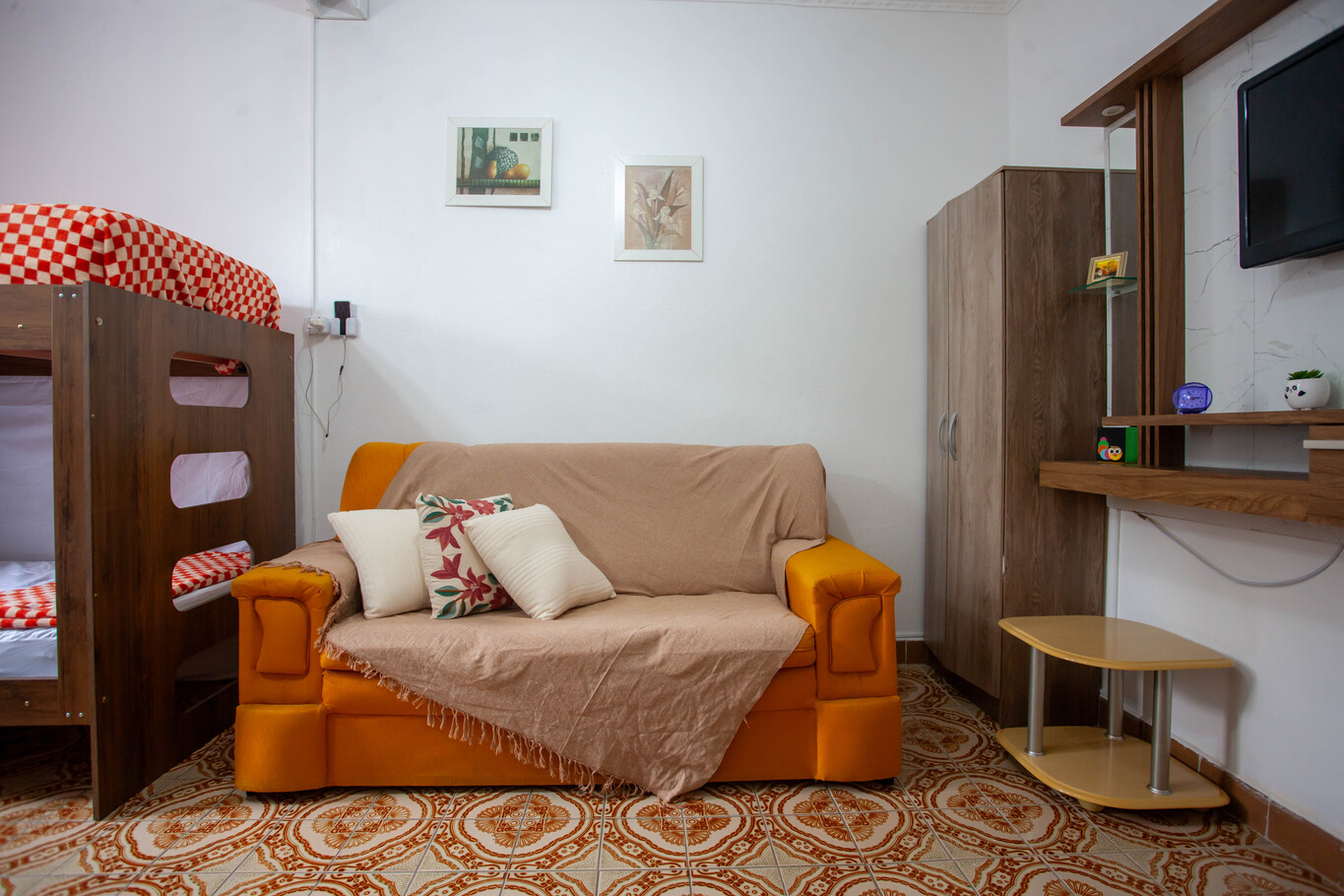- La sala es muy cómoda y está integrada con el dormitorio, donde encontrará un sofá-cama y un ventilador de techo