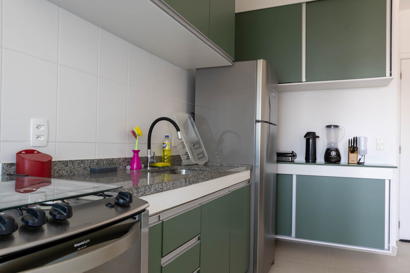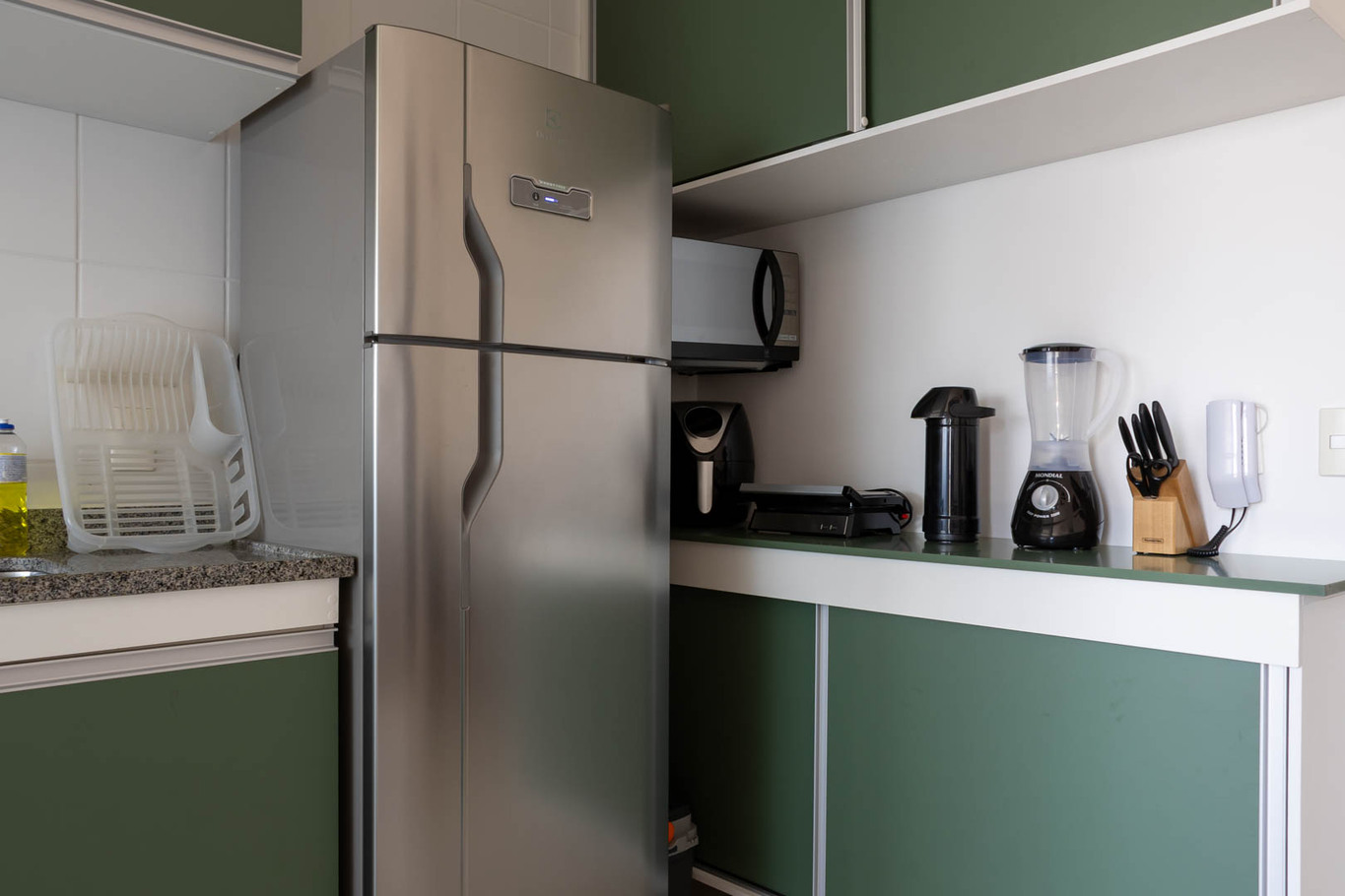- La cocina está equipada con diversos utensilios, incluyendo batidora, cocina, horno, refrigerador, licuadora, microondas, sandwichera, vasos térmicos, copas, kit de vino y kit de espumante (excepto sal, pimienta y aceite)