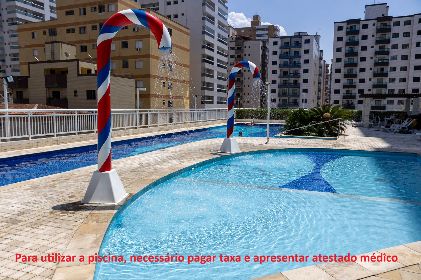 - Para usar la piscina es necesario pagar una tasa por persona (verifique el valor con nosotros) y presentar un certificado médico para el condominio, válidos por hasta 6 meses