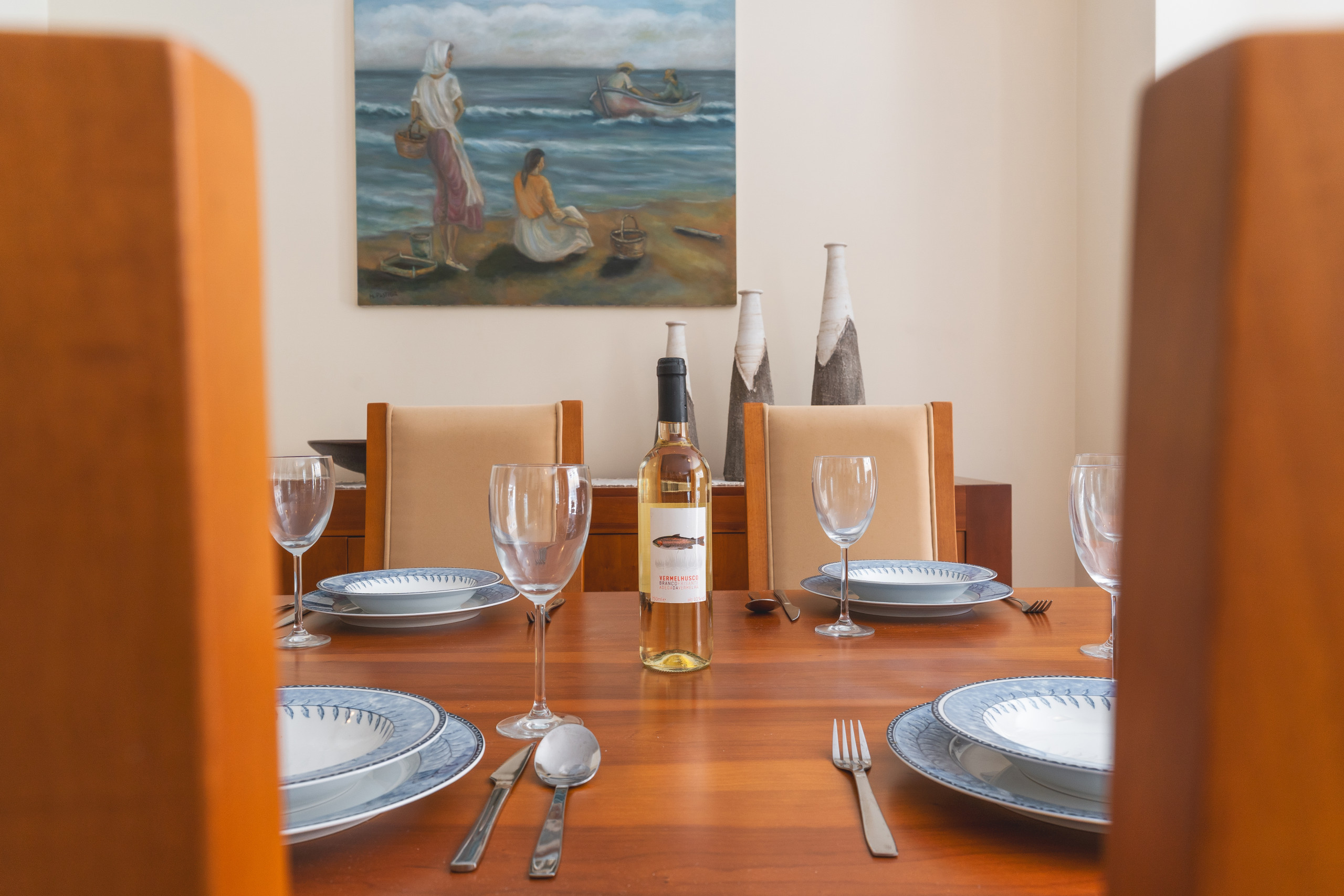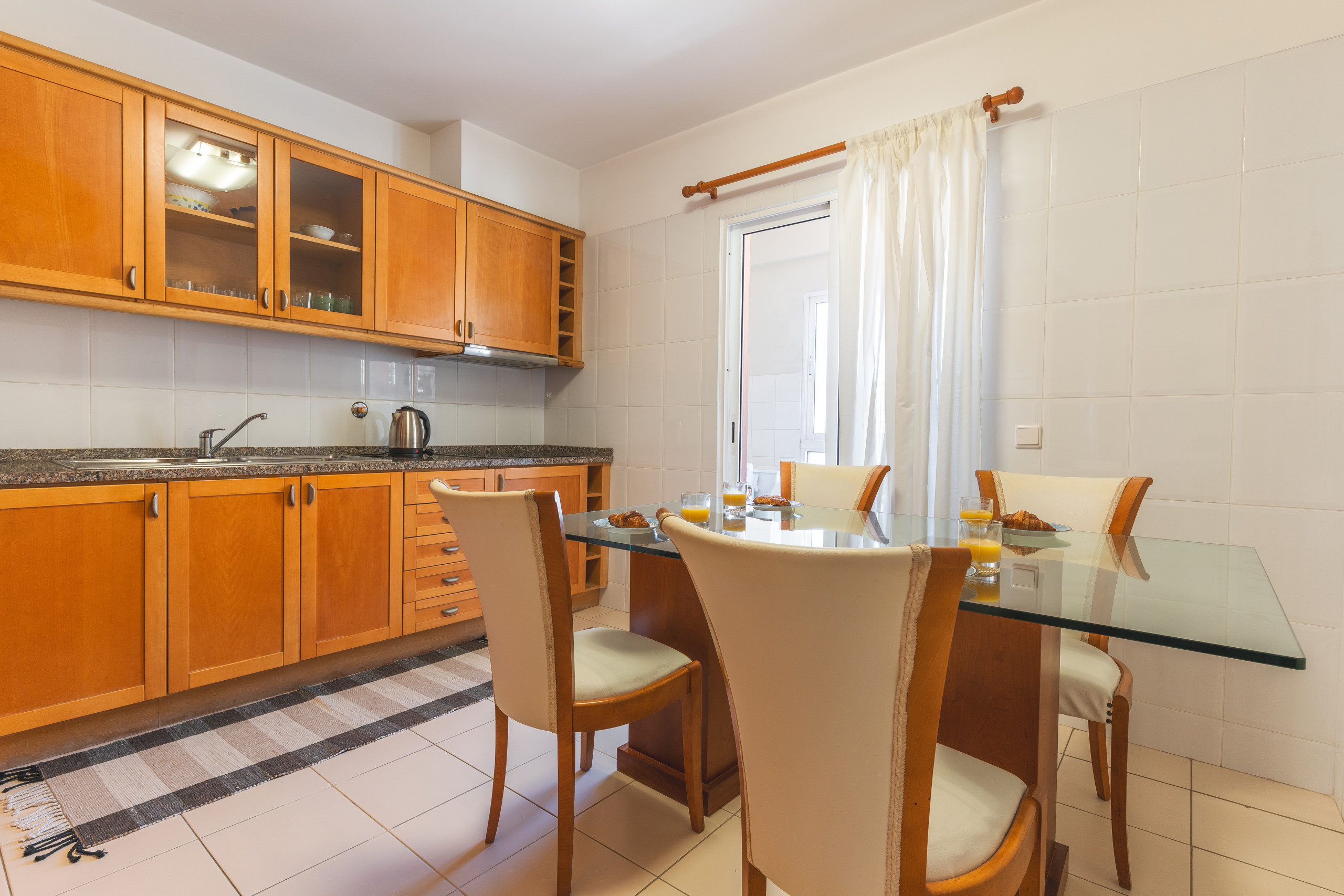 La cocina totalmente equipada incluye nevera, congelador, horno, microondas, fogones y utensilios esenciales. También hay TV inteligente con box, secador de pelo y lavadora. Para familias con niños pequeños, se puede proporcionar cuna y trona bajo petición.