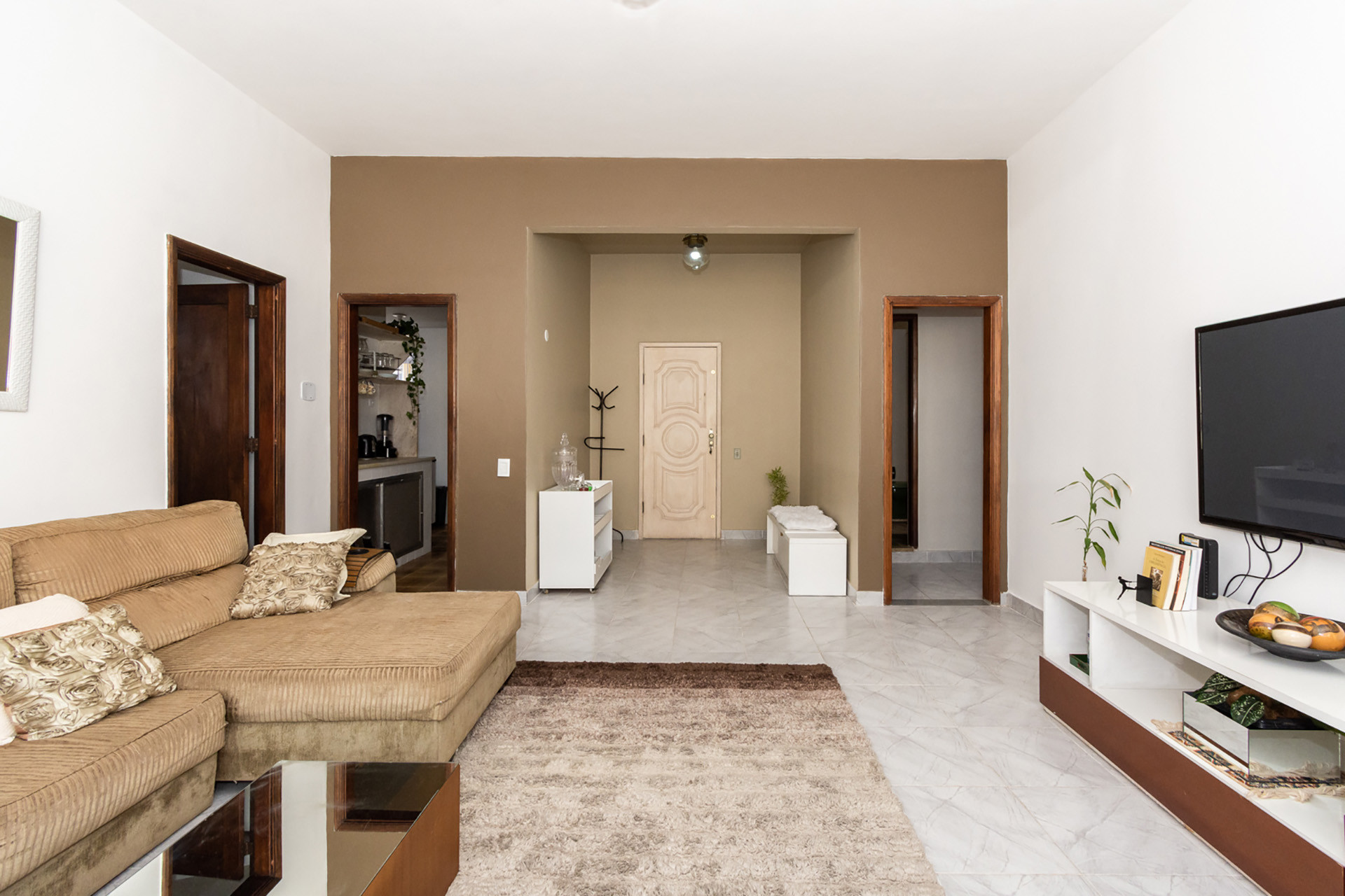 - Sala de estar com mesa de centro, mesa de jantar, sofá e TV a cabo