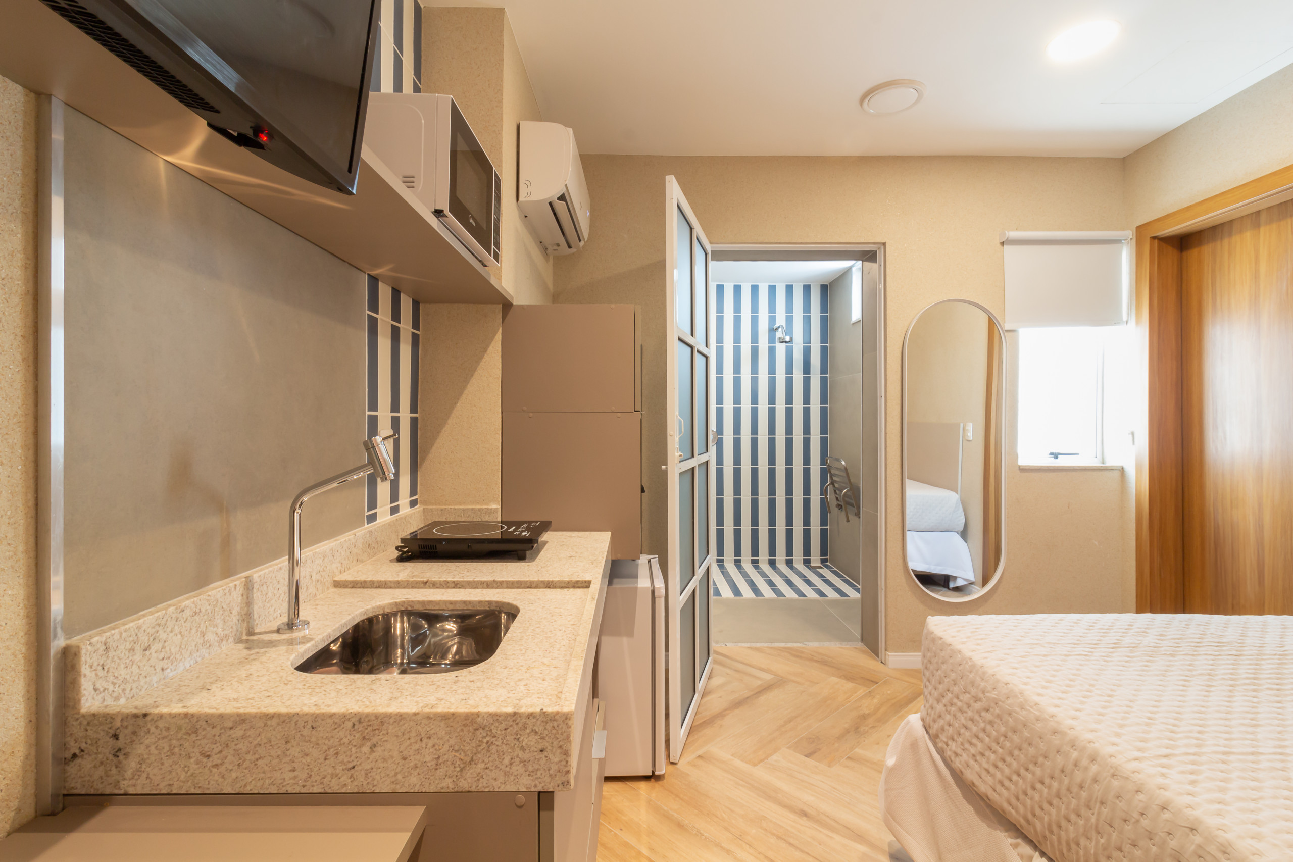 El espacio aún ofrece comodidades que van más allá de lo esperado, incluyendo un área de coworking, ideal para quienes necesitan conciliar ocio y trabajo, y un práctico mercadito inteligente, garantizando un acceso rápido a artículos esenciales sin salir del condominio. Para su conveniencia, hay también un guardarropa de 1 volumen y un vestuario, con ducha y sanitario, ambos disponibles gratuitamente para los huéspedes, además de recepción 24 horas. Todo fue pensado para proporcionarle una estancia con el máximo de comodidad, practicidad y conveniencia.