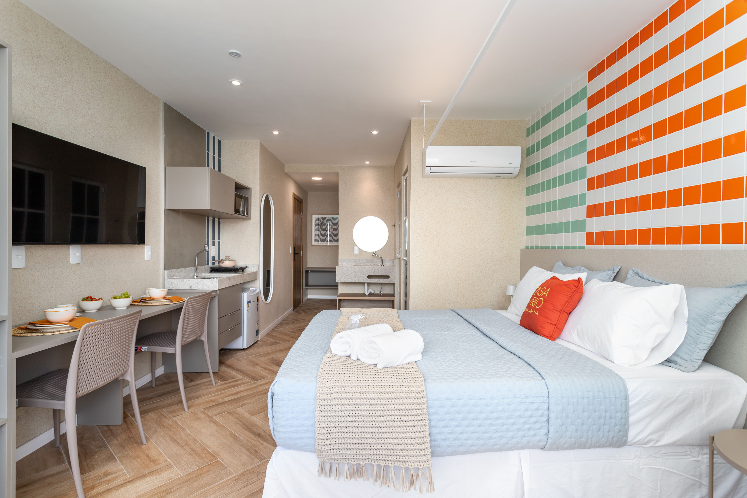 El espacio aún ofrece comodidades que van más allá de lo esperado, incluyendo un área de coworking, ideal para quienes necesitan conciliar ocio y trabajo, y un práctico mercadito inteligente, garantizando un acceso rápido a artículos esenciales sin salir del condominio. Para su conveniencia, hay también un guardarropa de 1 volumen y un vestuario, con ducha y sanitario, ambos disponibles gratuitamente para los huéspedes, además de recepción 24 horas. Todo fue pensado para proporcionarle una estancia con el máximo de comodidad, practicidad y conveniencia.