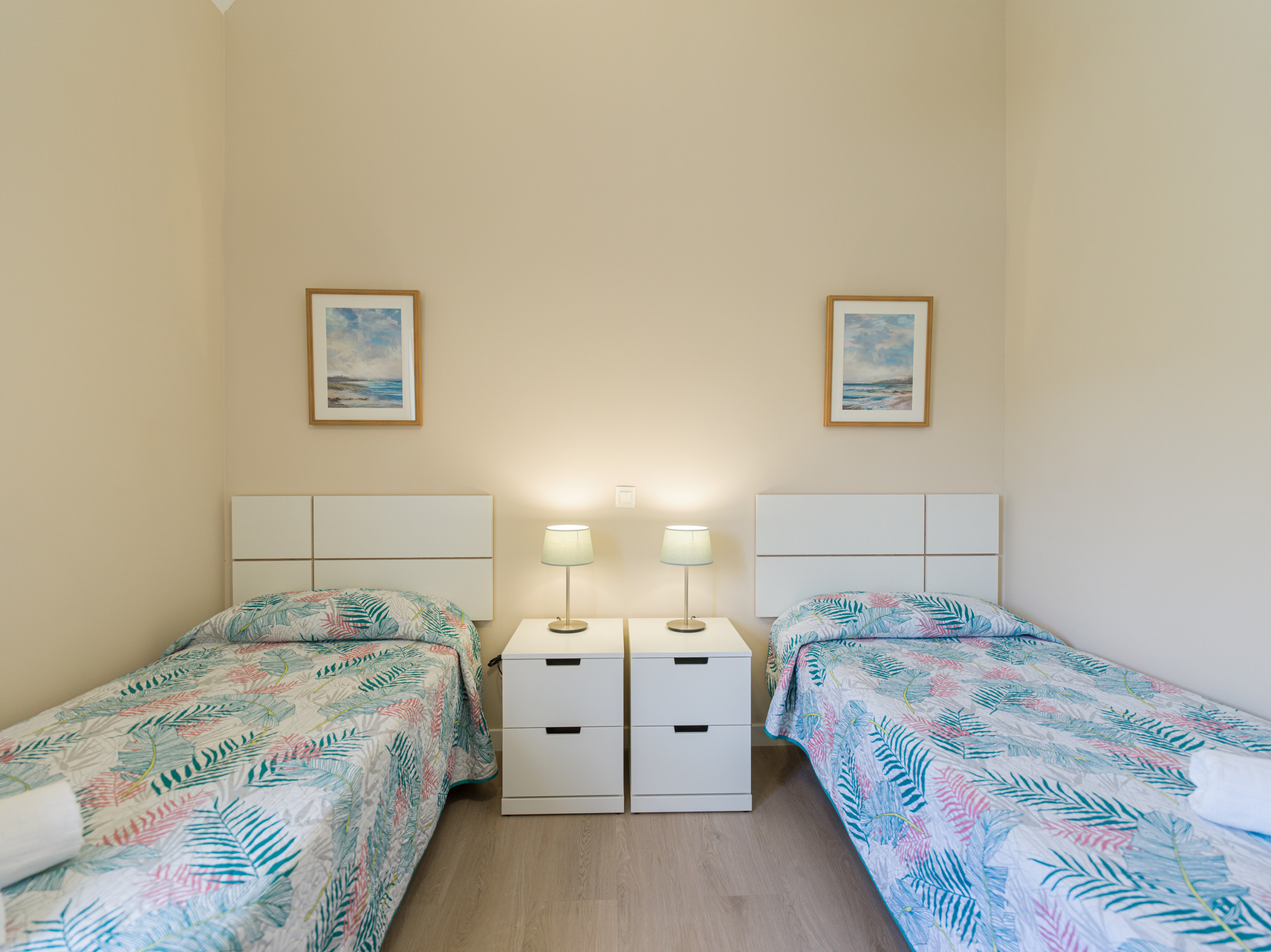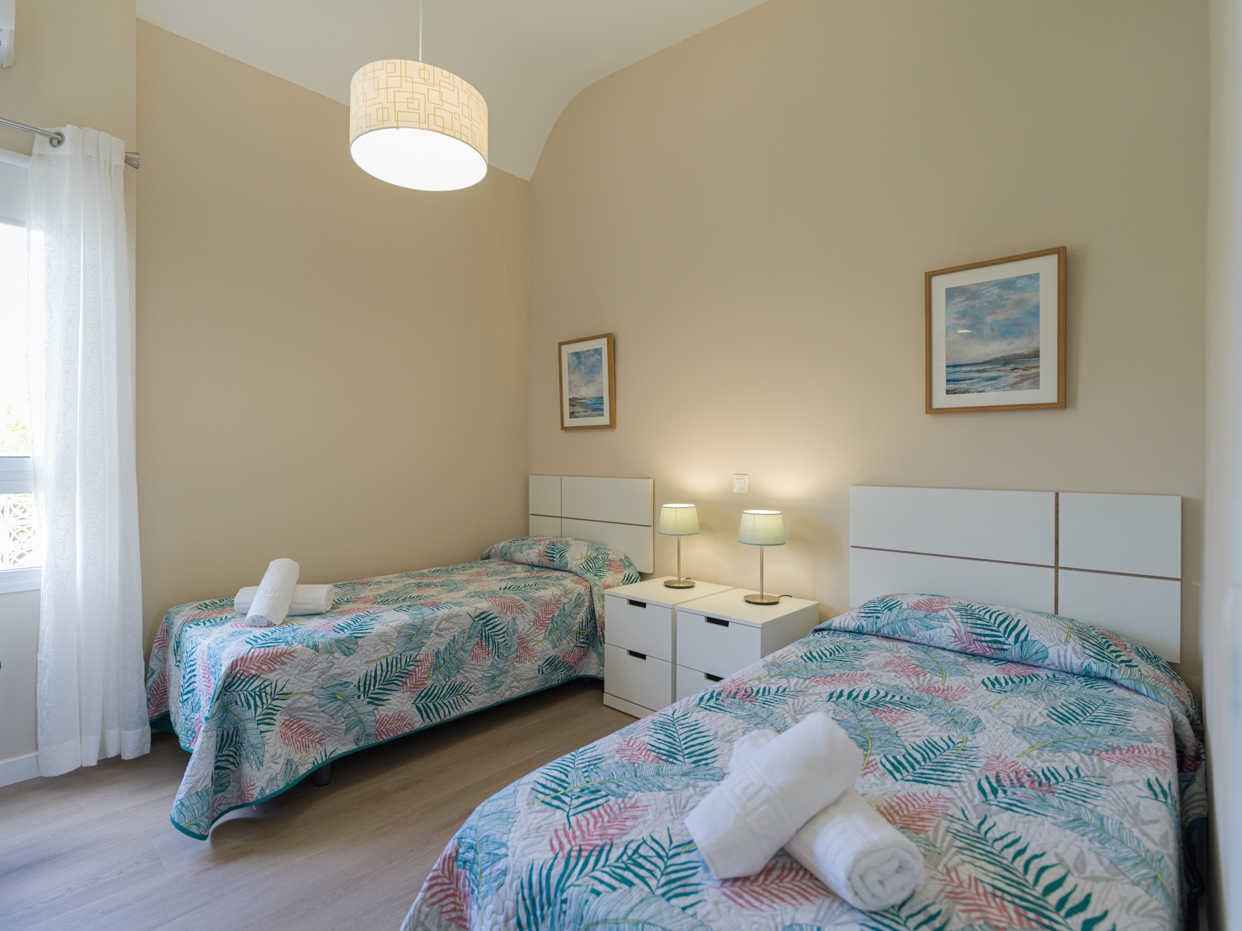 El alojamiento cuenta con una habitación con dos camas individuales y vistas al patio trasero con la piscina y un sofá cama doble en el salón.