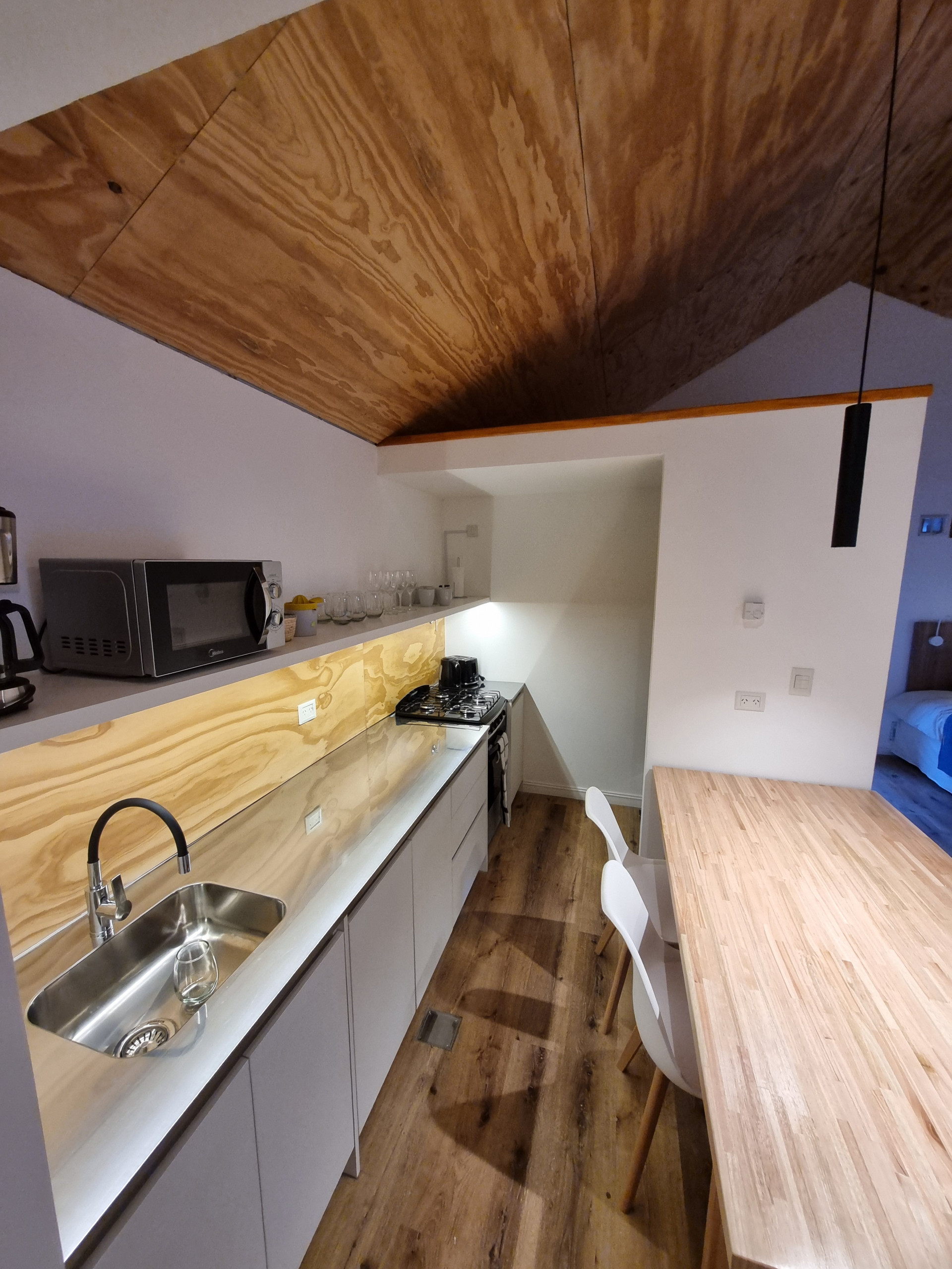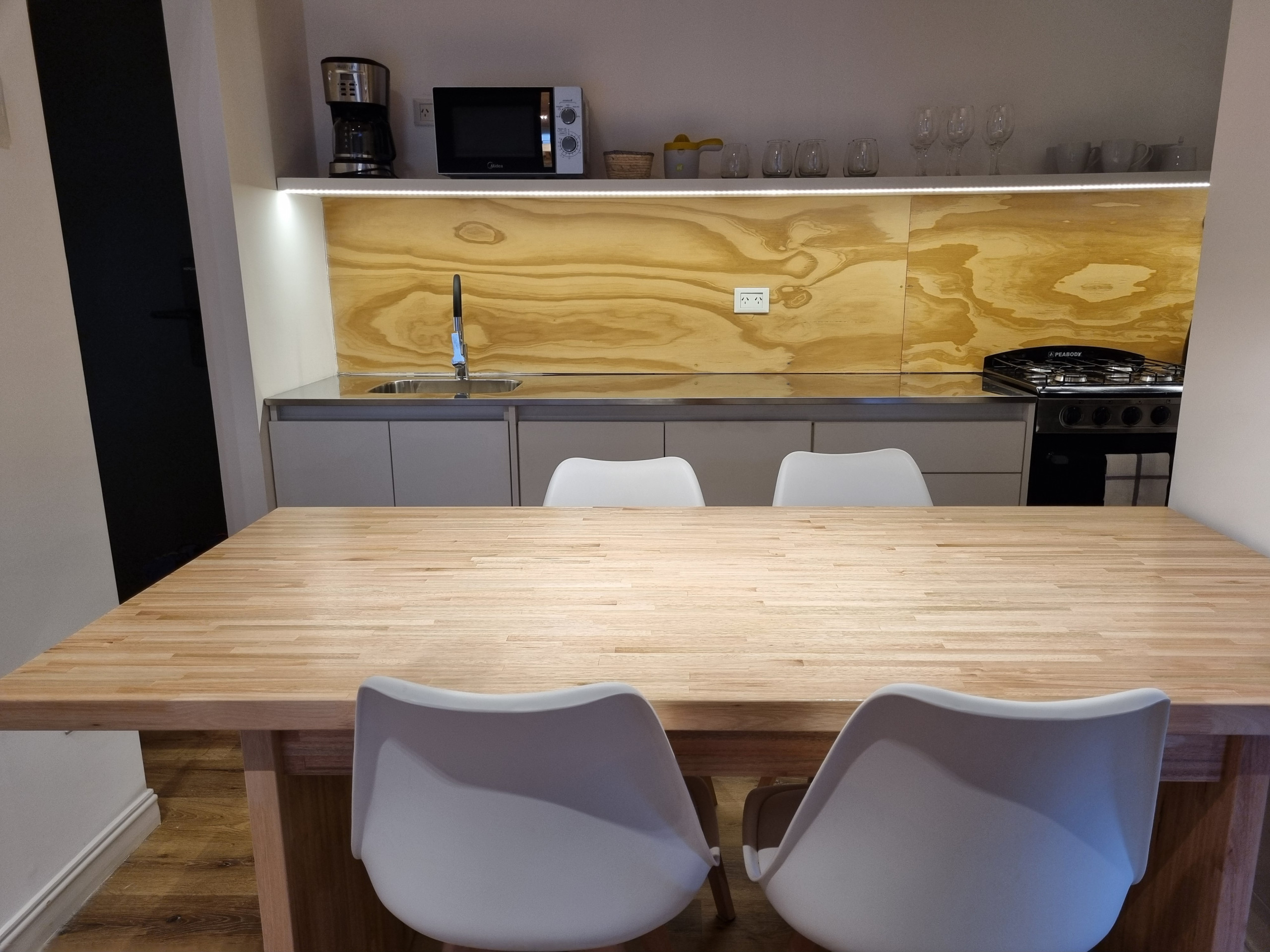 El apartamento dispone de dos baños completos con ducha, ideales para prepararte después de un día de aventuras. La cocina americana está totalmente equipada con electrodomésticos de última generación, incluyendo heladera, lavadora, microondas, cafetera, tostadora y hervidor, facilitando la preparación de comidas y bebidas.