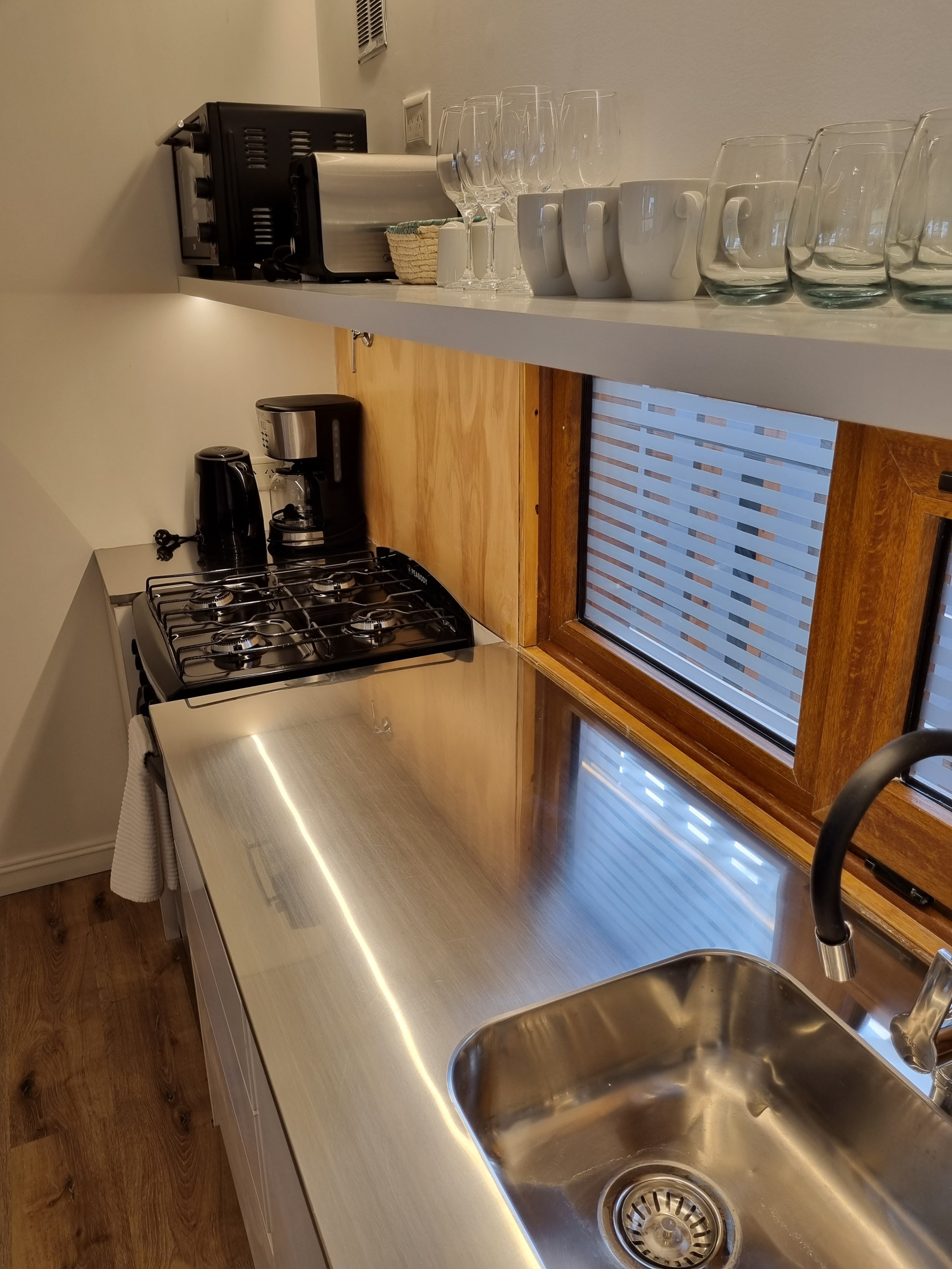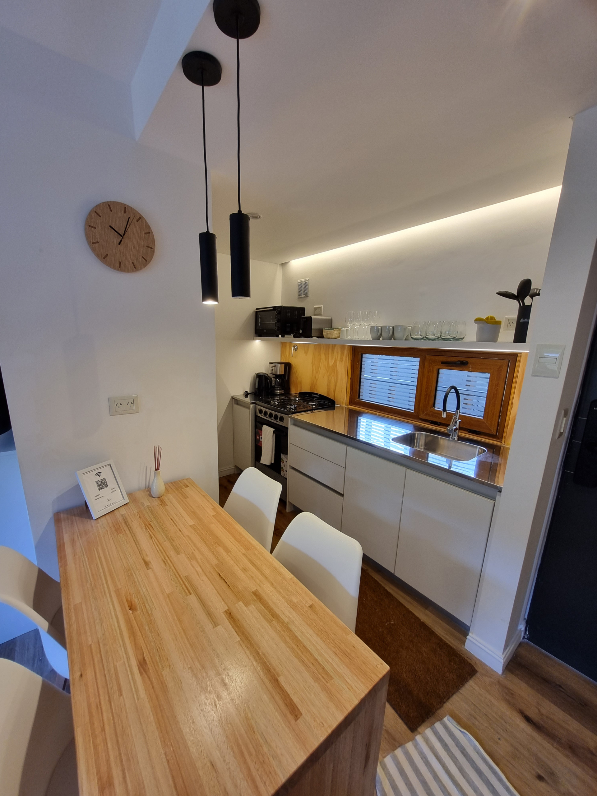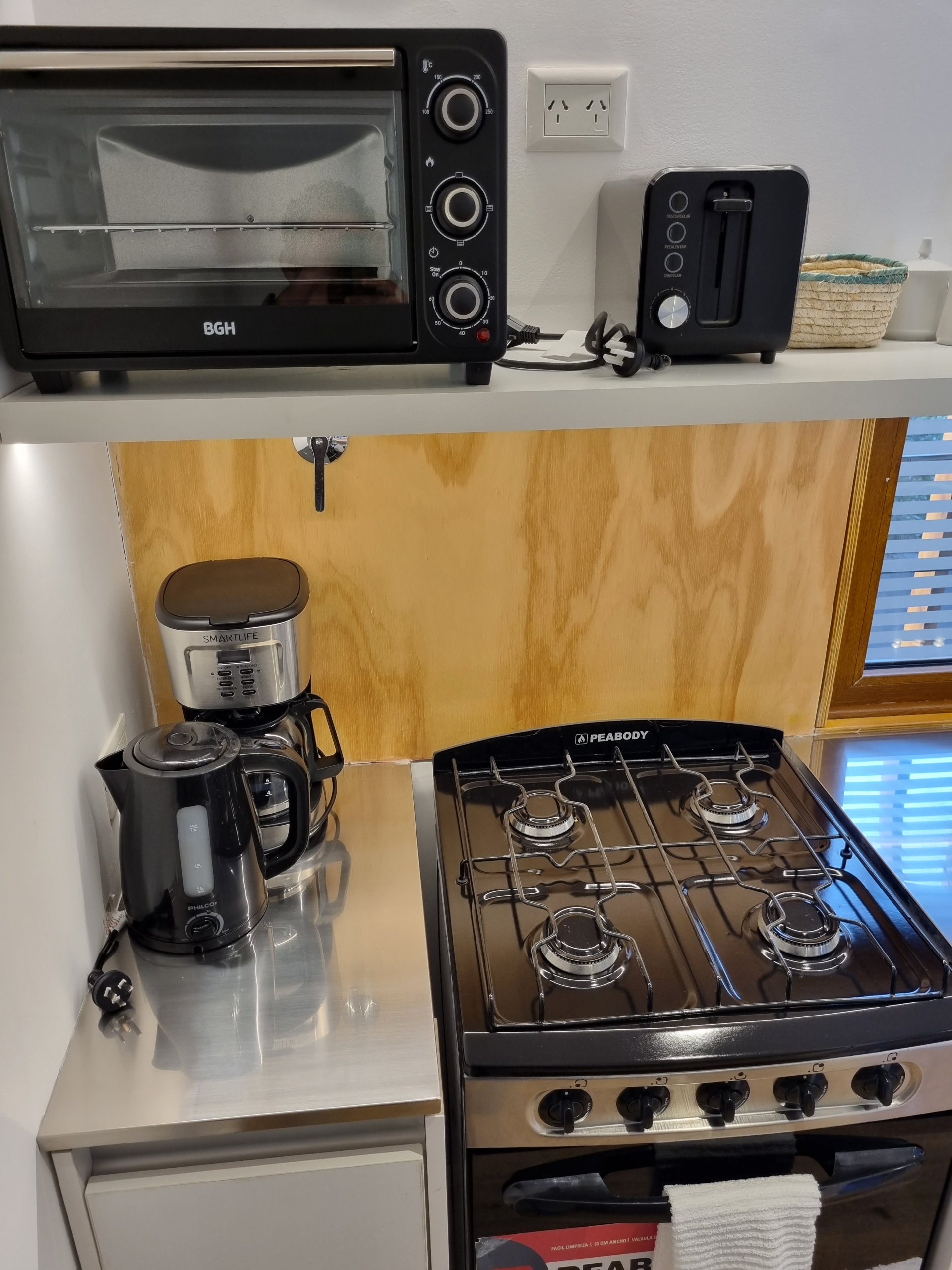 La cocina americana está totalmente equipada con electrodomésticos de última generación, incluyendo heladera, lavadora, secadora, cafetera, microondas, tostadora, hervidor eléctrico y una completa dotación de utensilios de cocina. Podrás preparar deliciosas comidas con total facilidad.