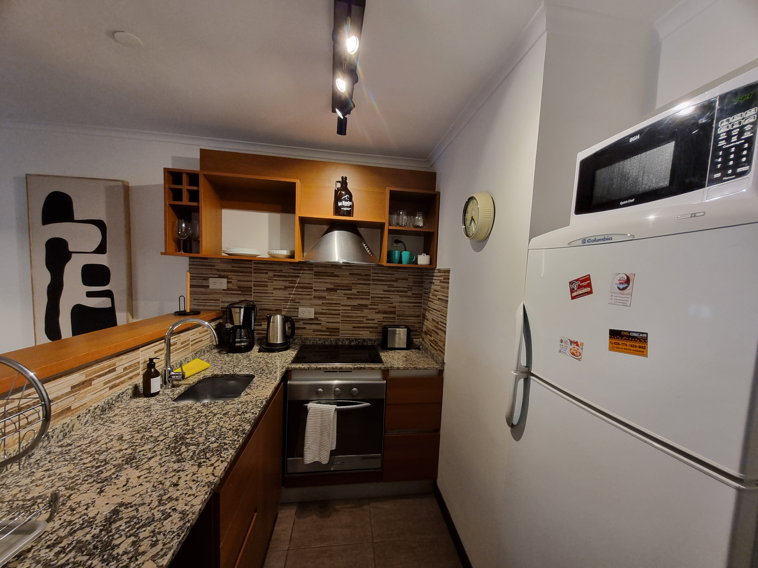 Un gran plus es su balcón y terraza, que te permitirán disfrutar de los hermosos paisajes de la zona y tomar un café mientras contemplas el entorno. La cocina americana está completamente equipada con electrodomésticos modernos como heladera, freezer, horno, microondas, cafetera, tostadora y todos los utensilios necesarios para preparar deliciosas comidas.