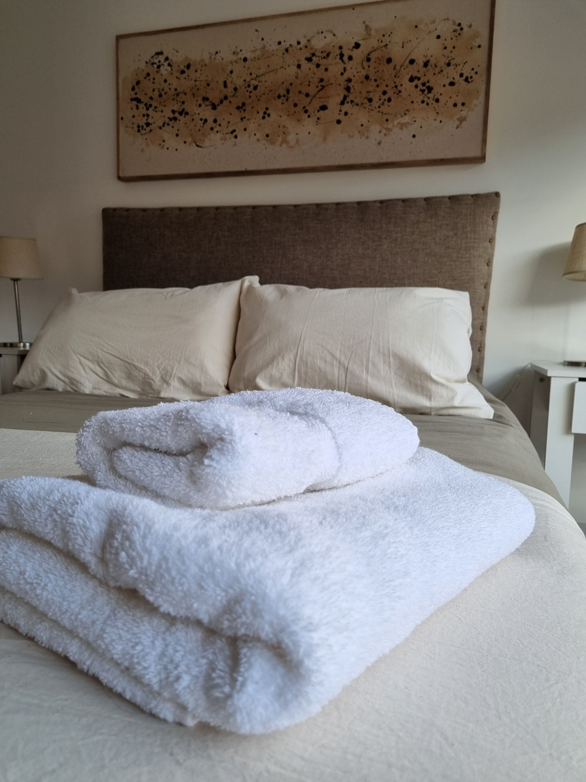 El apartamento cuenta con dos dormitorios que ofrecen un espacio versátil para descansar: una habitación principal con una cama matrimonial y otra con dos camas individuales, ideal para niños o amigos. La distribución permite privacidad y comodidad para todos los huéspedes.