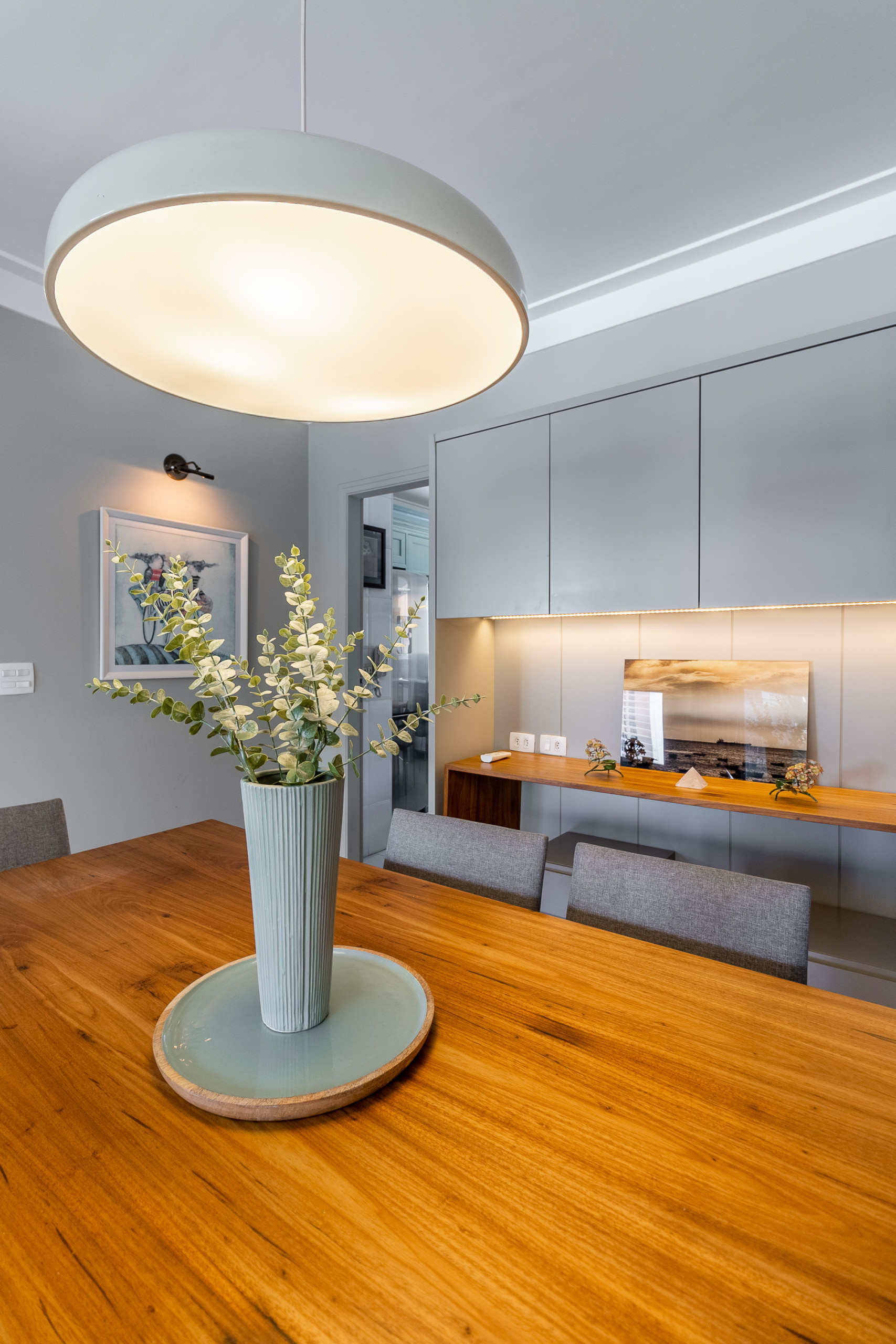 - Cocina equipada con horno y estufa, refrigerador, lavavajillas, cafetera Nespresso, microondas, licuadora, sandwichera y gabinetes personalizados