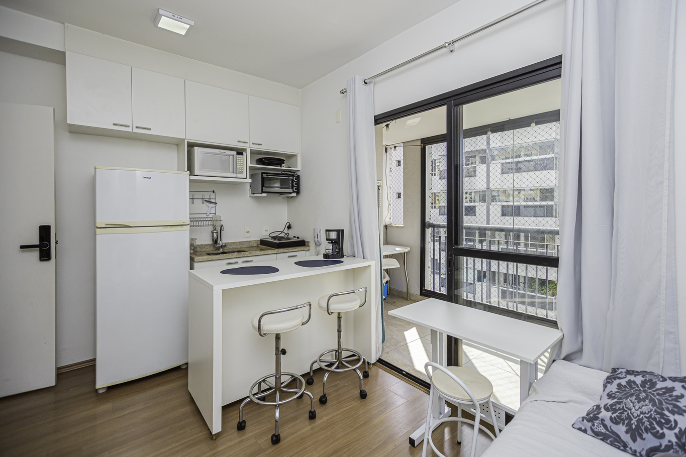 - La cocina está equipada con cocina eléctrica de 2 fuegos, horno eléctrico, refrigerador, microondas, cafetera, sandwichera, licuadora, tostadora, mostrador funcional y otros utensilios (excepto aceite y sal)