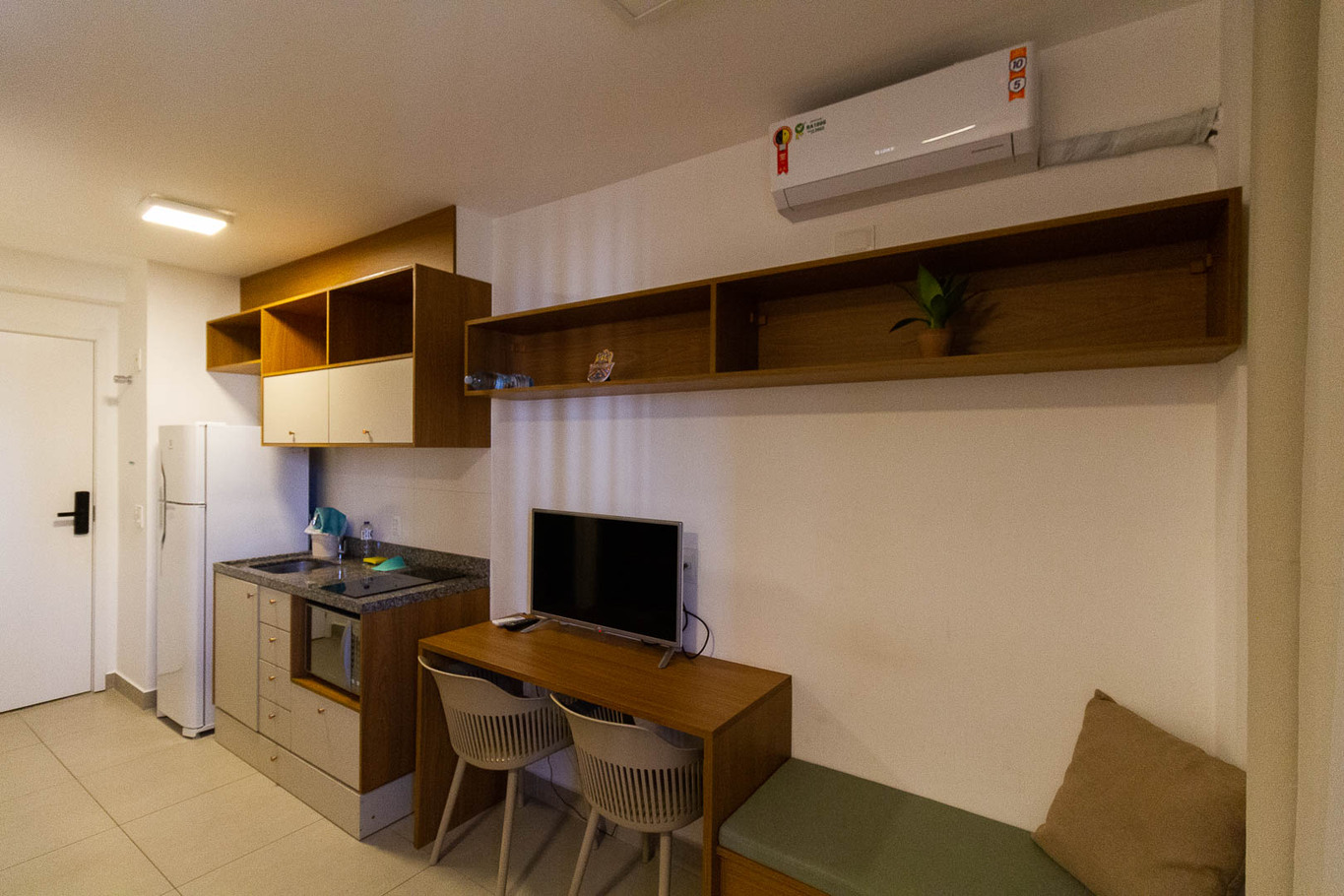 - Estudio con cama, mostrador multifuncional con 4 sillas, cama de matrimonio y aire acondicionado